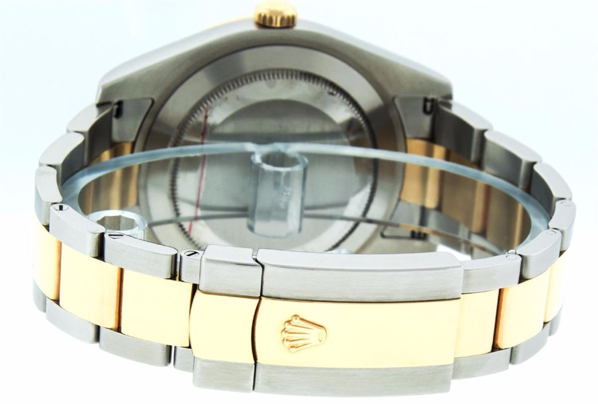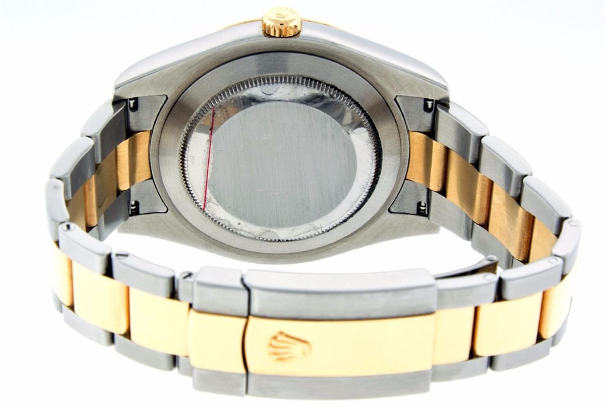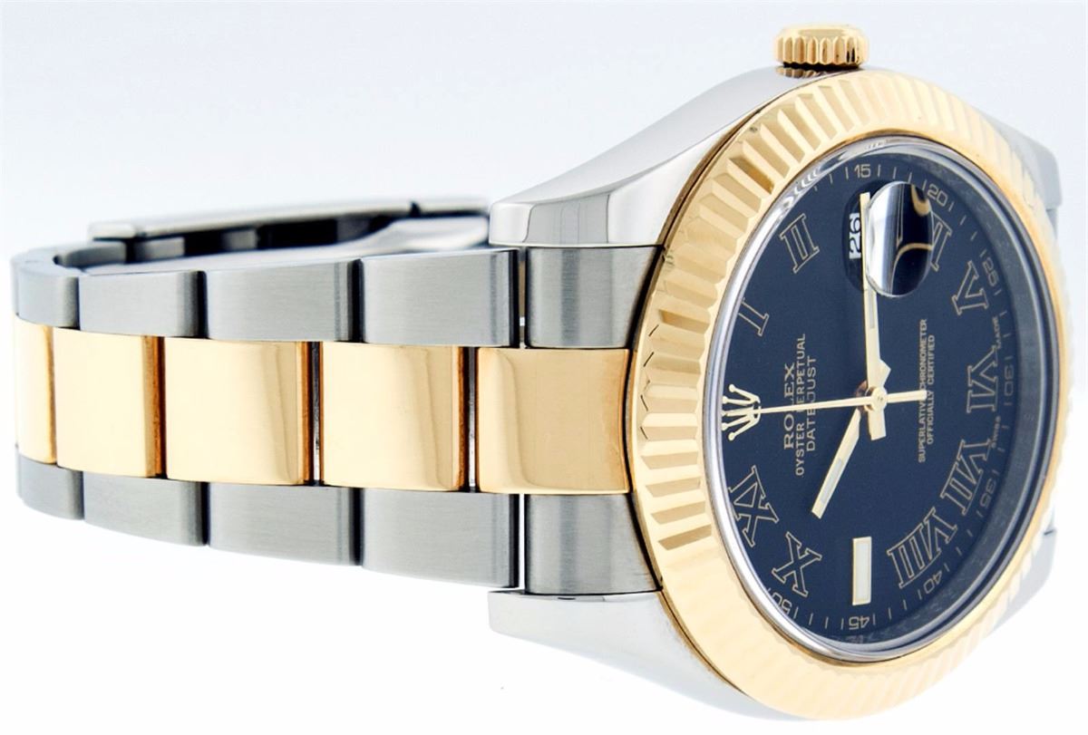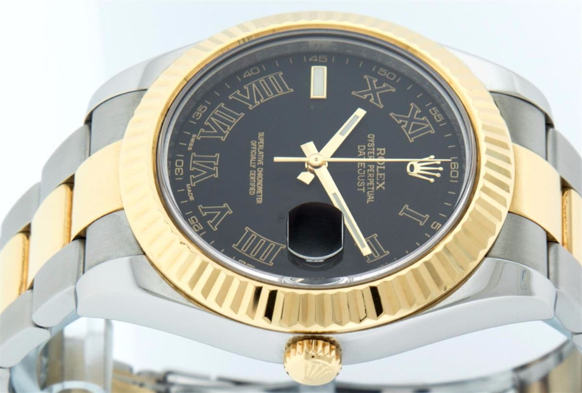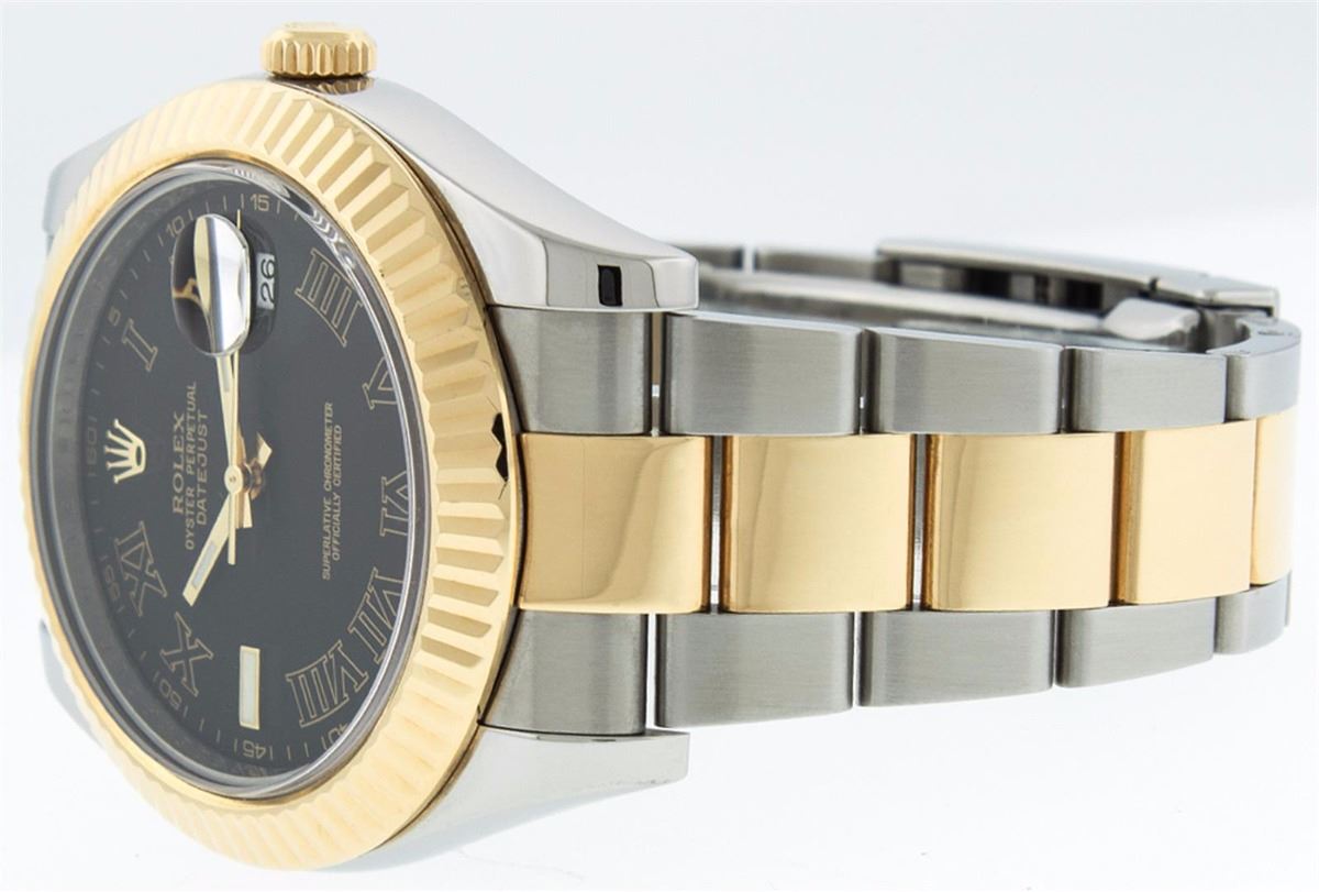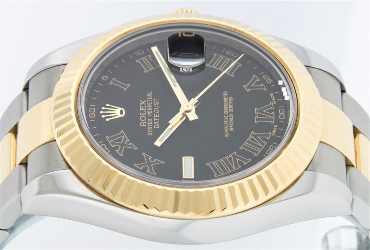 One Mens Rolex Datejust 2 Polished Bright with Satin Finish, Serviced & Electronically Tested, Stainless Steel Case:41mm, 18K Yellow Gold Crown, Bezel: 18K Yellow Gold Fluted Bezel. Crystal: Synthetic Sapphire Cyclops Lens. Movement: Automatic Winding Movement Caliber 3136. Dial: Black Roman Dial. Date Window: 3 O'Clock Position Date Display, Quickset, Model: 116233 Datejust 2. Condition: G-6 Extra Fine. Bracelet: 18K Yellow Gold & Stainless Steel Oyster Band. Bright Polish & Satin Finish. 7.5 Inch Length, Adjustable. Standard Clasp, With Rolex Logo. Comes with a 6 month warranty card.