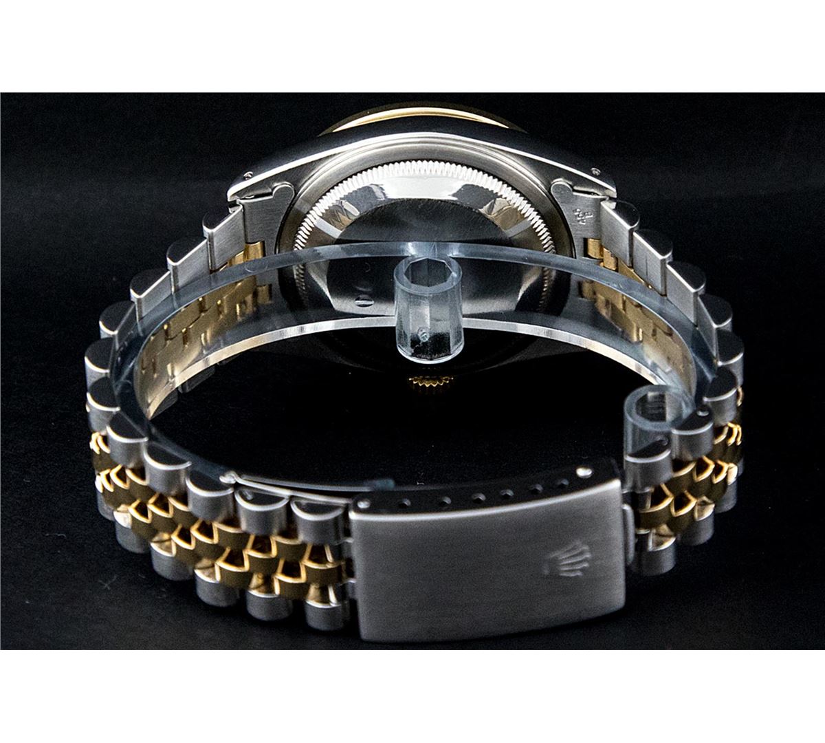 One Mens Two Tone Rolex Datejust Polished, Serviced & Electronically Tested, 14K Yellow Gold & Stainless Steel Case:36mm, 14K Yellow Gold Crown, Custom Bezel: 18K Yellow Gold Beadset Diamond Bezel, Diamond Count: 44 Diamonds, Total Weight 1.00 Carat, Clarity: Si-VS, Color: G to H. Custom Crystal: Synthetic Sapphire Cyclops Lens. Movement: Automatic Winding Movement Caliber 3035. Custom Dial: Black String Diamond Dial, Diamond Count: 58 Diamonds in Dial G To H In Color, VVS In Clarity. Date Window: 3 O'Clock Position Date Display, Quickset, Model: 16013 Condition: G-6 Extra Fine. Bracelet: Two Tone 14K Yellow Gold & Stainless Steel Jubilee. Bright Polish. 7.0 Inch Length, Adjustable. Standard Clasp, With Rolex Logo.