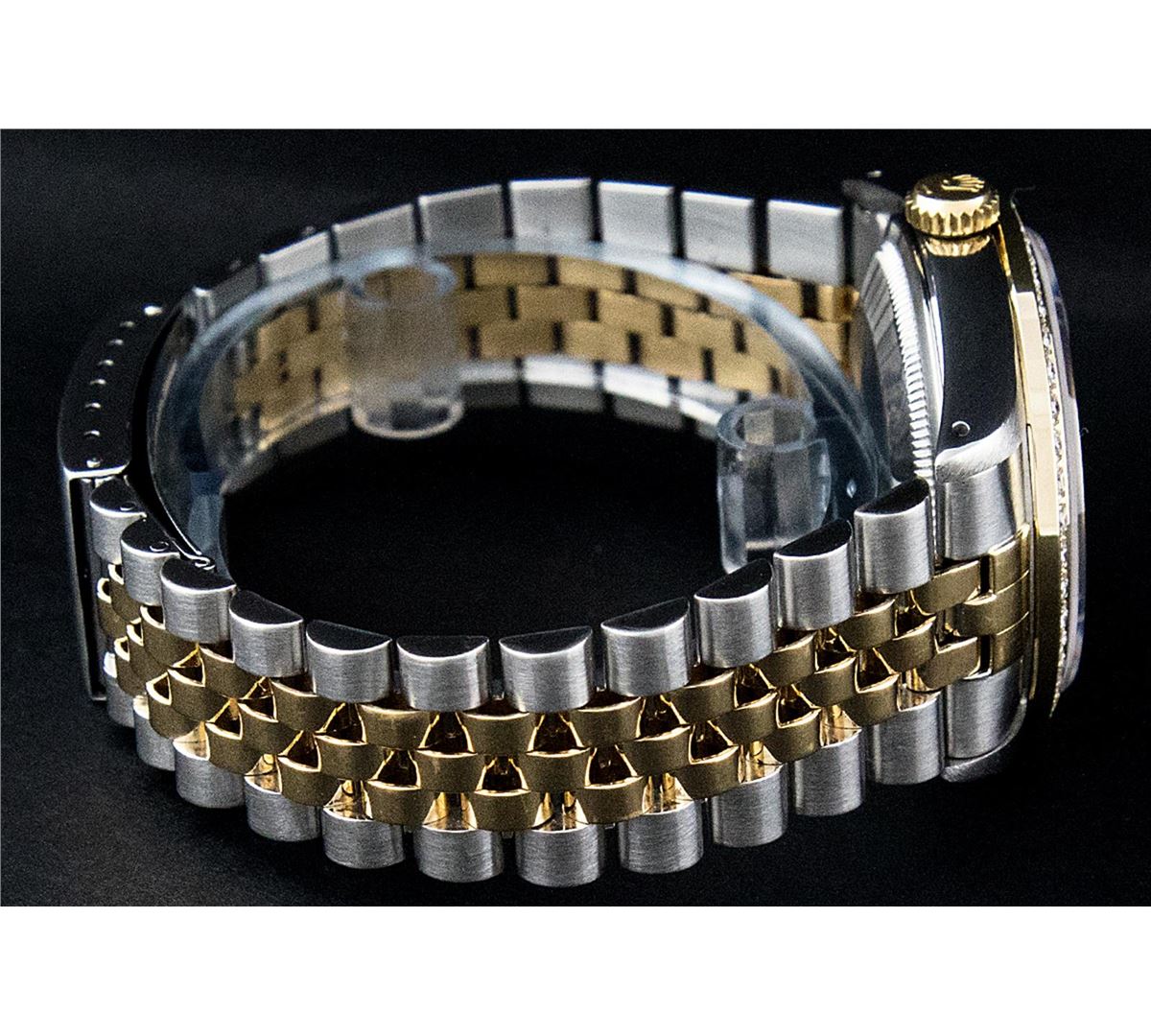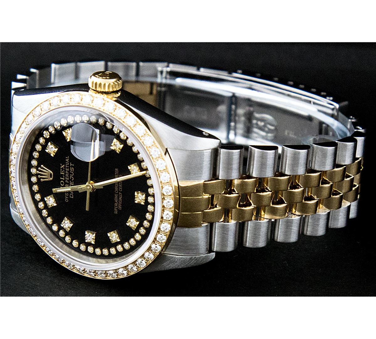 One Mens Two Tone Rolex Datejust Polished, Serviced & Electronically Tested, 14K Yellow Gold & Stainless Steel Case:36mm, 14K Yellow Gold Crown, Custom Bezel: 18K Yellow Gold Beadset Diamond Bezel, Diamond Count: 44 Diamonds, Total Weight 1.00 Carat, Clarity: Si-VS, Color: G to H. Custom Crystal: Synthetic Sapphire Cyclops Lens. Movement: Automatic Winding Movement Caliber 3035. Custom Dial: Black String Diamond Dial, Diamond Count: 58 Diamonds in Dial G To H In Color, VVS In Clarity. Date Window: 3 O'Clock Position Date Display, Quickset, Model: 16013 Condition: G-6 Extra Fine. Bracelet: Two Tone 14K Yellow Gold & Stainless Steel Jubilee. Bright Polish. 7.0 Inch Length, Adjustable. Standard Clasp, With Rolex Logo.