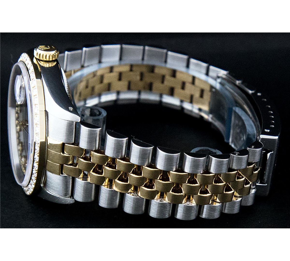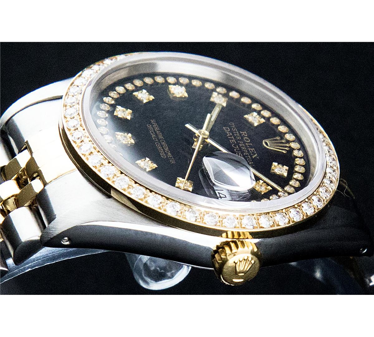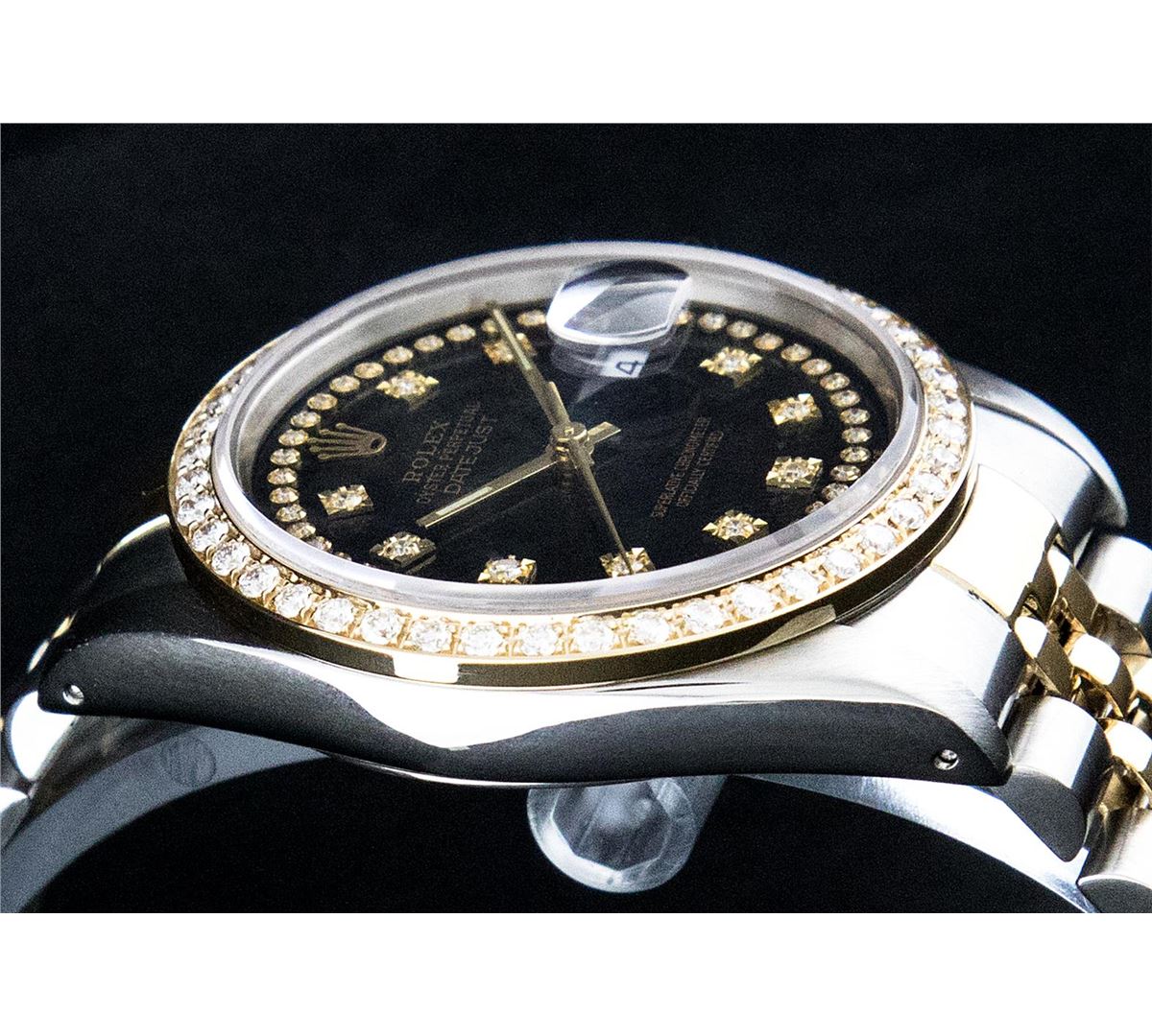 One Mens Two Tone Rolex Datejust Polished, Serviced & Electronically Tested, 14K Yellow Gold & Stainless Steel Case:36mm, 14K Yellow Gold Crown, Custom Bezel: 18K Yellow Gold Beadset Diamond Bezel, Diamond Count: 44 Diamonds, Total Weight 1.00 Carat, Clarity: Si-VS, Color: G to H. Custom Crystal: Synthetic Sapphire Cyclops Lens. Movement: Automatic Winding Movement Caliber 3035. Custom Dial: Black String Diamond Dial, Diamond Count: 58 Diamonds in Dial G To H In Color, VVS In Clarity. Date Window: 3 O'Clock Position Date Display, Quickset, Model: 16013 Condition: G-6 Extra Fine. Bracelet: Two Tone 14K Yellow Gold & Stainless Steel Jubilee. Bright Polish. 7.0 Inch Length, Adjustable. Standard Clasp, With Rolex Logo.