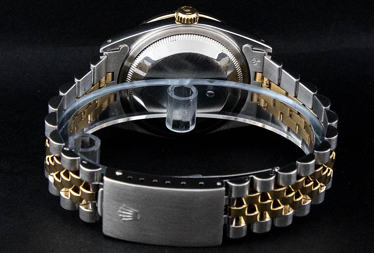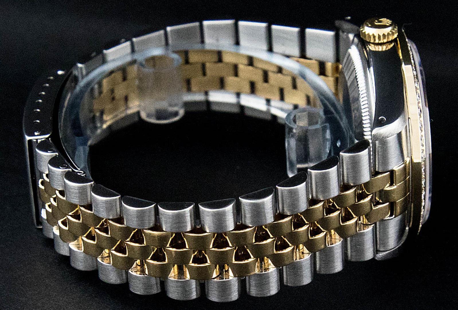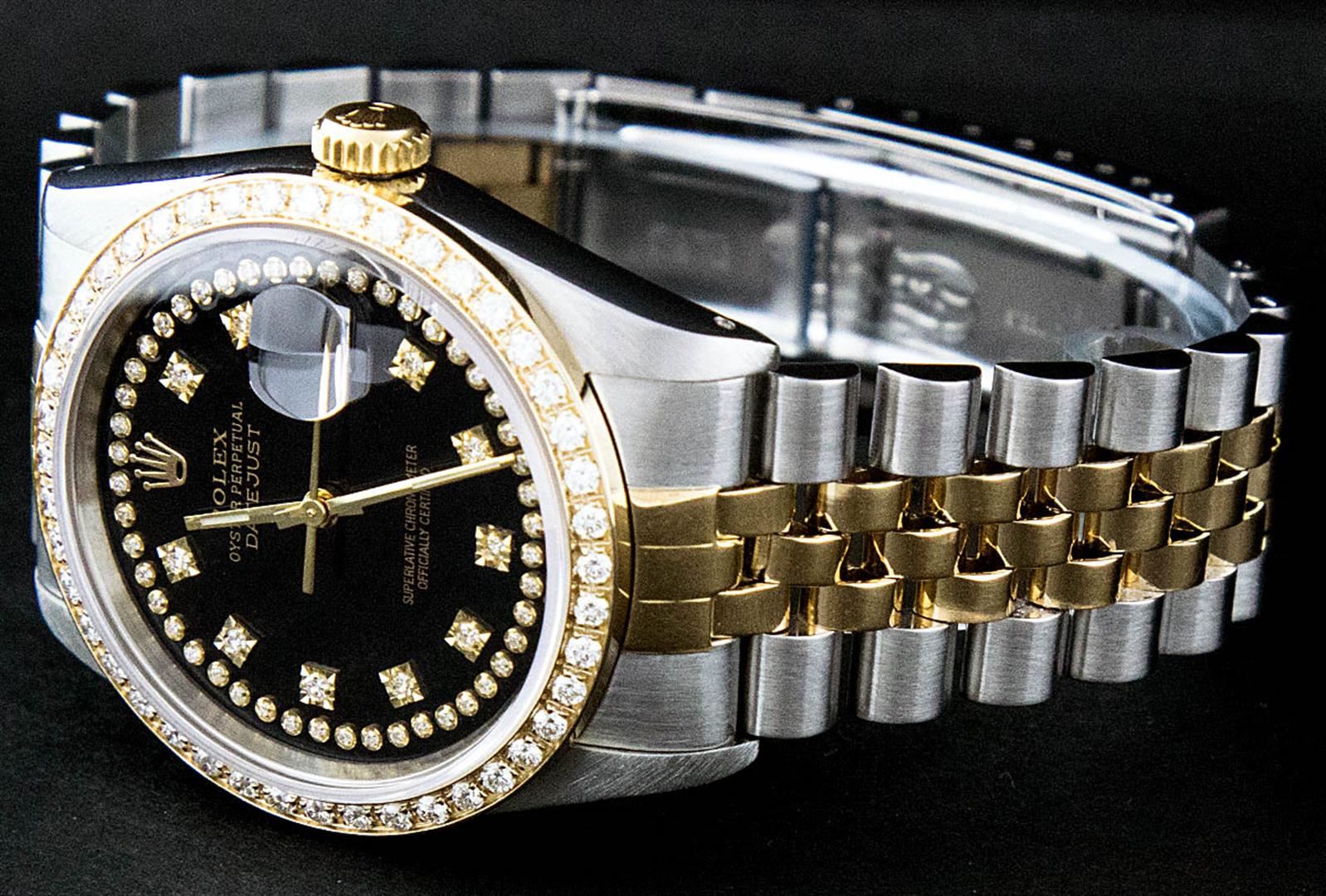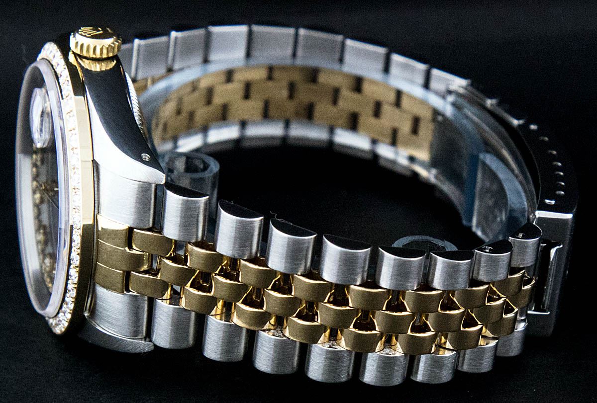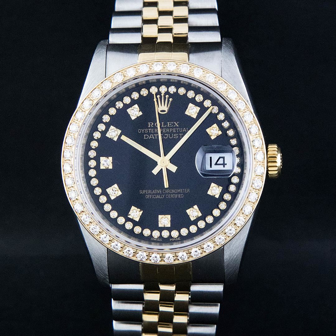 One Mens Two Tone Rolex Datejust Polished, Serviced & Electronically Tested, 14K Yellow Gold & Stainless Steel Case:36mm, 14K Yellow Gold Crown, Custom Bezel: 18K Yellow Gold Beadset Diamond Bezel, Diamond Count: 44 Diamonds, Total Weight 1.00 Carat, Clarity: Si-VS, Color: G to H. Custom Crystal: Synthetic Sapphire Cyclops Lens. Movement: Automatic Winding Movement Caliber 3035. Custom Dial: Black String Diamond Dial, Diamond Count: 58 Diamonds in Dial G To H In Color, VVS In Clarity. Date Window: 3 O'Clock Position Date Display, Quickset, Model: 16013 Condition: G-6 Extra Fine. Bracelet: Two Tone 14K Yellow Gold & Stainless Steel Jubilee. Bright Polish. 7.0 Inch Length, Adjustable. Standard Clasp, With Rolex Logo.