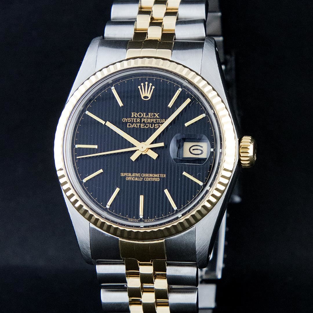 One Gents Two Tone Rolex Datejust Polished, Serviced & Electronically Tested, 14K Yellow Gold & Stainless Steel Case:36mm, 14K Yellow Gold Crown, Bezel: 14K Yellow Gold Fluted Bezel. Custom Crystal: Acrylic Cyclops Lens. Movement: Automatic Winding Movement Caliber 3035. Dial: Black Tapestry Index With Luminescent Dots. Date Window: 3 O'Clock Position Date Display, Quickset, Model: 16013 Condition: G-6 Extra Fine. Bracelet: Two Tone 14K Yellow Gold & Stainless Steel Jubilee. Bright Polish. 6.5 Inch Length, Adjustable. Standard Clasp, With Rolex Logo.