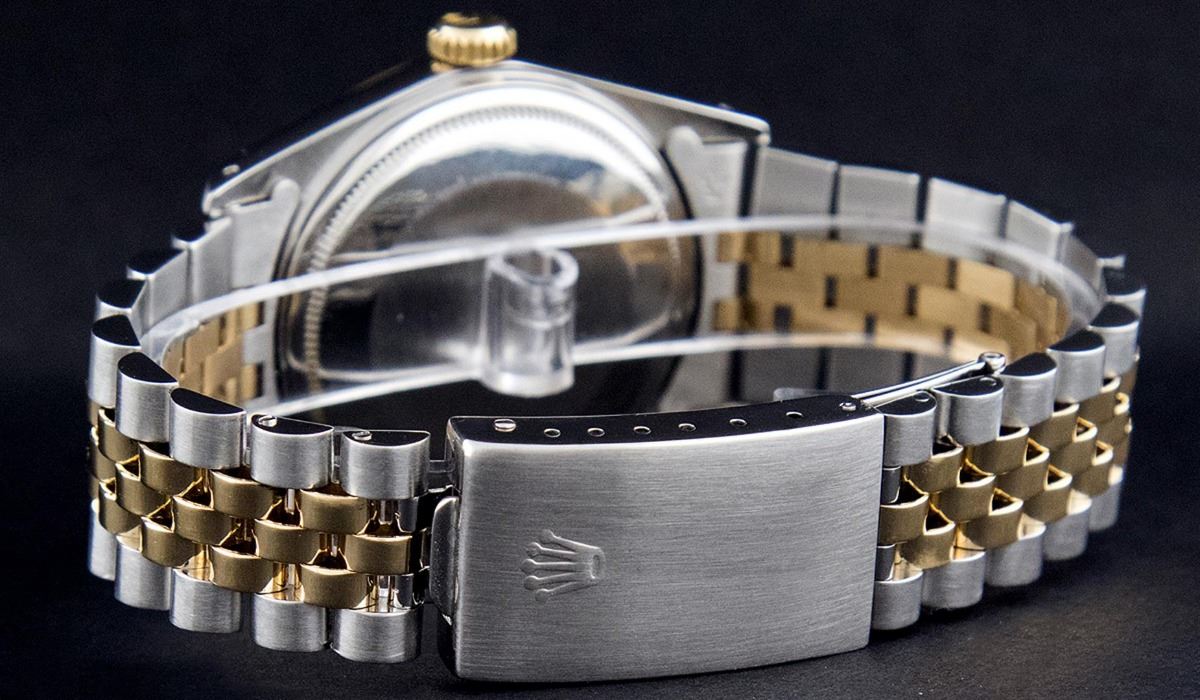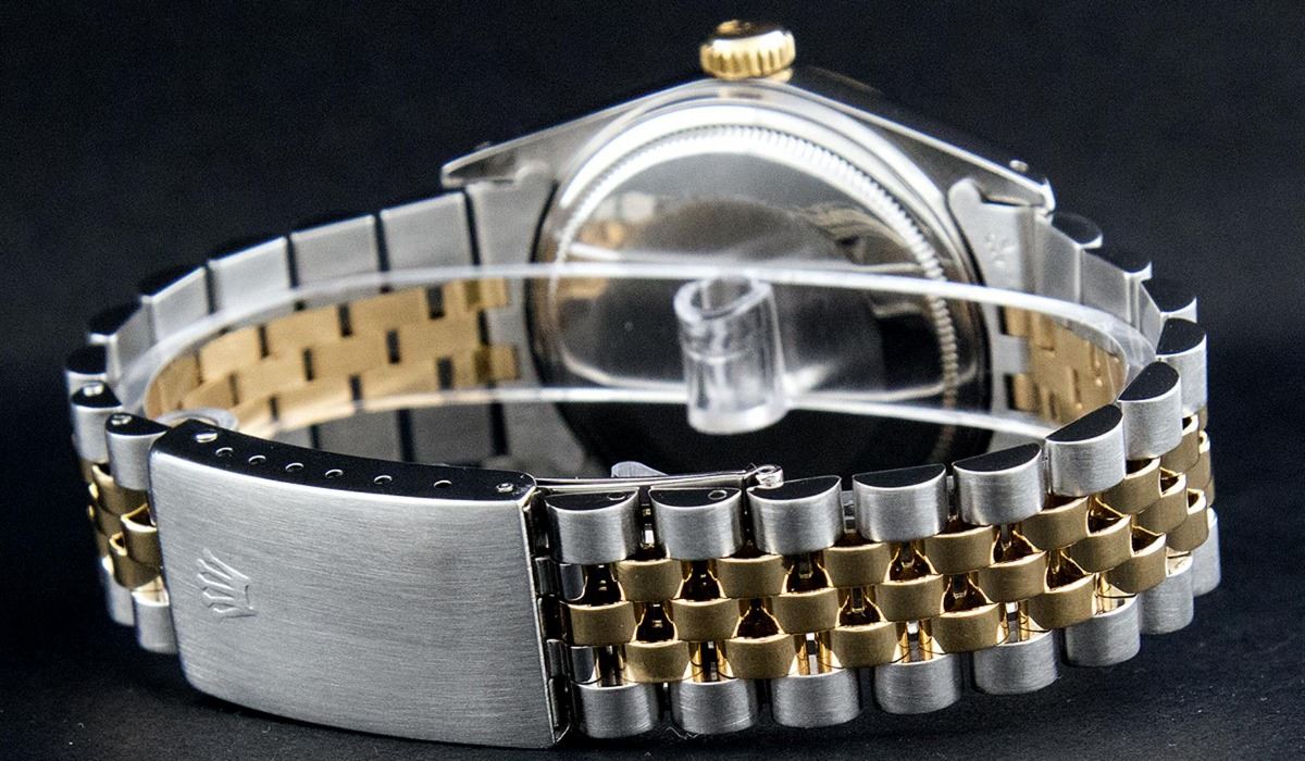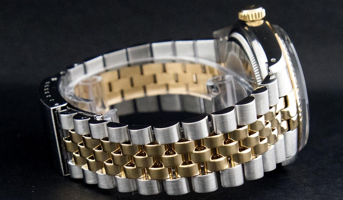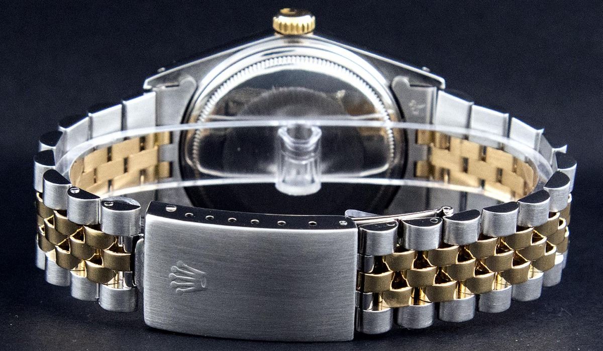 One Gents Two Tone Rolex Datejust Polished, Serviced & Electronically Tested, 14K Yellow Gold & Stainless Steel Case:36mm, 14K Yellow Gold Crown, Bezel: 14K Yellow Gold Fluted Bezel. Custom Crystal: Acrylic Cyclops Lens. Movement: Automatic Winding Movement Caliber 3035. Dial: Black Tapestry Index With Luminescent Dots. Date Window: 3 O'Clock Position Date Display, Quickset, Model: 16013 Condition: G-6 Extra Fine. Bracelet: Two Tone 14K Yellow Gold & Stainless Steel Jubilee. Bright Polish. 6.5 Inch Length, Adjustable. Standard Clasp, With Rolex Logo.