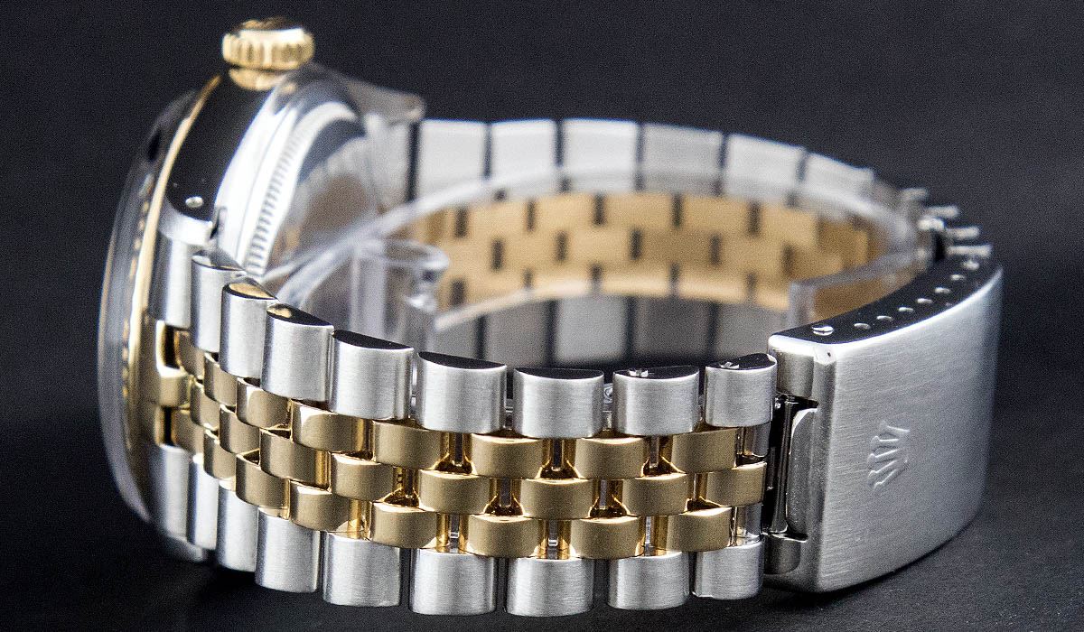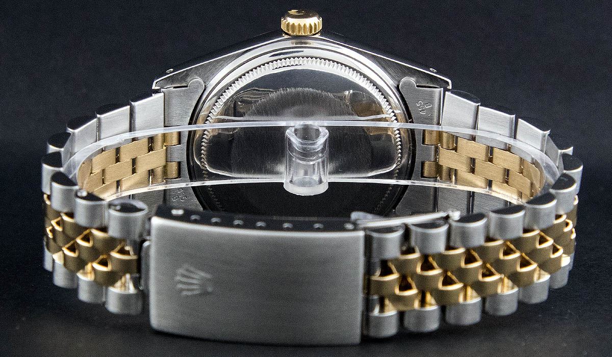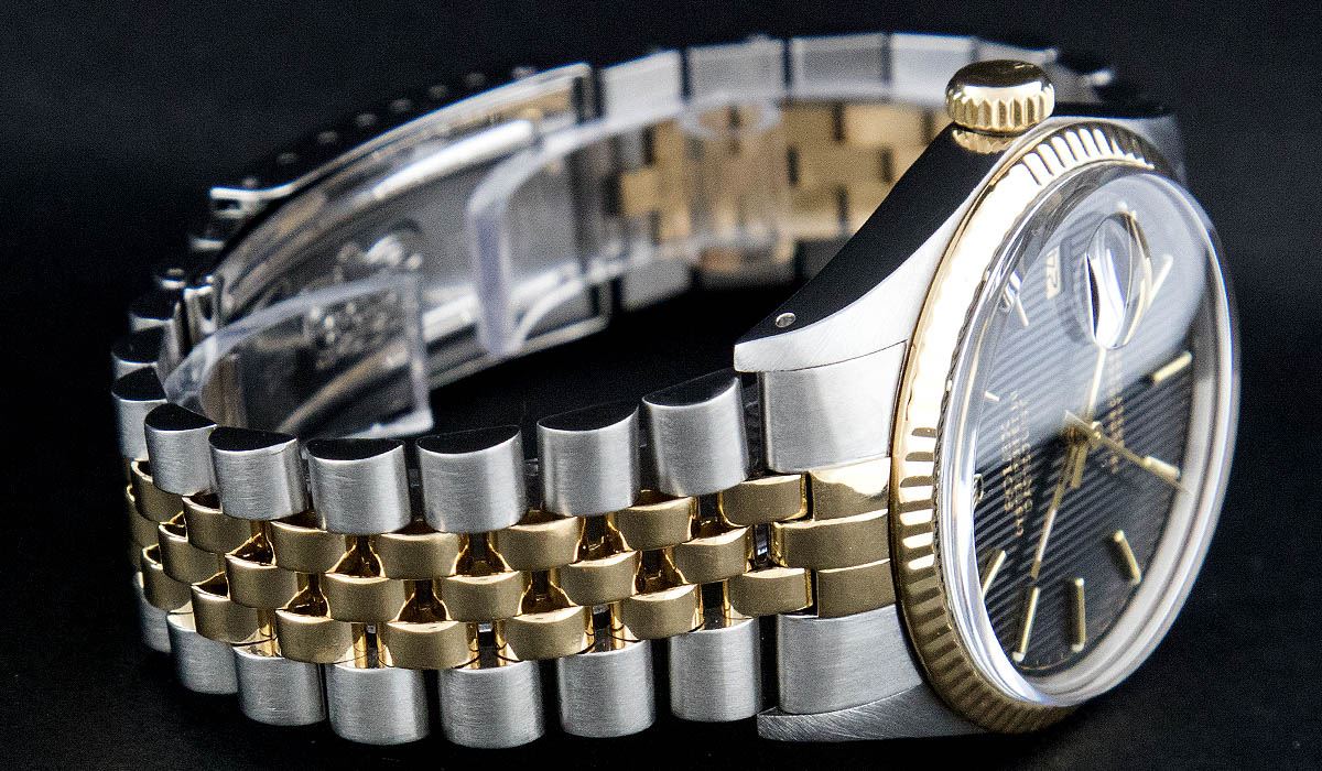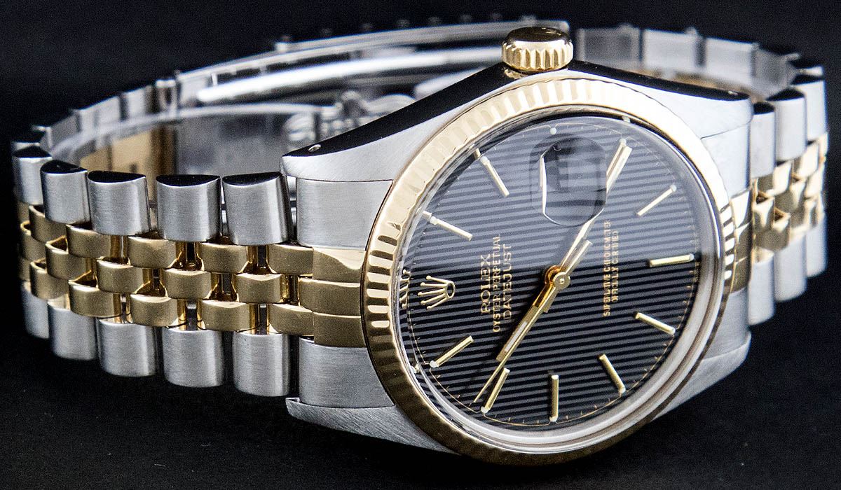 One Gents Two Tone Rolex Datejust Polished, Serviced & Electronically Tested, 14K Yellow Gold & Stainless Steel Case:36mm, 14K Yellow Gold Crown, Bezel: 14K Yellow Gold Fluted Bezel. Custom Crystal: Acrylic Cyclops Lens. Movement: Automatic Winding Movement Caliber 3035. Dial: Black Tapestry Index With Luminescent Dots. Date Window: 3 O'Clock Position Date Display, Quickset, Model: 16013 Condition: G-6 Extra Fine. Bracelet: Two Tone 14K Yellow Gold & Stainless Steel Jubilee. Bright Polish. 6.5 Inch Length, Adjustable. Standard Clasp, With Rolex Logo.