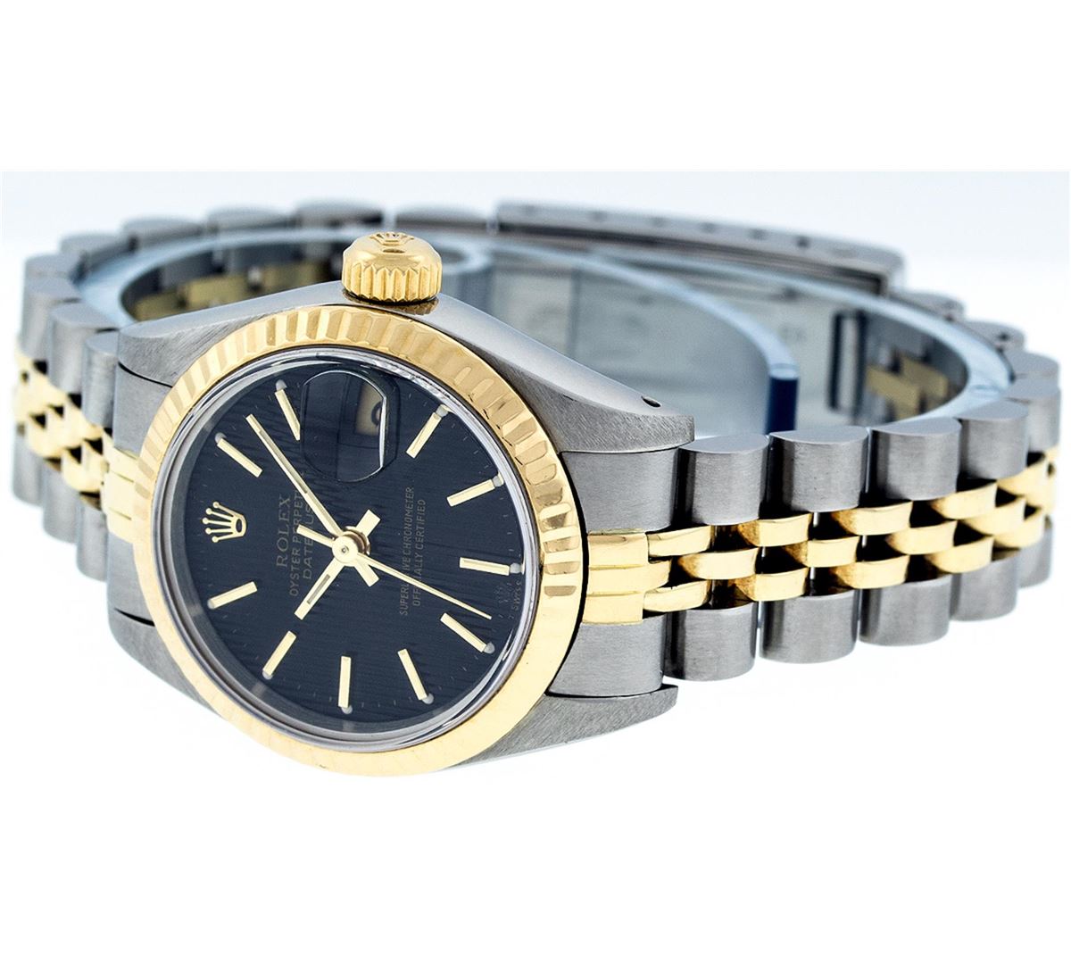 One Ladies Two Tone Rolex Datejust Polished, Serviced & Electronically Tested, 14K Yellow Gold & Stainless Steel Case:26mm, 14K Yellow Gold Crown, Bezel: 14K Yellow Gold Fluted Bezel. Custom Crystal: Acrylic Cyclops Lens. Movement: Automatic Winding Movement Caliber 2030. Dial: Black Tapestry Index With Luminescent Dots. Date Window: 3 O'Clock Position Date Display, Model: Datejust. Condition: G-6 Extra Fine. Bracelet: Two Tone 14K Yellow Gold & Stainless Steel Jubilee Band. Bright Polish. 5.5 Inch Length, Adjustable. Standard Clasp, With Rolex Logo. Comes with a 6 month warranty card.