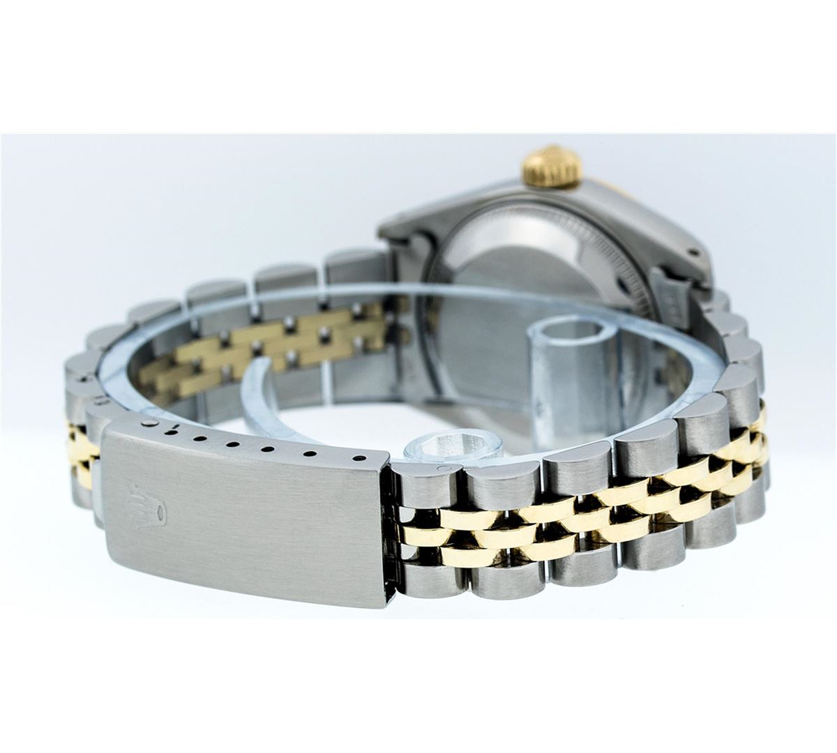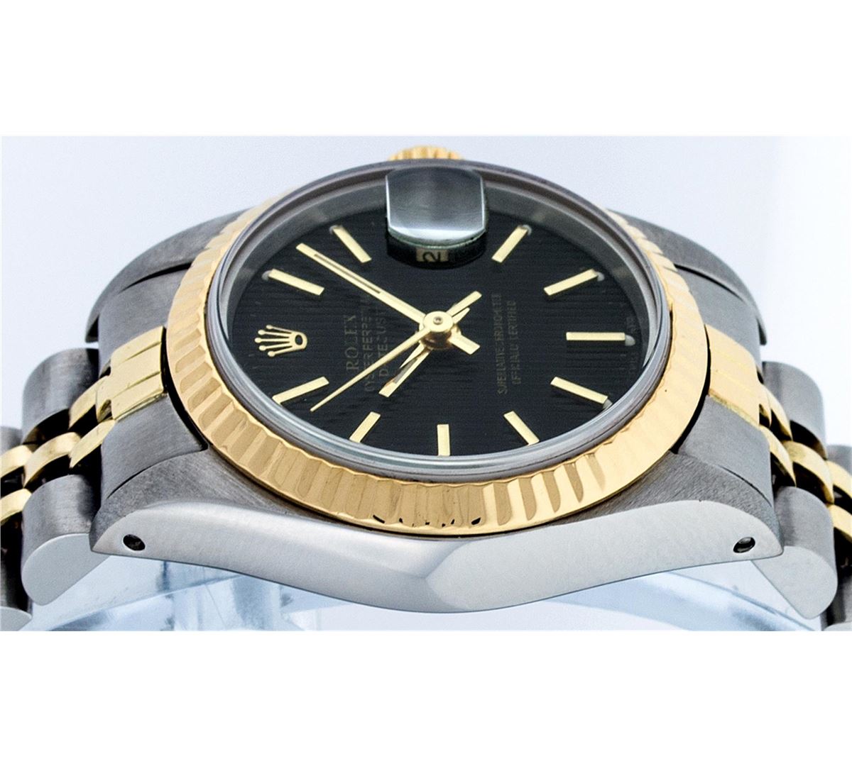 One Ladies Two Tone Rolex Datejust Polished, Serviced & Electronically Tested, 14K Yellow Gold & Stainless Steel Case:26mm, 14K Yellow Gold Crown, Bezel: 14K Yellow Gold Fluted Bezel. Custom Crystal: Acrylic Cyclops Lens. Movement: Automatic Winding Movement Caliber 2030. Dial: Black Tapestry Index With Luminescent Dots. Date Window: 3 O'Clock Position Date Display, Model: Datejust. Condition: G-6 Extra Fine. Bracelet: Two Tone 14K Yellow Gold & Stainless Steel Jubilee Band. Bright Polish. 5.5 Inch Length, Adjustable. Standard Clasp, With Rolex Logo. Comes with a 6 month warranty card.