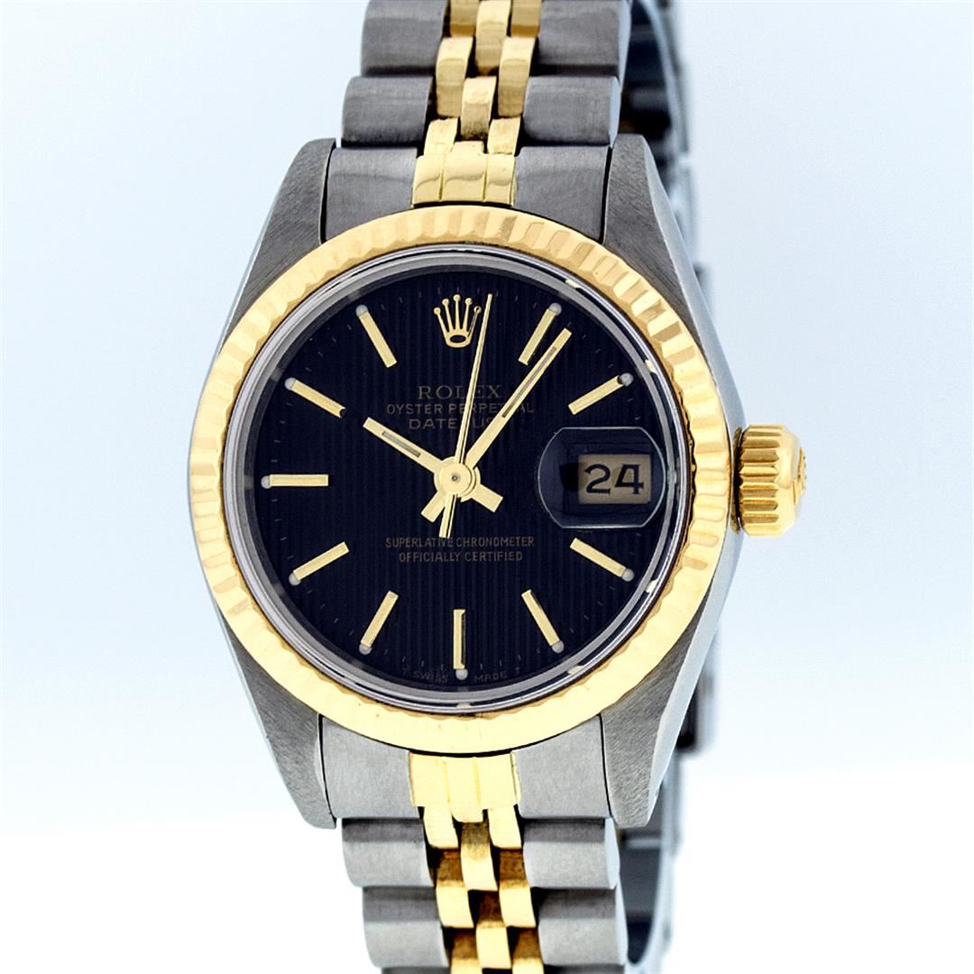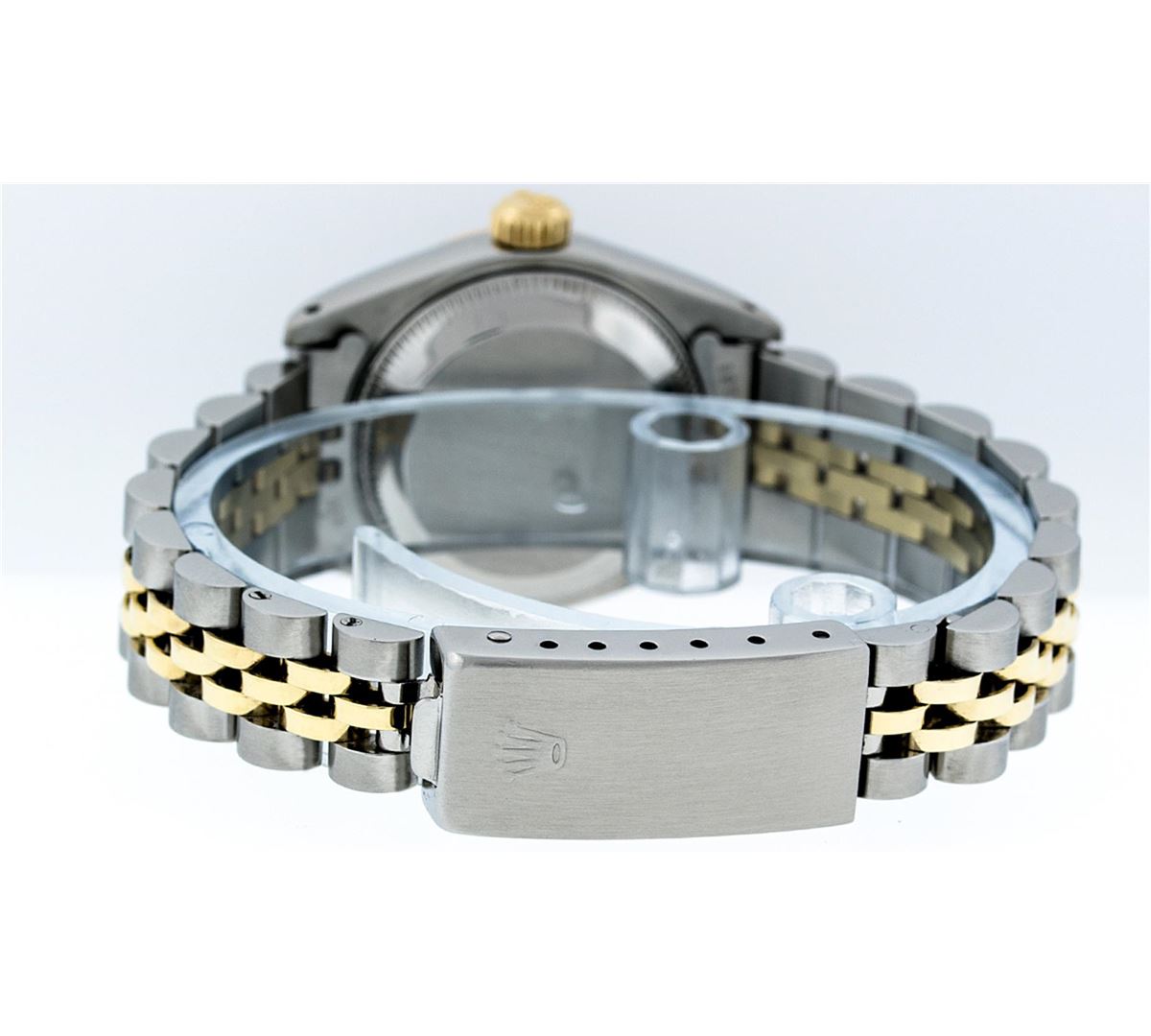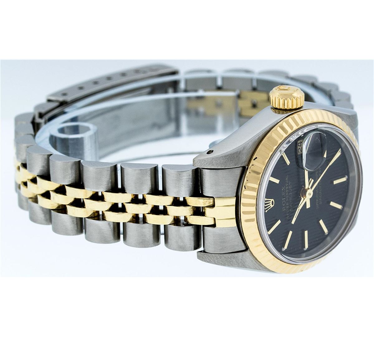 One Ladies Two Tone Rolex Datejust Polished, Serviced & Electronically Tested, 14K Yellow Gold & Stainless Steel Case:26mm, 14K Yellow Gold Crown, Bezel: 14K Yellow Gold Fluted Bezel. Custom Crystal: Acrylic Cyclops Lens. Movement: Automatic Winding Movement Caliber 2030. Dial: Black Tapestry Index With Luminescent Dots. Date Window: 3 O'Clock Position Date Display, Model: Datejust. Condition: G-6 Extra Fine. Bracelet: Two Tone 14K Yellow Gold & Stainless Steel Jubilee Band. Bright Polish. 5.5 Inch Length, Adjustable. Standard Clasp, With Rolex Logo. Comes with a 6 month warranty card.