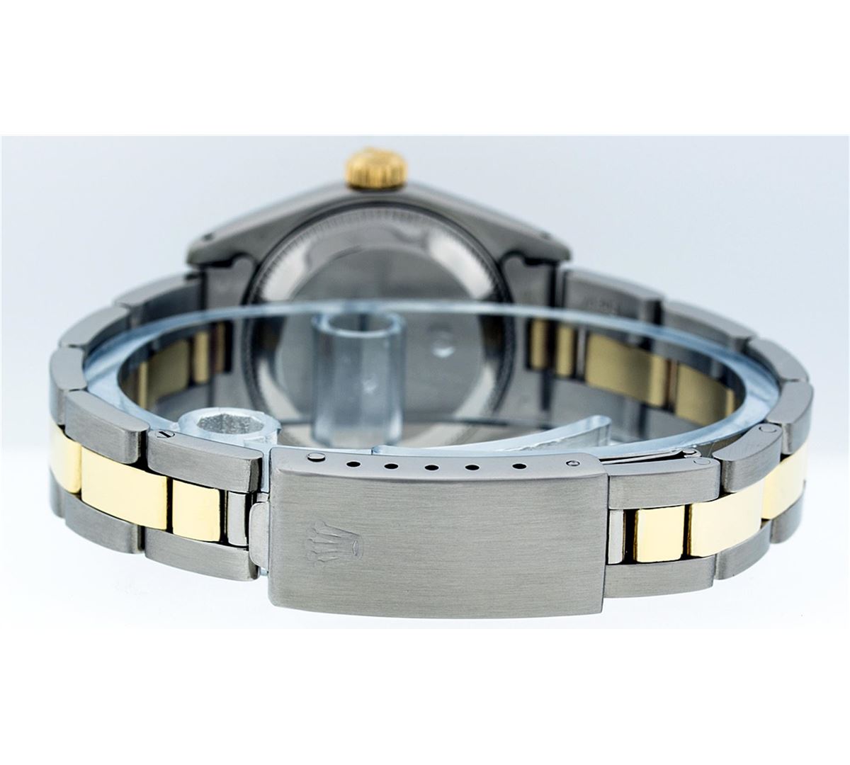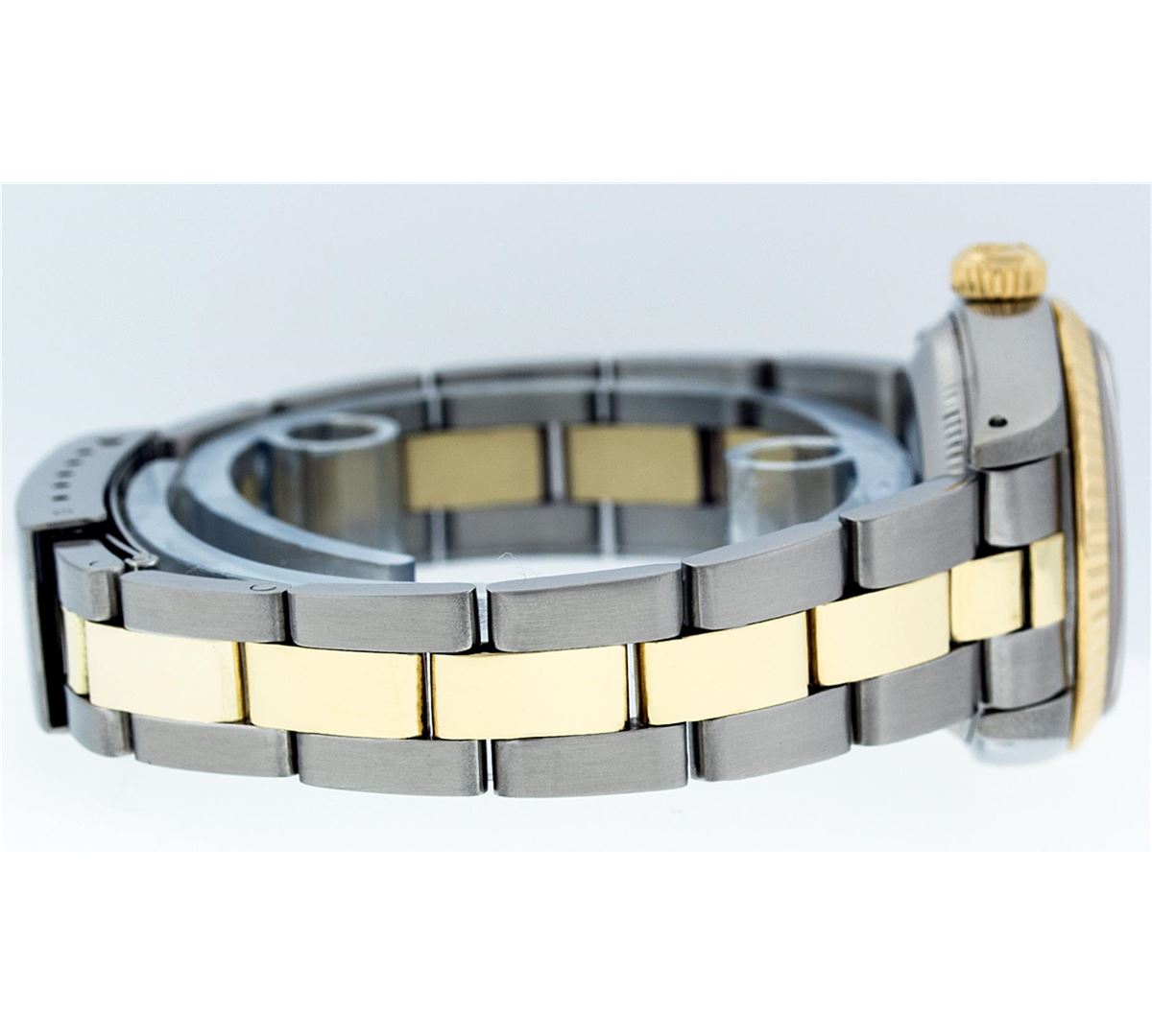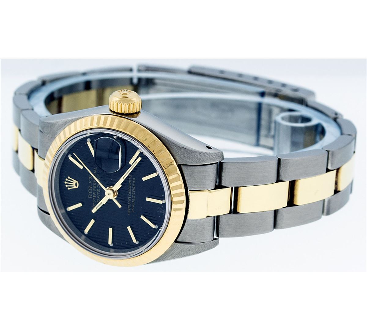 One Ladies Two Tone Rolex Datejust Polished, Serviced & Electronically Tested, 14K Yellow Gold & Stainless Steel Case:26mm, 14K Yellow Gold Crown, Bezel: 14K Yellow Gold Fluted Bezel. Custom Crystal: Acrylic Cyclops Lens. Movement: Automatic Winding Movement Caliber 2030. Dial: Black Tapestry Index With Luminescent Dots. Date Window: 3 O'Clock Position Date Display, Model: Datejust. Condition: G-6 Extra Fine. Bracelet: Two Tone 14K Yellow Gold & Stainless Steel Oyster Band. Bright Polish. 5.5 Inch Length, Adjustable. Standard Clasp, With Rolex Logo. Comes with a 6 month warranty card.