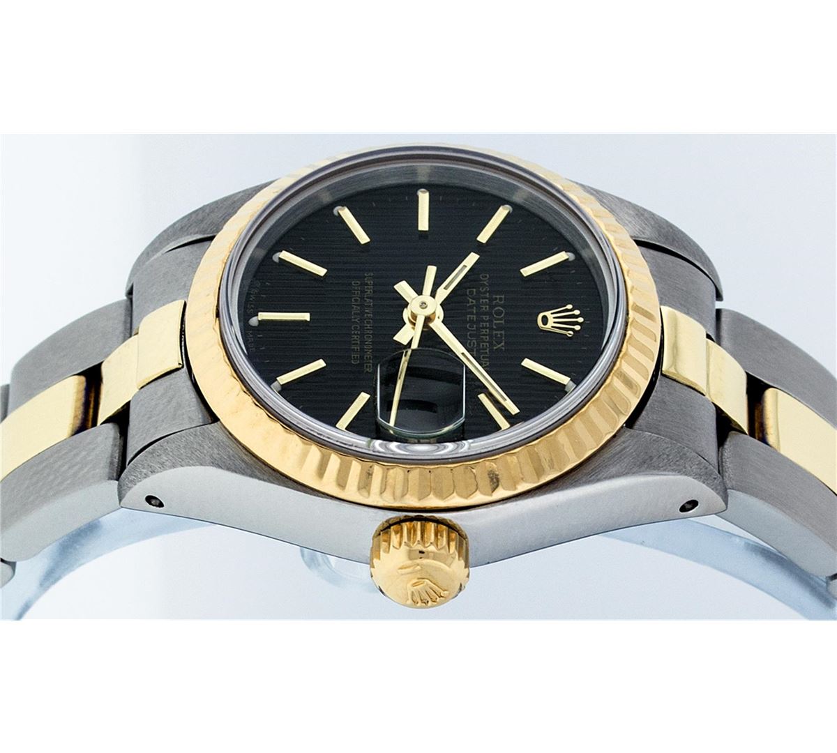 One Ladies Two Tone Rolex Datejust Polished, Serviced & Electronically Tested, 14K Yellow Gold & Stainless Steel Case:26mm, 14K Yellow Gold Crown, Bezel: 14K Yellow Gold Fluted Bezel. Custom Crystal: Acrylic Cyclops Lens. Movement: Automatic Winding Movement Caliber 2030. Dial: Black Tapestry Index With Luminescent Dots. Date Window: 3 O'Clock Position Date Display, Model: Datejust. Condition: G-6 Extra Fine. Bracelet: Two Tone 14K Yellow Gold & Stainless Steel Oyster Band. Bright Polish. 5.5 Inch Length, Adjustable. Standard Clasp, With Rolex Logo. Comes with a 6 month warranty card.