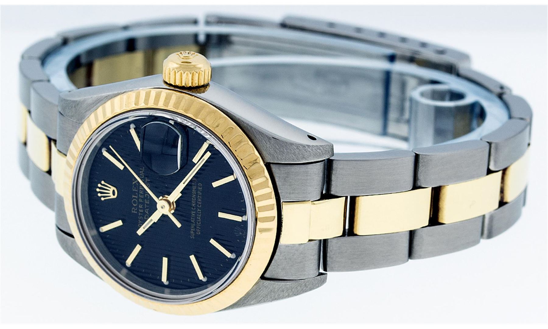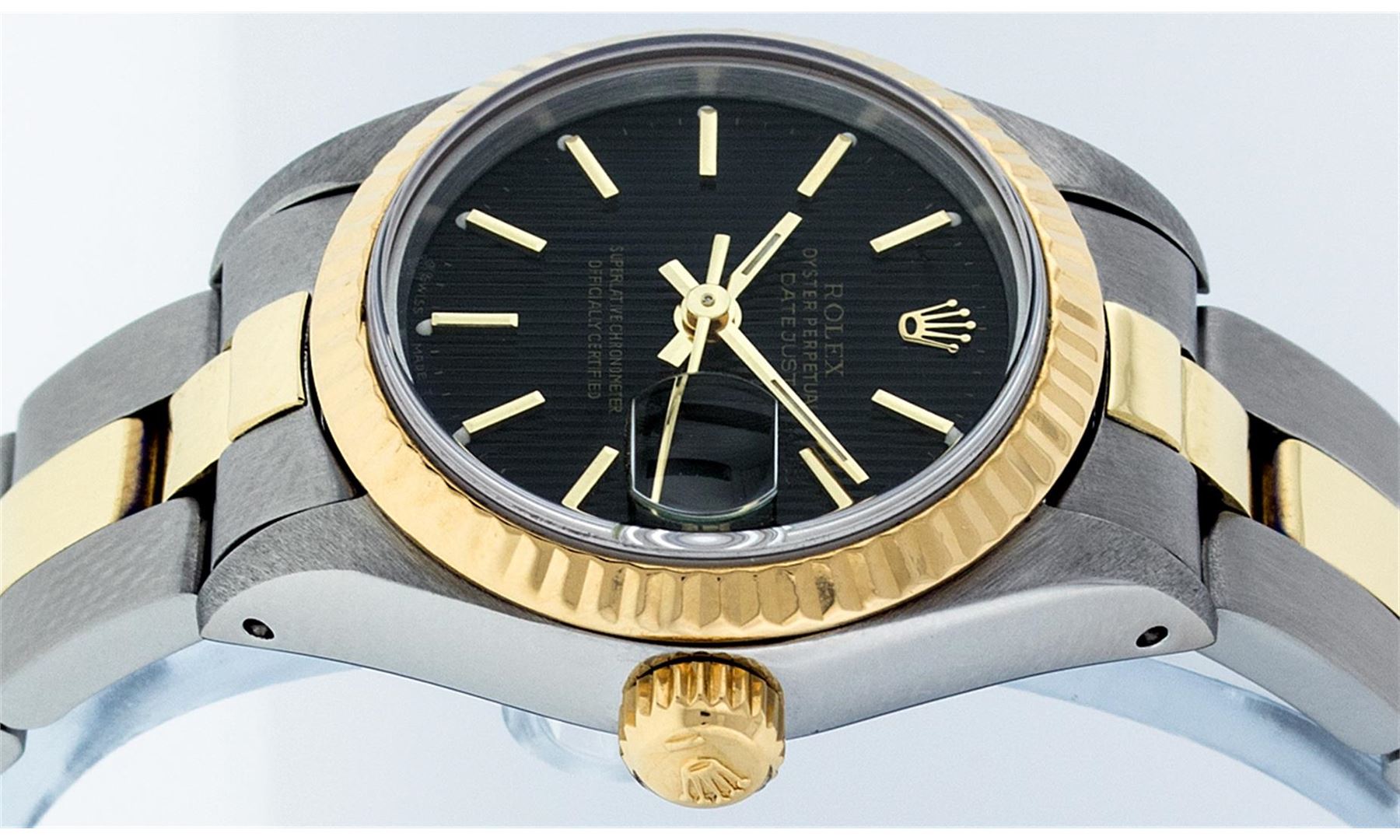 One Ladies Two Tone Rolex Datejust Polished, Serviced & Electronically Tested, 14K Yellow Gold & Stainless Steel Case:26mm, 14K Yellow Gold Crown, Bezel: 14K Yellow Gold Fluted Bezel. Custom Crystal: Acrylic Cyclops Lens. Movement: Automatic Winding Movement Caliber 2030. Dial: Black Tapestry Index With Luminescent Dots. Date Window: 3 O'Clock Position Date Display, Model: Datejust. Condition: G-6 Extra Fine. Bracelet: Two Tone 14K Yellow Gold & Stainless Steel Oyster Band. Bright Polish. 5.5 Inch Length, Adjustable. Standard Clasp, With Rolex Logo. Comes with a 6 month warranty card.