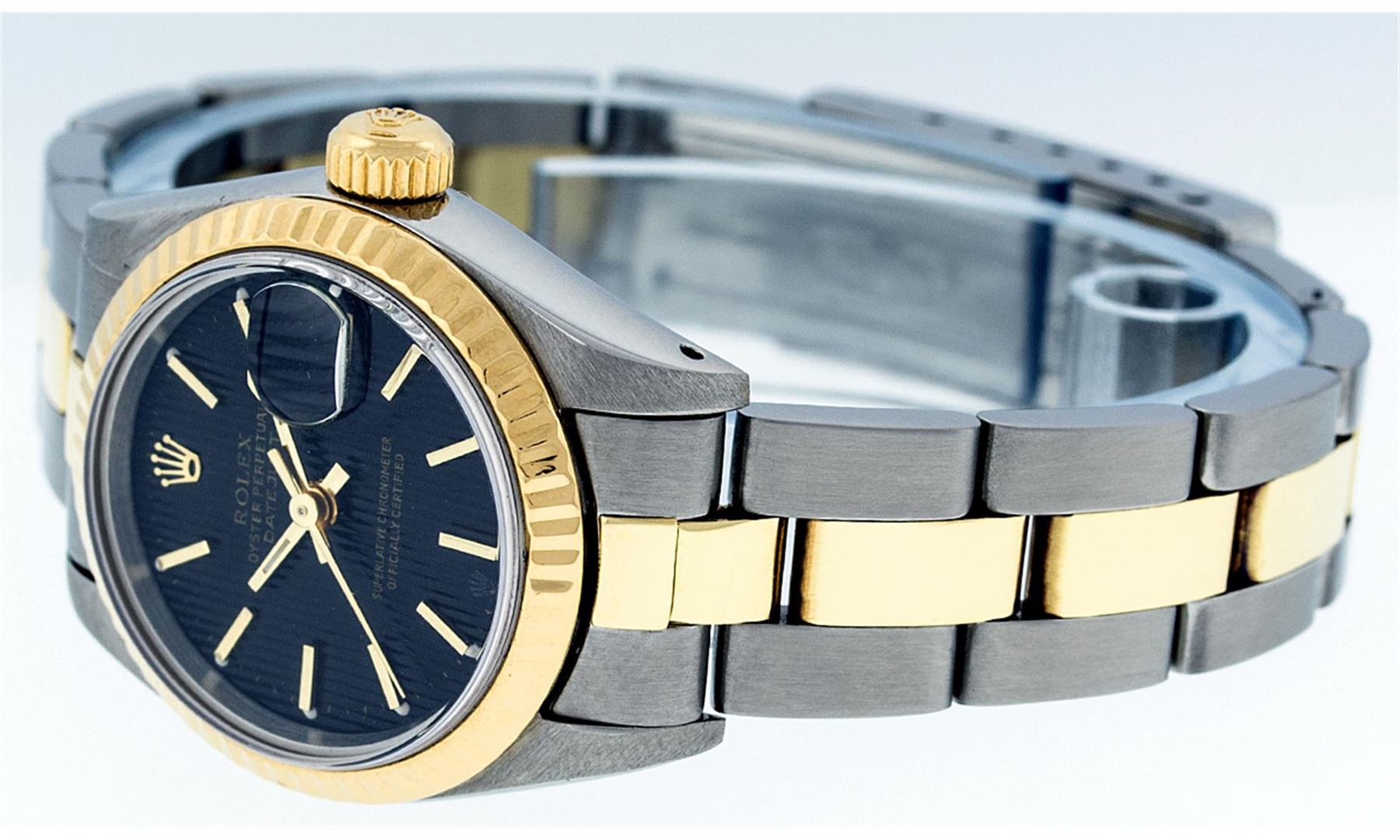 One Ladies Two Tone Rolex Datejust Polished, Serviced & Electronically Tested, 14K Yellow Gold & Stainless Steel Case:26mm, 14K Yellow Gold Crown, Bezel: 14K Yellow Gold Fluted Bezel. Custom Crystal: Acrylic Cyclops Lens. Movement: Automatic Winding Movement Caliber 2030. Dial: Black Tapestry Index With Luminescent Dots. Date Window: 3 O'Clock Position Date Display, Model: Datejust. Condition: G-6 Extra Fine. Bracelet: Two Tone 14K Yellow Gold & Stainless Steel Oyster Band. Bright Polish. 5.5 Inch Length, Adjustable. Standard Clasp, With Rolex Logo. Comes with a 6 month warranty card.