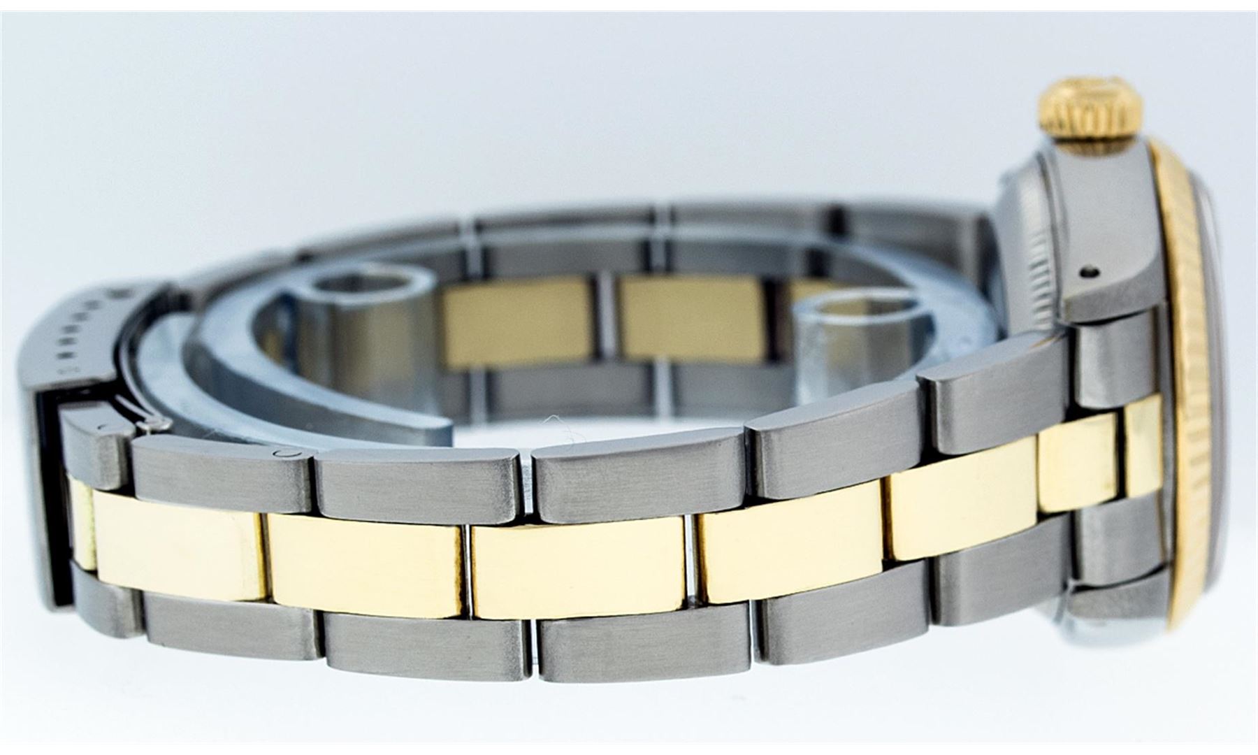 One Ladies Two Tone Rolex Datejust Polished, Serviced & Electronically Tested, 14K Yellow Gold & Stainless Steel Case:26mm, 14K Yellow Gold Crown, Bezel: 14K Yellow Gold Fluted Bezel. Custom Crystal: Acrylic Cyclops Lens. Movement: Automatic Winding Movement Caliber 2030. Dial: Black Tapestry Index With Luminescent Dots. Date Window: 3 O'Clock Position Date Display, Model: Datejust. Condition: G-6 Extra Fine. Bracelet: Two Tone 14K Yellow Gold & Stainless Steel Oyster Band. Bright Polish. 5.5 Inch Length, Adjustable. Standard Clasp, With Rolex Logo. Comes with a 6 month warranty card.