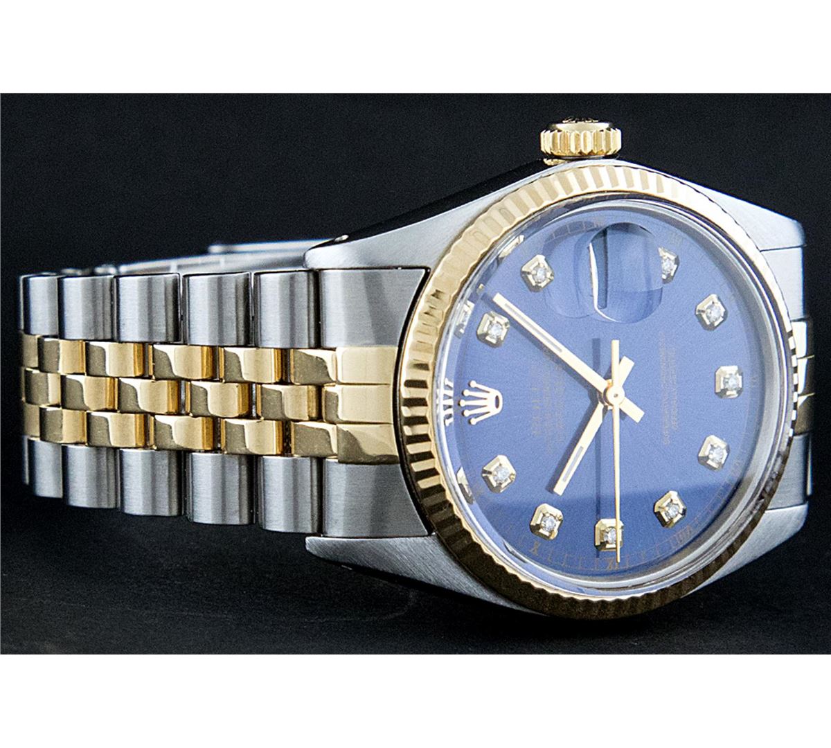 One Mens Two Tone Rolex Datejust Polished, Serviced & Electronically Tested, 14K Yellow Gold & Stainless Steel Case: 36mm,14K Yellow Gold Crown, Bezel: 14K Yellow Gold Fluted Bezel. Custom Crystal: Acrylic Cyclops Lens. Movement: Automatic Winding Movement Caliber 3035. Custom Dial: Blue Dial With Diamond Hour Markers and Track. Diamond Count: 10 Diamonds In Dial, Color: G To H, Clarity: VS2-SI1. Date Window: 3 O'Clock Position Date Display, Quickset, Model: 16013 Condition: G-6 Extra Fine. Bracelet: Two Tone 14K Yellow Gold & Stainless Steel Jubilee. Bright Polish. 7.0 Inch Length, Adjustable. Standard Clasp, With Rolex Logo.