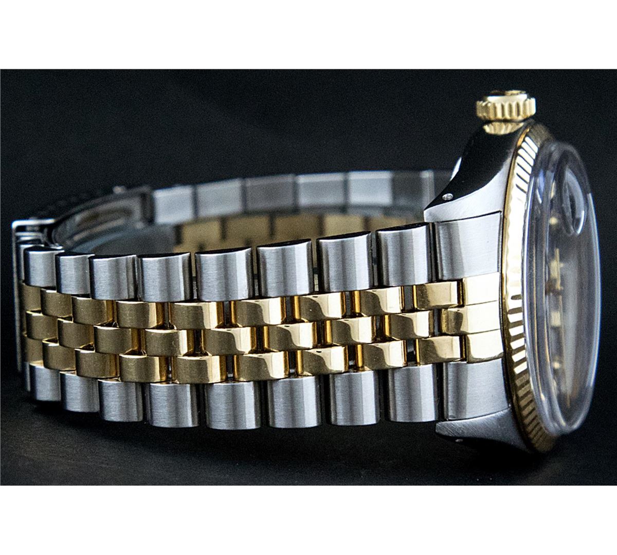 One Mens Two Tone Rolex Datejust Polished, Serviced & Electronically Tested, 14K Yellow Gold & Stainless Steel Case: 36mm,14K Yellow Gold Crown, Bezel: 14K Yellow Gold Fluted Bezel. Custom Crystal: Acrylic Cyclops Lens. Movement: Automatic Winding Movement Caliber 3035. Custom Dial: Blue Dial With Diamond Hour Markers and Track. Diamond Count: 10 Diamonds In Dial, Color: G To H, Clarity: VS2-SI1. Date Window: 3 O'Clock Position Date Display, Quickset, Model: 16013 Condition: G-6 Extra Fine. Bracelet: Two Tone 14K Yellow Gold & Stainless Steel Jubilee. Bright Polish. 7.0 Inch Length, Adjustable. Standard Clasp, With Rolex Logo.