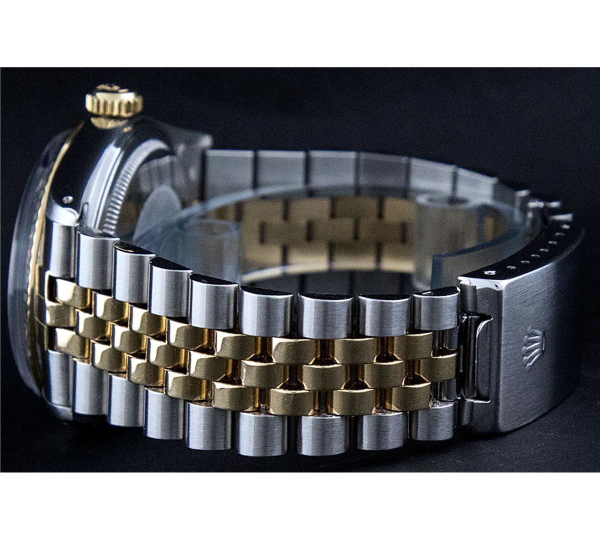 One Mens Two Tone Rolex Datejust Polished, Serviced & Electronically Tested, 14K Yellow Gold & Stainless Steel Case: 36mm,14K Yellow Gold Crown, Bezel: 14K Yellow Gold Fluted Bezel. Custom Crystal: Acrylic Cyclops Lens. Movement: Automatic Winding Movement Caliber 3035. Custom Dial: Blue Dial With Diamond Hour Markers and Track. Diamond Count: 10 Diamonds In Dial, Color: G To H, Clarity: VS2-SI1. Date Window: 3 O'Clock Position Date Display, Quickset, Model: 16013 Condition: G-6 Extra Fine. Bracelet: Two Tone 14K Yellow Gold & Stainless Steel Jubilee. Bright Polish. 7.0 Inch Length, Adjustable. Standard Clasp, With Rolex Logo.