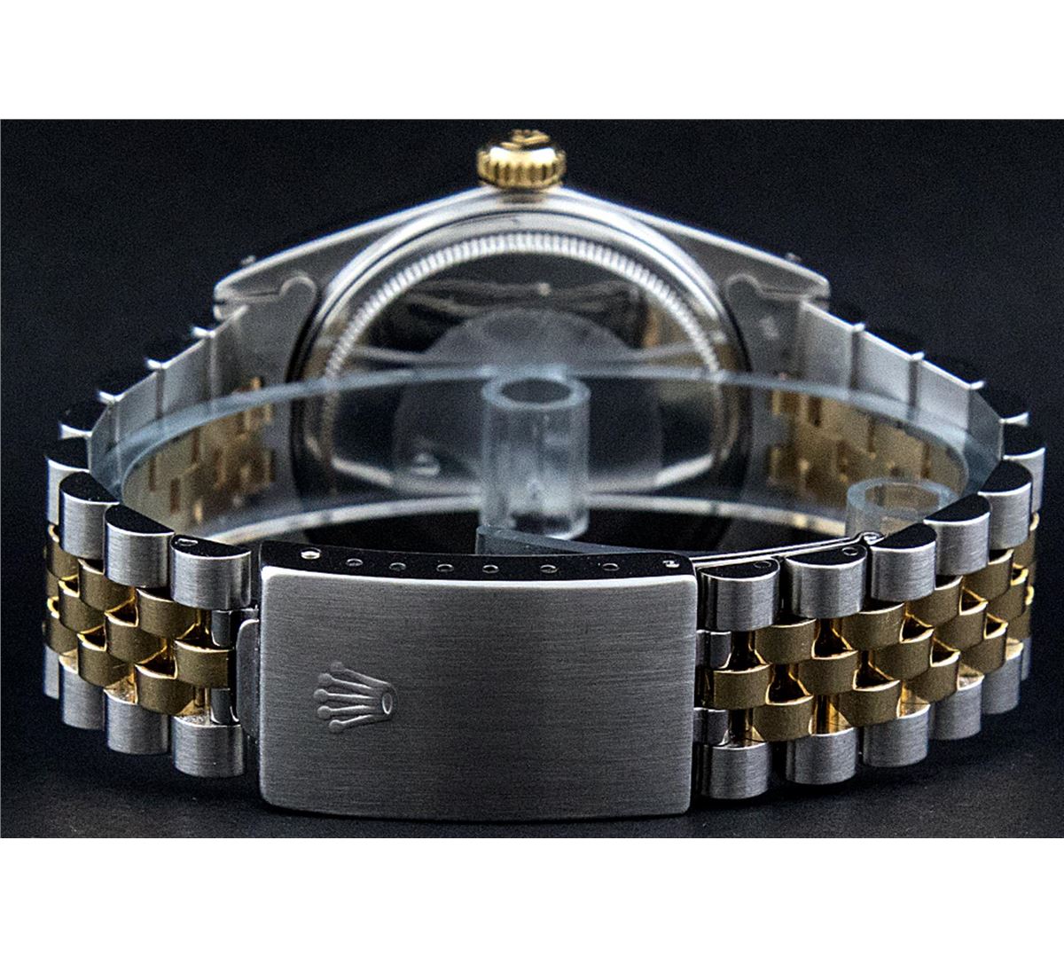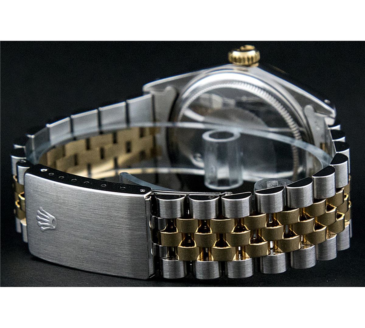 One Mens Two Tone Rolex Datejust Polished, Serviced & Electronically Tested, 14K Yellow Gold & Stainless Steel Case: 36mm,14K Yellow Gold Crown, Bezel: 14K Yellow Gold Fluted Bezel. Custom Crystal: Acrylic Cyclops Lens. Movement: Automatic Winding Movement Caliber 3035. Custom Dial: Blue Dial With Diamond Hour Markers and Track. Diamond Count: 10 Diamonds In Dial, Color: G To H, Clarity: VS2-SI1. Date Window: 3 O'Clock Position Date Display, Quickset, Model: 16013 Condition: G-6 Extra Fine. Bracelet: Two Tone 14K Yellow Gold & Stainless Steel Jubilee. Bright Polish. 7.0 Inch Length, Adjustable. Standard Clasp, With Rolex Logo.