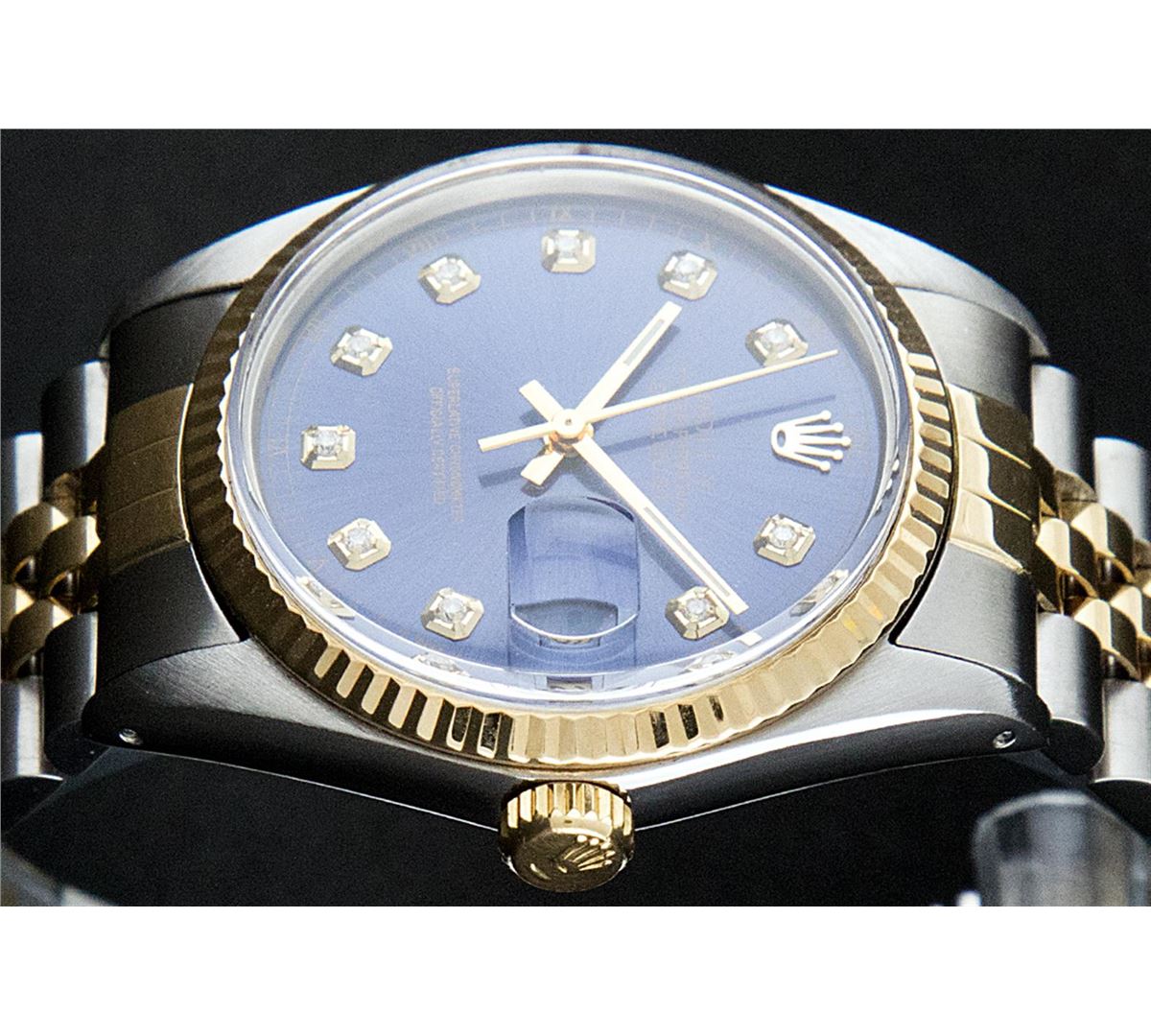 One Mens Two Tone Rolex Datejust Polished, Serviced & Electronically Tested, 14K Yellow Gold & Stainless Steel Case: 36mm,14K Yellow Gold Crown, Bezel: 14K Yellow Gold Fluted Bezel. Custom Crystal: Acrylic Cyclops Lens. Movement: Automatic Winding Movement Caliber 3035. Custom Dial: Blue Dial With Diamond Hour Markers and Track. Diamond Count: 10 Diamonds In Dial, Color: G To H, Clarity: VS2-SI1. Date Window: 3 O'Clock Position Date Display, Quickset, Model: 16013 Condition: G-6 Extra Fine. Bracelet: Two Tone 14K Yellow Gold & Stainless Steel Jubilee. Bright Polish. 7.0 Inch Length, Adjustable. Standard Clasp, With Rolex Logo.