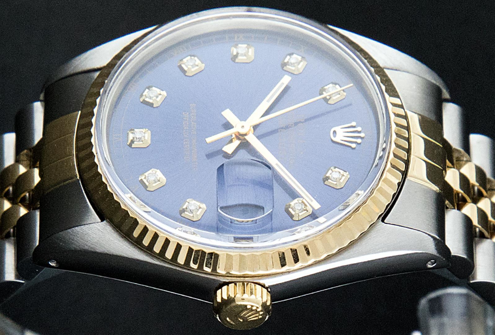 One Mens Two Tone Rolex Datejust Polished, Serviced & Electronically Tested, 14K Yellow Gold & Stainless Steel Case: 36mm,14K Yellow Gold Crown, Bezel: 14K Yellow Gold Fluted Bezel. Custom Crystal: Acrylic Cyclops Lens. Movement: Automatic Winding Movement Caliber 3035. Custom Dial: Blue Dial With Diamond Hour Markers and Track. Diamond Count: 10 Diamonds In Dial, Color: G To H, Clarity: VS2-SI1. Date Window: 3 O'Clock Position Date Display, Quickset, Model: 16013 Condition: G-6 Extra Fine. Bracelet: Two Tone 14K Yellow Gold & Stainless Steel Jubilee. Bright Polish. 7.0 Inch Length, Adjustable. Standard Clasp, With Rolex Logo.