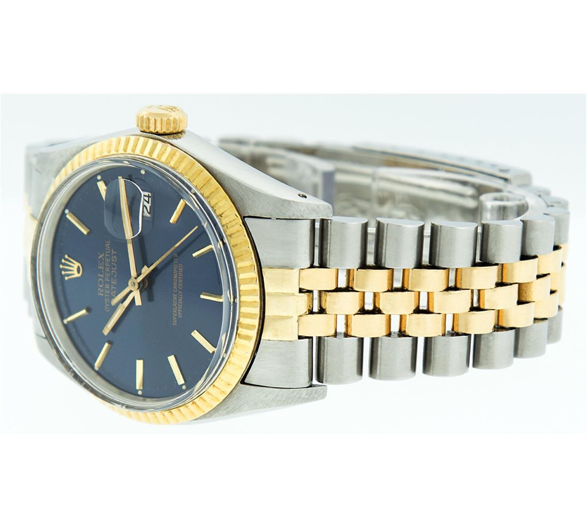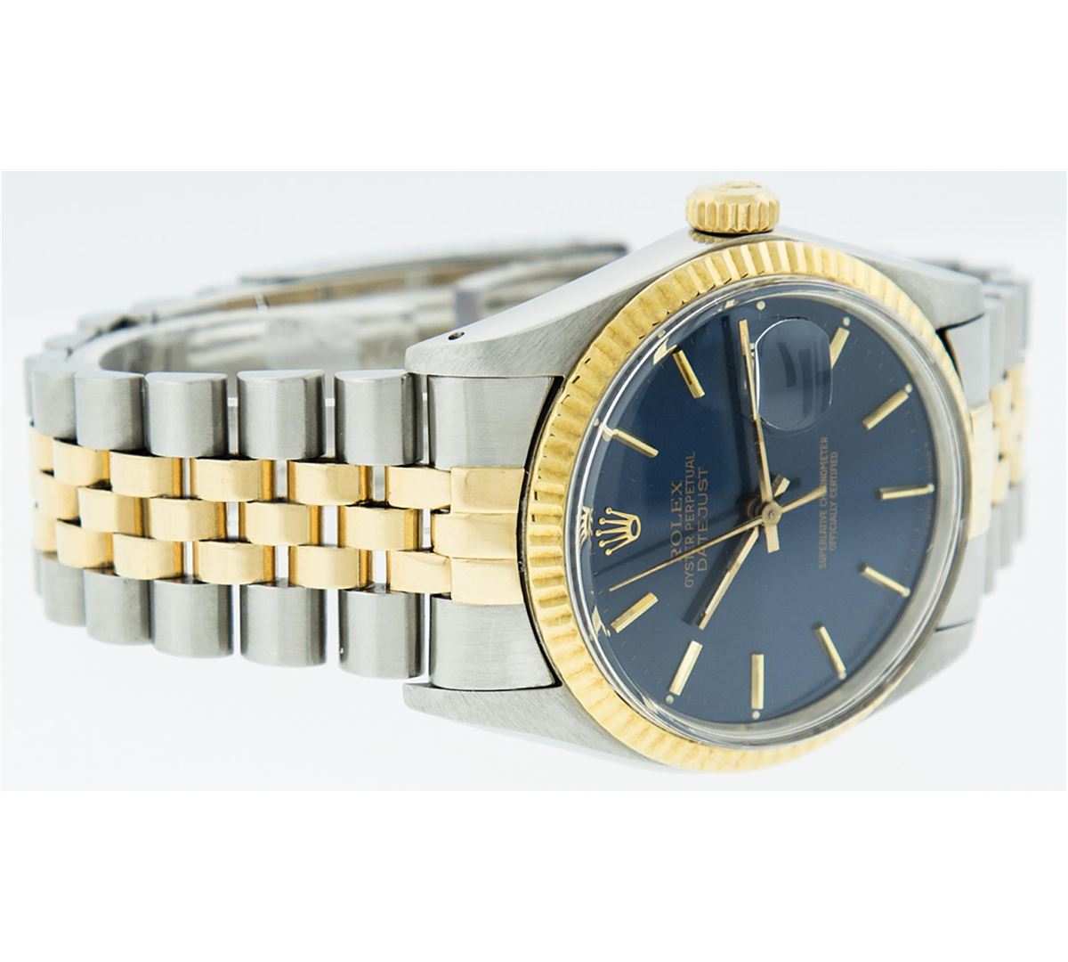 One Gents Two Tone Rolex Datejust Polished, Serviced & Electronically Tested, 14K Yellow Gold & Stainless Steel Case:36mm, 14K Yellow Gold Crown, Bezel:14K Yellow Gold Fluted Bezel. Custom Crystal: Acrylic Cyclops Lens. Movement: Automatic Winding Movement Caliber 3035. Custom Dial: Blue Index With Luminescent Dots. Date Window: 3 O'Clock Position Date Display, Quickset, Model: 16013 Condition: G-6 Extra Fine. Bracelet: Two Tone 14K Yellow Gold & Stainless Steel Jubilee. Bright Polish. 6.5 Inch Length, Adjustable. Standard Clasp, With Rolex Logo.
