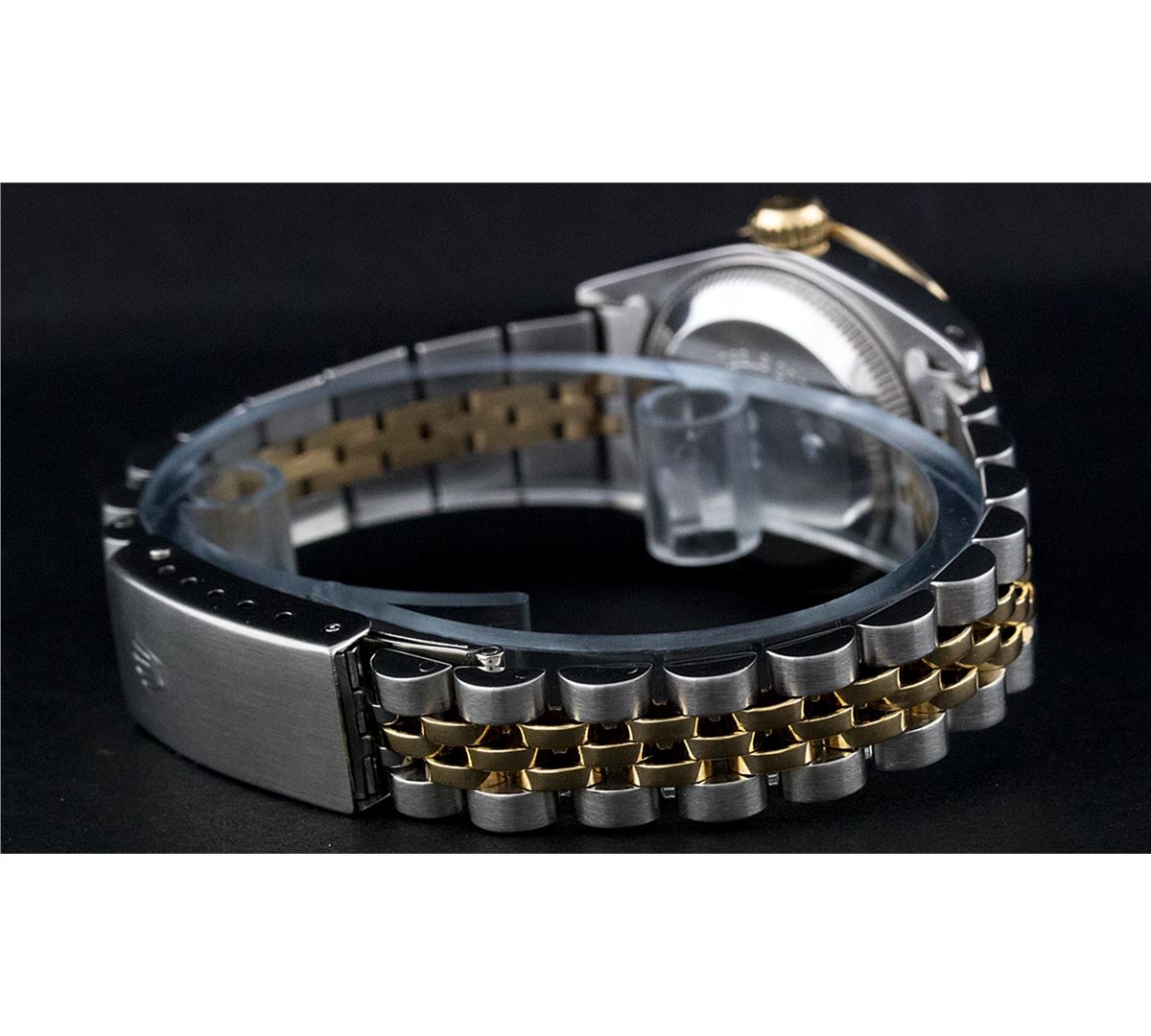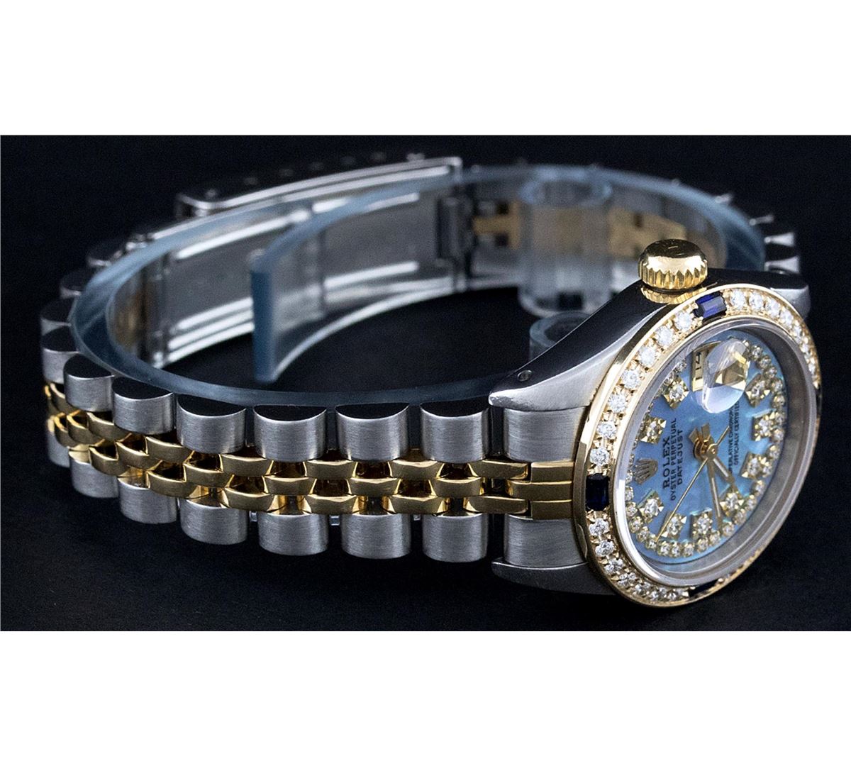 One Ladies Rolex Datejust Polished Bright with Satin Finish, Serviced & Electronically Tested, Stainless Steel Case:26mm, Yellow Gold Crown. Custom Bezel: 18K Yellow Gold Sapphire Beadset Bezel, Diamond Count: 28 Diamonds + 4 Sapphires, Total Weight 1.00 Carat, Clarity: SI-VS, Color: G to H. Custom Crystal: Synthetic Sapphire Cyclops Lens. Movement: Automatic Winding Movement Caliber 2030. Custom Dial: Refinished Blue MOP String Diamond Dial, Diamond Count: 43 Diamonds in Dial G To H In Color, Clarity: VVS. Date Window: 3 O'Clock Position Date Display, Non Quickset, Model: Datejust Condition: G-6 Extra Fine. Bracelet: Two Tone Yellow Gold and Stainless Steel Jubilee. Bright Polish & Satin Finish. 5.5 Inch Length, Adjustable. Standard Clasp, With Rolex Logo.