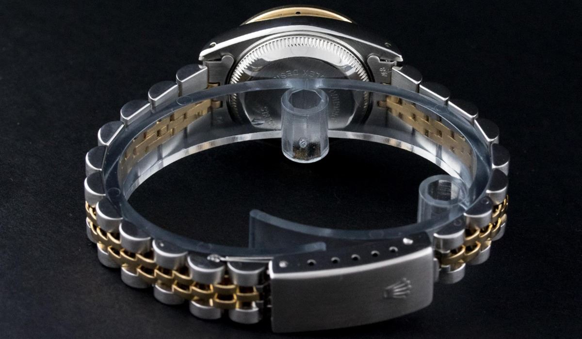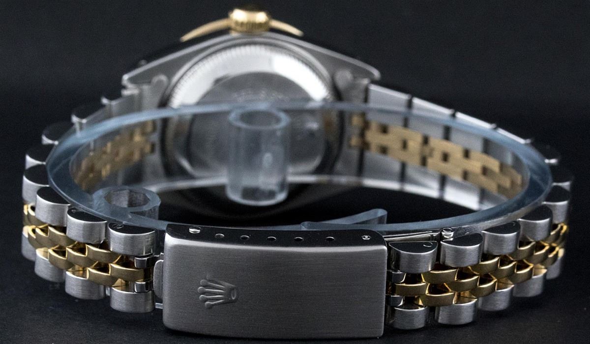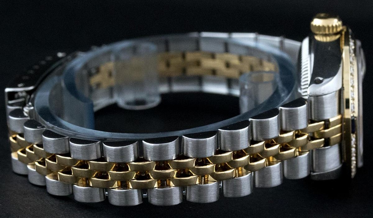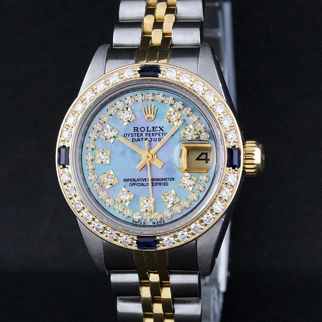 One Ladies Rolex Datejust Polished Bright with Satin Finish, Serviced & Electronically Tested, Stainless Steel Case:26mm, Yellow Gold Crown. Custom Bezel: 18K Yellow Gold Sapphire Beadset Bezel, Diamond Count: 28 Diamonds + 4 Sapphires, Total Weight 1.00 Carat, Clarity: SI-VS, Color: G to H. Custom Crystal: Synthetic Sapphire Cyclops Lens. Movement: Automatic Winding Movement Caliber 2030. Custom Dial: Refinished Blue MOP String Diamond Dial, Diamond Count: 43 Diamonds in Dial G To H In Color, Clarity: VVS. Date Window: 3 O'Clock Position Date Display, Non Quickset, Model: Datejust Condition: G-6 Extra Fine. Bracelet: Two Tone Yellow Gold and Stainless Steel Jubilee. Bright Polish & Satin Finish. 5.5 Inch Length, Adjustable. Standard Clasp, With Rolex Logo.