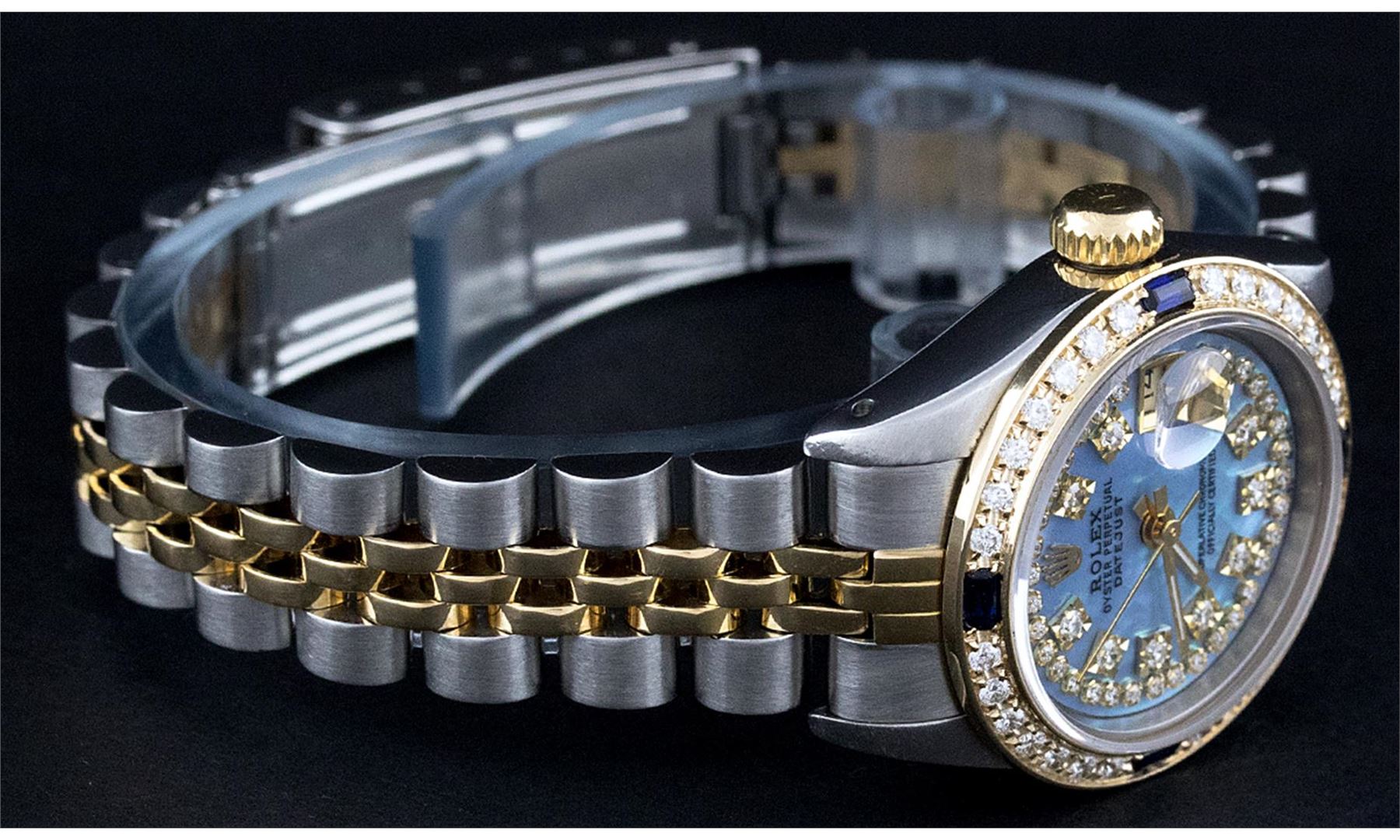 One Ladies Rolex Datejust Polished Bright with Satin Finish, Serviced & Electronically Tested, Stainless Steel Case:26mm, Yellow Gold Crown. Custom Bezel: 18K Yellow Gold Sapphire Beadset Bezel, Diamond Count: 28 Diamonds + 4 Sapphires, Total Weight 1.00 Carat, Clarity: SI-VS, Color: G to H. Custom Crystal: Synthetic Sapphire Cyclops Lens. Movement: Automatic Winding Movement Caliber 2030. Custom Dial: Refinished Blue MOP String Diamond Dial, Diamond Count: 43 Diamonds in Dial G To H In Color, Clarity: VVS. Date Window: 3 O'Clock Position Date Display, Non Quickset, Model: Datejust Condition: G-6 Extra Fine. Bracelet: Two Tone Yellow Gold and Stainless Steel Jubilee. Bright Polish & Satin Finish. 5.5 Inch Length, Adjustable. Standard Clasp, With Rolex Logo.
