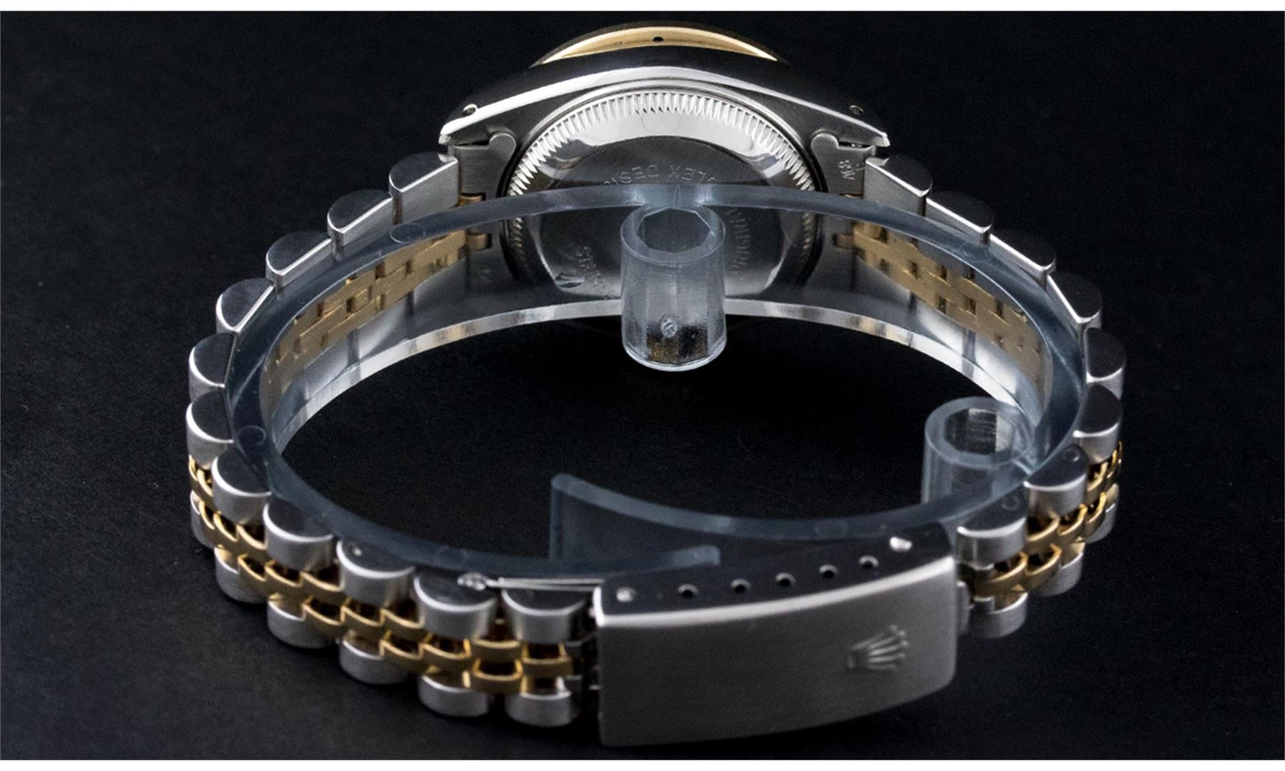 One Ladies Rolex Datejust Polished Bright with Satin Finish, Serviced & Electronically Tested, Stainless Steel Case:26mm, Yellow Gold Crown. Custom Bezel: 18K Yellow Gold Sapphire Beadset Bezel, Diamond Count: 28 Diamonds + 4 Sapphires, Total Weight 1.00 Carat, Clarity: SI-VS, Color: G to H. Custom Crystal: Synthetic Sapphire Cyclops Lens. Movement: Automatic Winding Movement Caliber 2030. Custom Dial: Refinished Blue MOP String Diamond Dial, Diamond Count: 43 Diamonds in Dial G To H In Color, Clarity: VVS. Date Window: 3 O'Clock Position Date Display, Non Quickset, Model: Datejust Condition: G-6 Extra Fine. Bracelet: Two Tone Yellow Gold and Stainless Steel Jubilee. Bright Polish & Satin Finish. 5.5 Inch Length, Adjustable. Standard Clasp, With Rolex Logo.