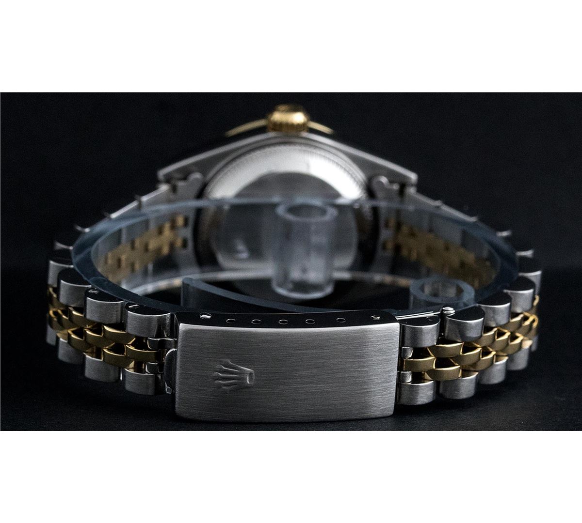 One Ladies Two Tone Rolex Datejust Polished, Serviced & Electronically Tested, 18K Yellow Gold & Stainless Steel Case No Hole Case:26mm, 18K Yellow Gold Crown, Custom Bezel: 18K Yellow Beadset Diamond Bezel, Diamond Count: 32 Diamond, Total Weight .70 Carat, Clarity: Si-VS, Color: G to H. Crystal: Synthetic Sapphire Cyclops Lens. Movement: Automatic Winding Movement Caliber 2235. Custom Dial: Blue String Diamond Dial. Diamond Count: 43 Diamonds In Dial, Clarity: Si-VS, Color: VVS. Date Window: 3 O'Clock Position Date Display, Quickset, Model: Datejust Condition: G-6 Extra Fine. Bracelet: Two Tone 18K Yellow Gold & Stainless Steel Jubilee. Bright Polish. 6.0 Inch Length, Adjustable. Standard Clasp, With Rolex Logo.