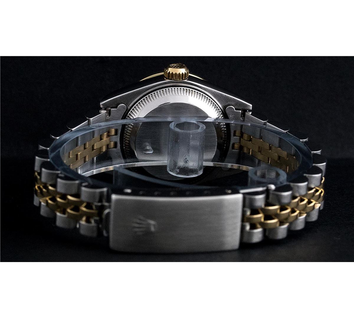 One Ladies Two Tone Rolex Datejust Polished, Serviced & Electronically Tested, 18K Yellow Gold & Stainless Steel Case No Hole Case:26mm, 18K Yellow Gold Crown, Custom Bezel: 18K Yellow Beadset Diamond Bezel, Diamond Count: 32 Diamond, Total Weight .70 Carat, Clarity: Si-VS, Color: G to H. Crystal: Synthetic Sapphire Cyclops Lens. Movement: Automatic Winding Movement Caliber 2235. Custom Dial: Blue String Diamond Dial. Diamond Count: 43 Diamonds In Dial, Clarity: Si-VS, Color: VVS. Date Window: 3 O'Clock Position Date Display, Quickset, Model: Datejust Condition: G-6 Extra Fine. Bracelet: Two Tone 18K Yellow Gold & Stainless Steel Jubilee. Bright Polish. 6.0 Inch Length, Adjustable. Standard Clasp, With Rolex Logo.