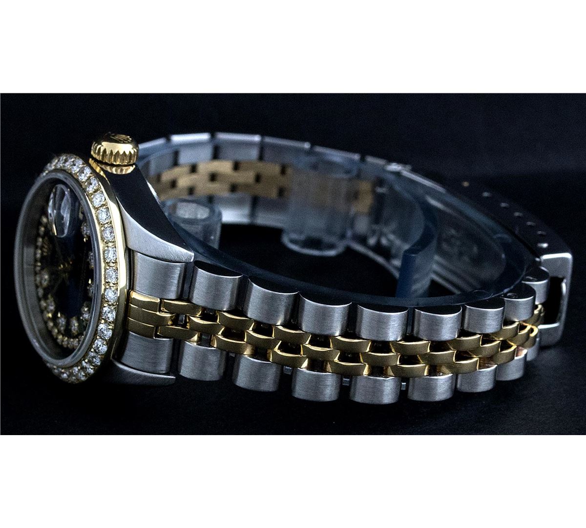 One Ladies Two Tone Rolex Datejust Polished, Serviced & Electronically Tested, 18K Yellow Gold & Stainless Steel Case No Hole Case:26mm, 18K Yellow Gold Crown, Custom Bezel: 18K Yellow Beadset Diamond Bezel, Diamond Count: 32 Diamond, Total Weight .70 Carat, Clarity: Si-VS, Color: G to H. Crystal: Synthetic Sapphire Cyclops Lens. Movement: Automatic Winding Movement Caliber 2235. Custom Dial: Blue String Diamond Dial. Diamond Count: 43 Diamonds In Dial, Clarity: Si-VS, Color: VVS. Date Window: 3 O'Clock Position Date Display, Quickset, Model: Datejust Condition: G-6 Extra Fine. Bracelet: Two Tone 18K Yellow Gold & Stainless Steel Jubilee. Bright Polish. 6.0 Inch Length, Adjustable. Standard Clasp, With Rolex Logo.