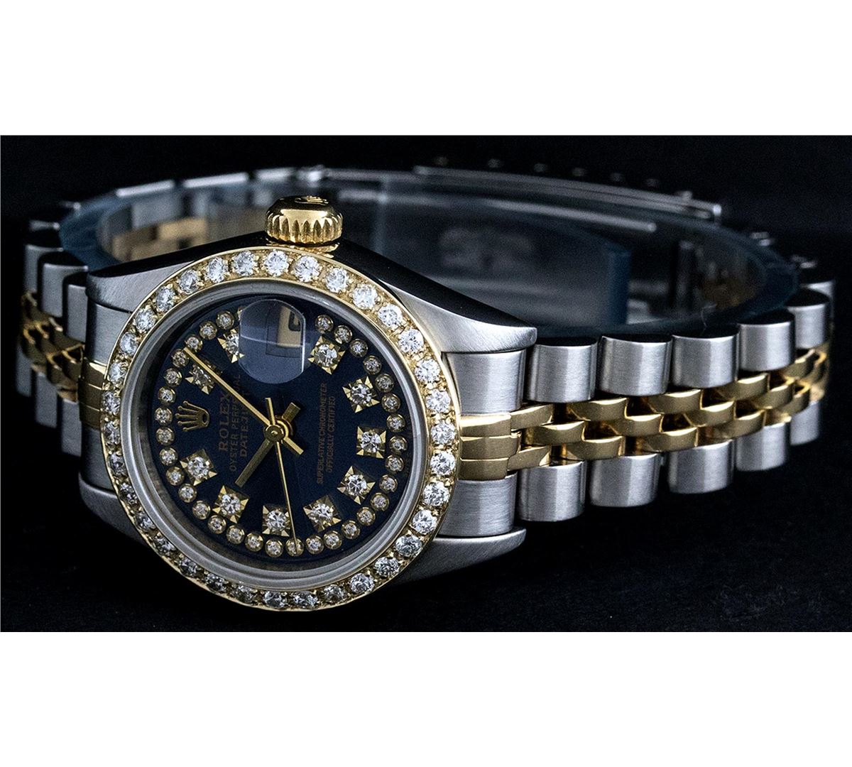 One Ladies Two Tone Rolex Datejust Polished, Serviced & Electronically Tested, 18K Yellow Gold & Stainless Steel Case No Hole Case:26mm, 18K Yellow Gold Crown, Custom Bezel: 18K Yellow Beadset Diamond Bezel, Diamond Count: 32 Diamond, Total Weight .70 Carat, Clarity: Si-VS, Color: G to H. Crystal: Synthetic Sapphire Cyclops Lens. Movement: Automatic Winding Movement Caliber 2235. Custom Dial: Blue String Diamond Dial. Diamond Count: 43 Diamonds In Dial, Clarity: Si-VS, Color: VVS. Date Window: 3 O'Clock Position Date Display, Quickset, Model: Datejust Condition: G-6 Extra Fine. Bracelet: Two Tone 18K Yellow Gold & Stainless Steel Jubilee. Bright Polish. 6.0 Inch Length, Adjustable. Standard Clasp, With Rolex Logo.