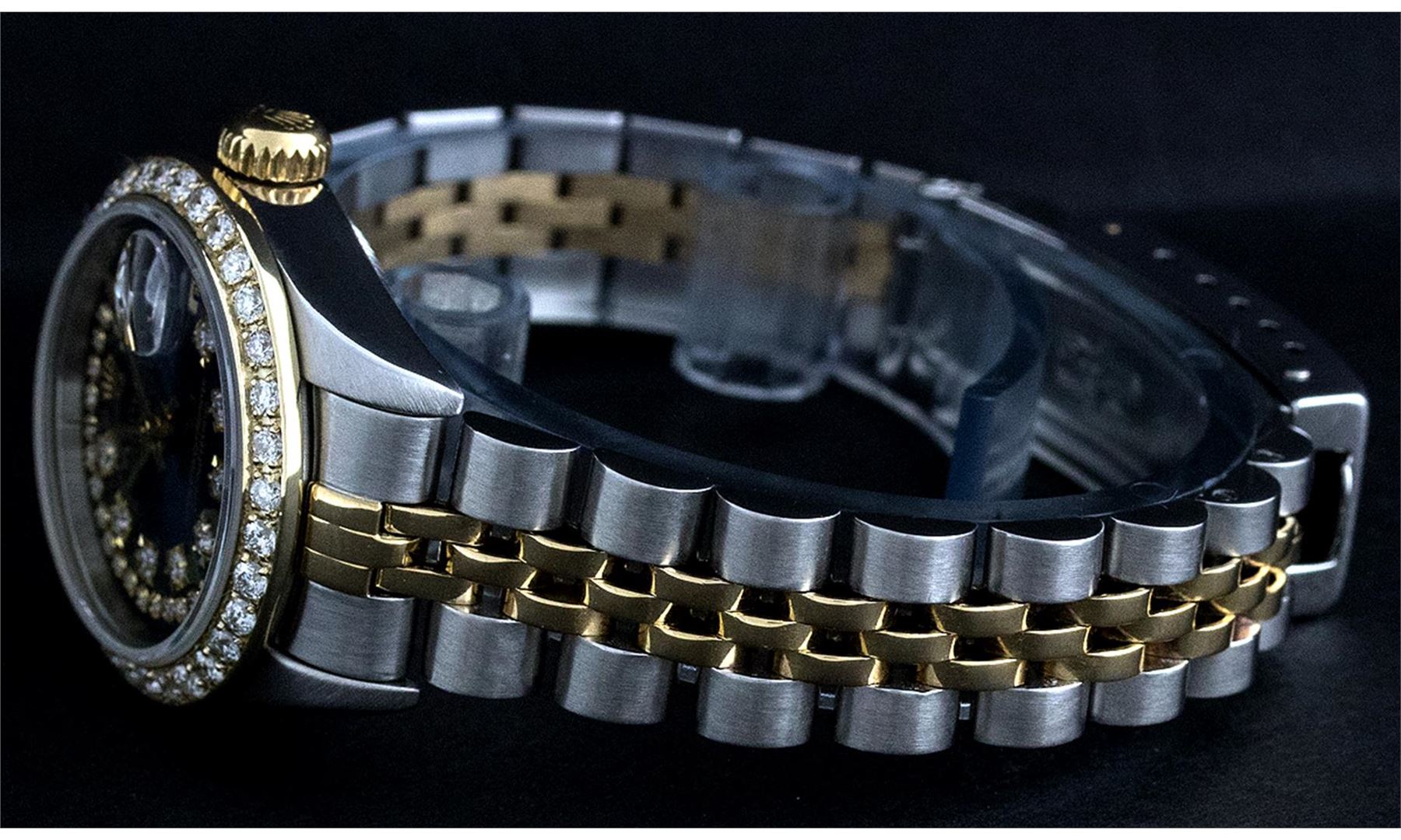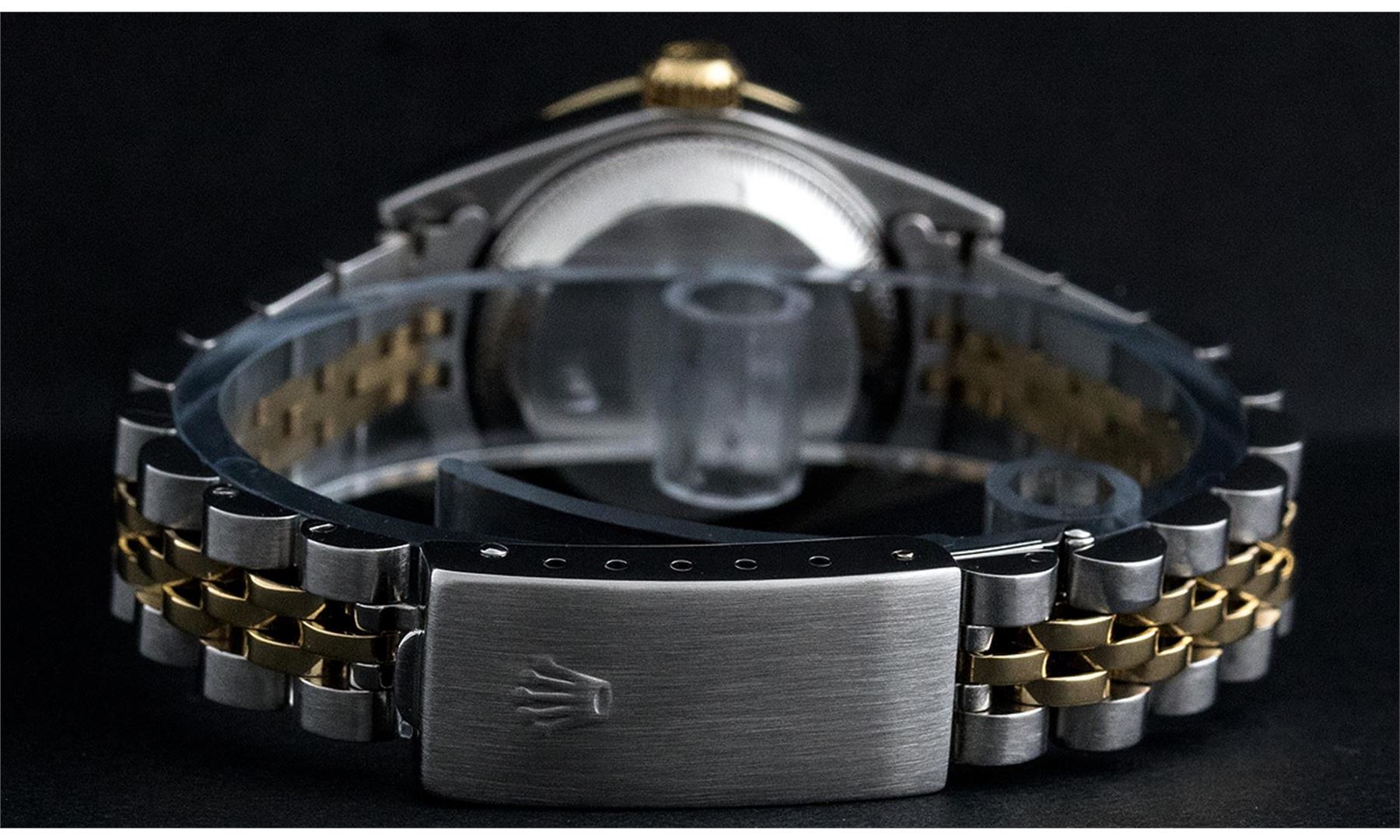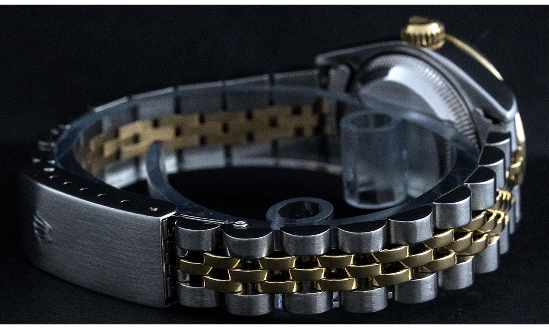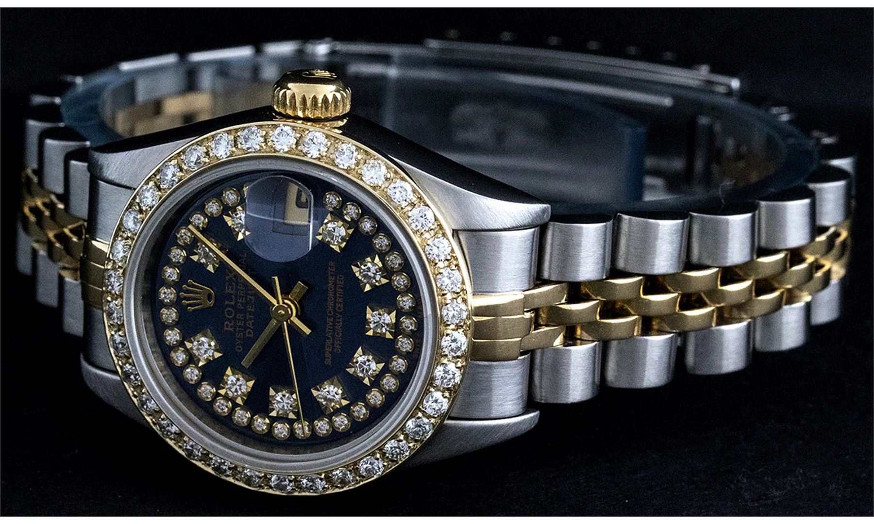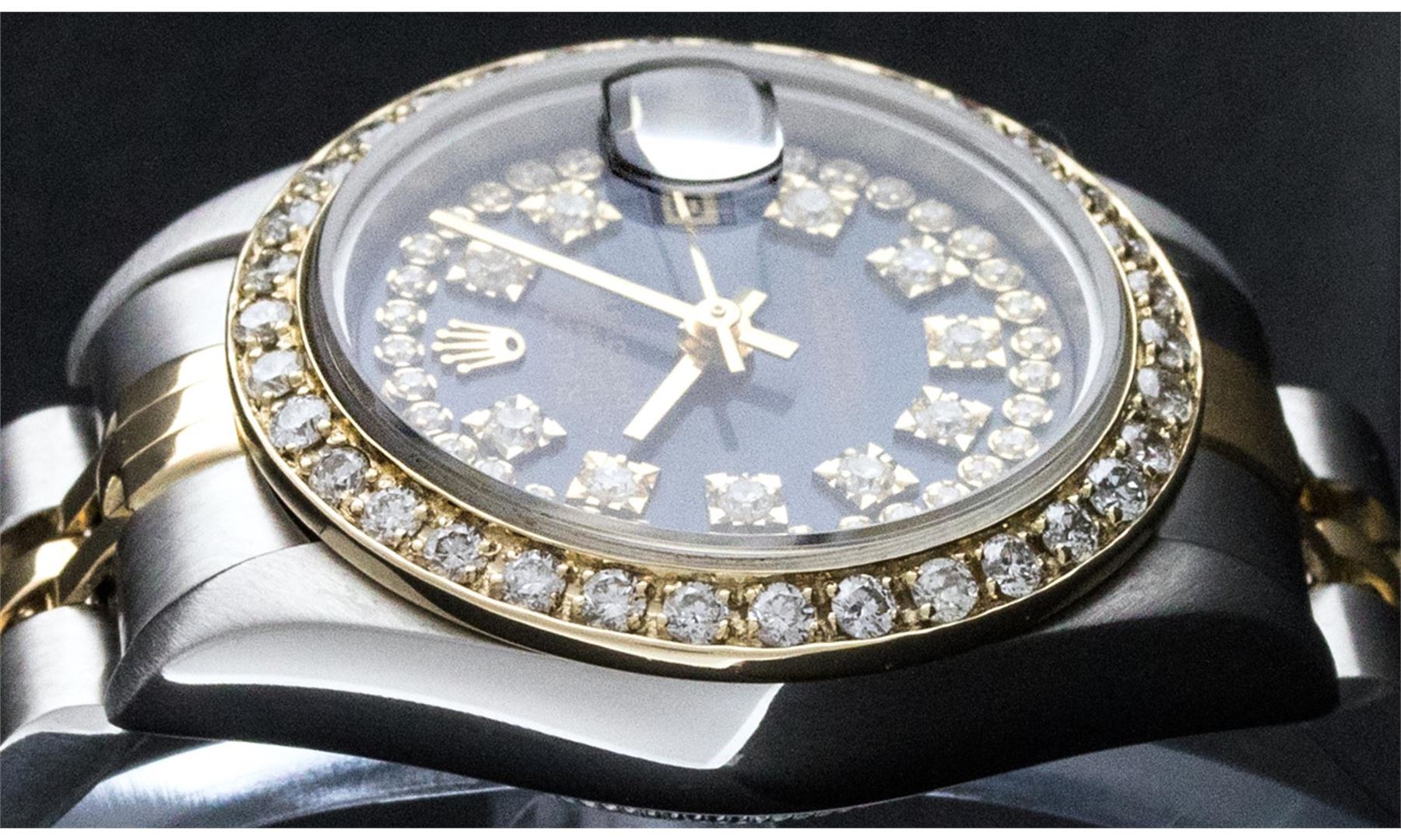 One Ladies Two Tone Rolex Datejust Polished, Serviced & Electronically Tested, 18K Yellow Gold & Stainless Steel Case No Hole Case:26mm, 18K Yellow Gold Crown, Custom Bezel: 18K Yellow Beadset Diamond Bezel, Diamond Count: 32 Diamond, Total Weight .70 Carat, Clarity: Si-VS, Color: G to H. Crystal: Synthetic Sapphire Cyclops Lens. Movement: Automatic Winding Movement Caliber 2235. Custom Dial: Blue String Diamond Dial. Diamond Count: 43 Diamonds In Dial, Clarity: Si-VS, Color: VVS. Date Window: 3 O'Clock Position Date Display, Quickset, Model: Datejust Condition: G-6 Extra Fine. Bracelet: Two Tone 18K Yellow Gold & Stainless Steel Jubilee. Bright Polish. 6.0 Inch Length, Adjustable. Standard Clasp, With Rolex Logo.
