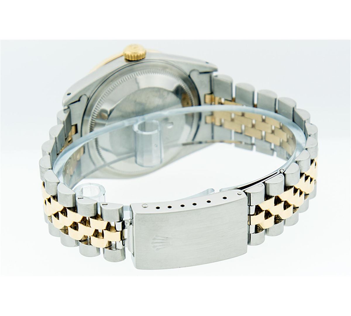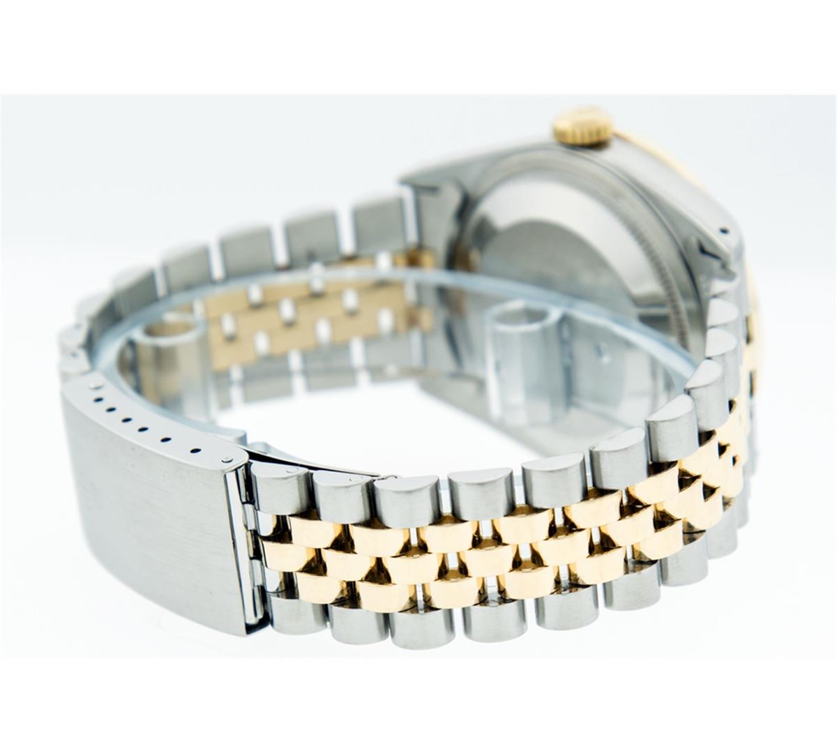 One Mens Two Tone Rolex Datejust Polished, Serviced & Electronically Tested, 14K Yellow Gold & Stainless Steel Case:36mm, 14K Yellow Gold Crown, Custom Bezel: 18K Yellow Gold Beadset Diamond Bezel, Diamond Count: 44 Diamonds, Total Weight 1.00 Carat, Clarity: Si-VS, Color: G to H. Custom Crystal: Synthetic Sapphire Cyclops Lens. Movement: Automatic Winding Movement Caliber 3035. Custom Dial: Blue VVS String Diamond Dial, Diamond Count: 58 Diamonds in Dial G To H In Color, VVS In Clarity. Date Window: 3 O'Clock Position Date Display, Quickset, Model: 16013 Condition: G-6 Extra Fine. Bracelet: Two Tone 14K Yellow Gold & Stainless Steel Jubilee. Bright Polish. 7.0 Inch Length, Adjustable. Standard Clasp, With Rolex Logo.
