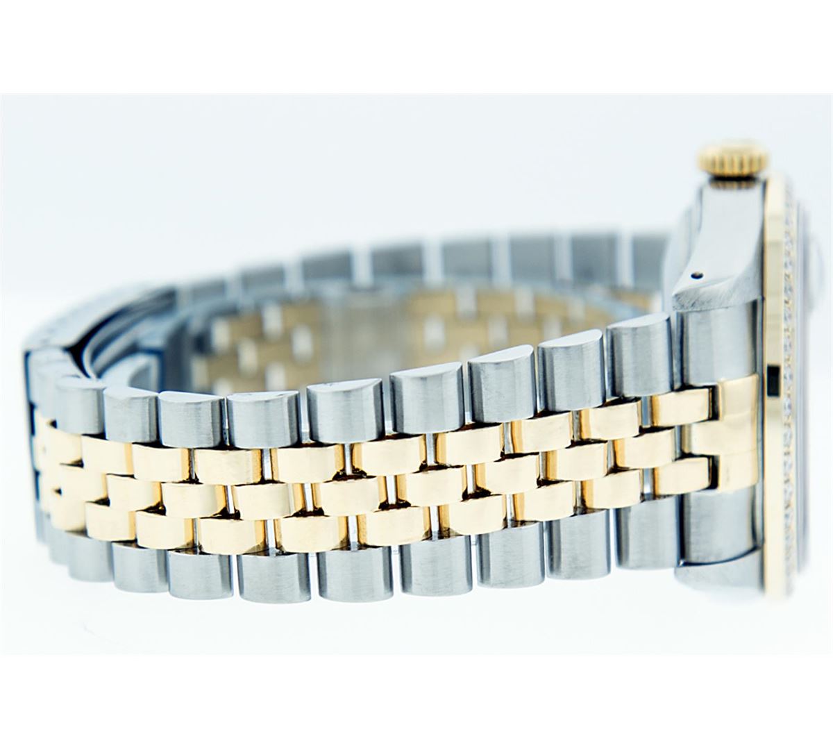 One Mens Two Tone Rolex Datejust Polished, Serviced & Electronically Tested, 14K Yellow Gold & Stainless Steel Case:36mm, 14K Yellow Gold Crown, Custom Bezel: 18K Yellow Gold Beadset Diamond Bezel, Diamond Count: 44 Diamonds, Total Weight 1.00 Carat, Clarity: Si-VS, Color: G to H. Custom Crystal: Synthetic Sapphire Cyclops Lens. Movement: Automatic Winding Movement Caliber 3035. Custom Dial: Blue VVS String Diamond Dial, Diamond Count: 58 Diamonds in Dial G To H In Color, VVS In Clarity. Date Window: 3 O'Clock Position Date Display, Quickset, Model: 16013 Condition: G-6 Extra Fine. Bracelet: Two Tone 14K Yellow Gold & Stainless Steel Jubilee. Bright Polish. 7.0 Inch Length, Adjustable. Standard Clasp, With Rolex Logo.