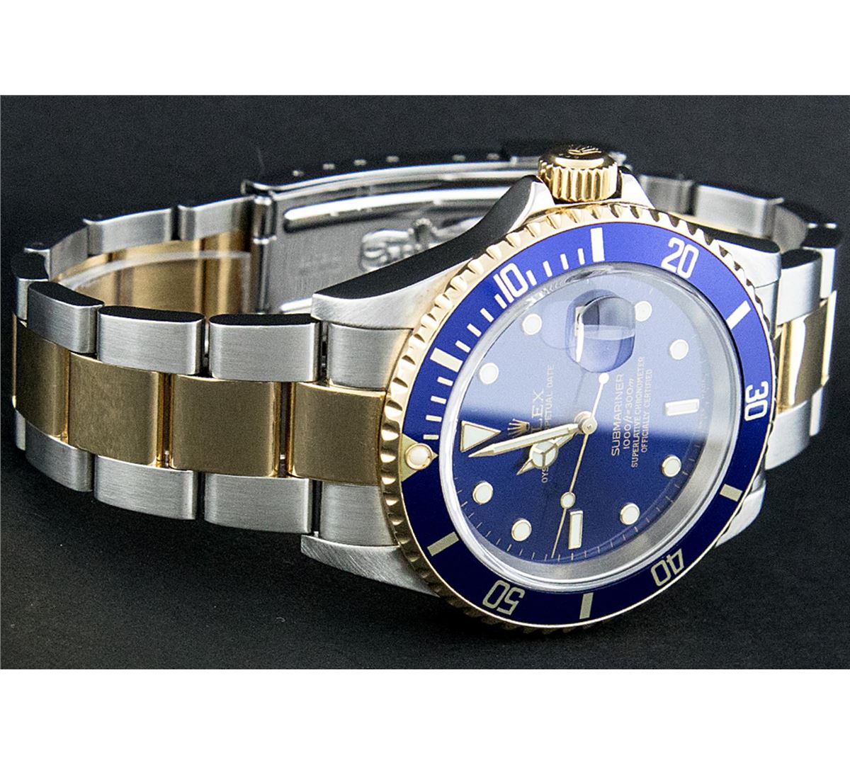 One Mens Rolex Two Tone 18K Yellow Gold And Stainless Steel Submariner With Date Polished, Serviced & Electronically Tested, Stainless Steel Case:41mm, 18K Yellow Gold Crown, Bezel: 18K Yellow Gold Bezel With Blue Insert. Crystal: Synthetic Sapphire Cyclops Lens. Movement: Automatic Winding Movement Caliber 3135. Dial: Blue Submariner Dial. Date Window: 3 O'Clock Position Date Display, Model: Submariner 16613, Quickset, Condition: G-6 Extra Fine. Bracelet: 18K Yellow Gold & Stainless Steel Oyster Gold Through The Buckle. Bright Polish & Satin Finish. 7.0 Inch Length, Adjustable. Standard Clasp, With Rolex Logo. Comes with 6 month warranty.
