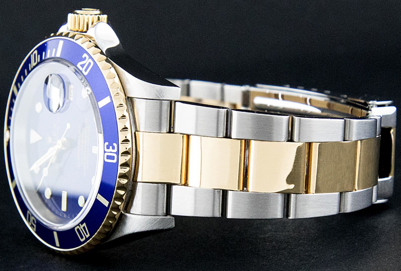 One Mens Rolex Two Tone 18K Yellow Gold And Stainless Steel Submariner With Date Polished, Serviced & Electronically Tested, Stainless Steel Case:41mm, 18K Yellow Gold Crown, Bezel: 18K Yellow Gold Bezel With Blue Insert. Crystal: Synthetic Sapphire Cyclops Lens. Movement: Automatic Winding Movement Caliber 3135. Dial: Blue Submariner Dial. Date Window: 3 O'Clock Position Date Display, Model: Submariner 16613, Quickset, Condition: G-6 Extra Fine. Bracelet: 18K Yellow Gold & Stainless Steel Oyster Gold Through The Buckle. Bright Polish & Satin Finish. 7.0 Inch Length, Adjustable. Standard Clasp, With Rolex Logo. Comes with 6 month warranty.