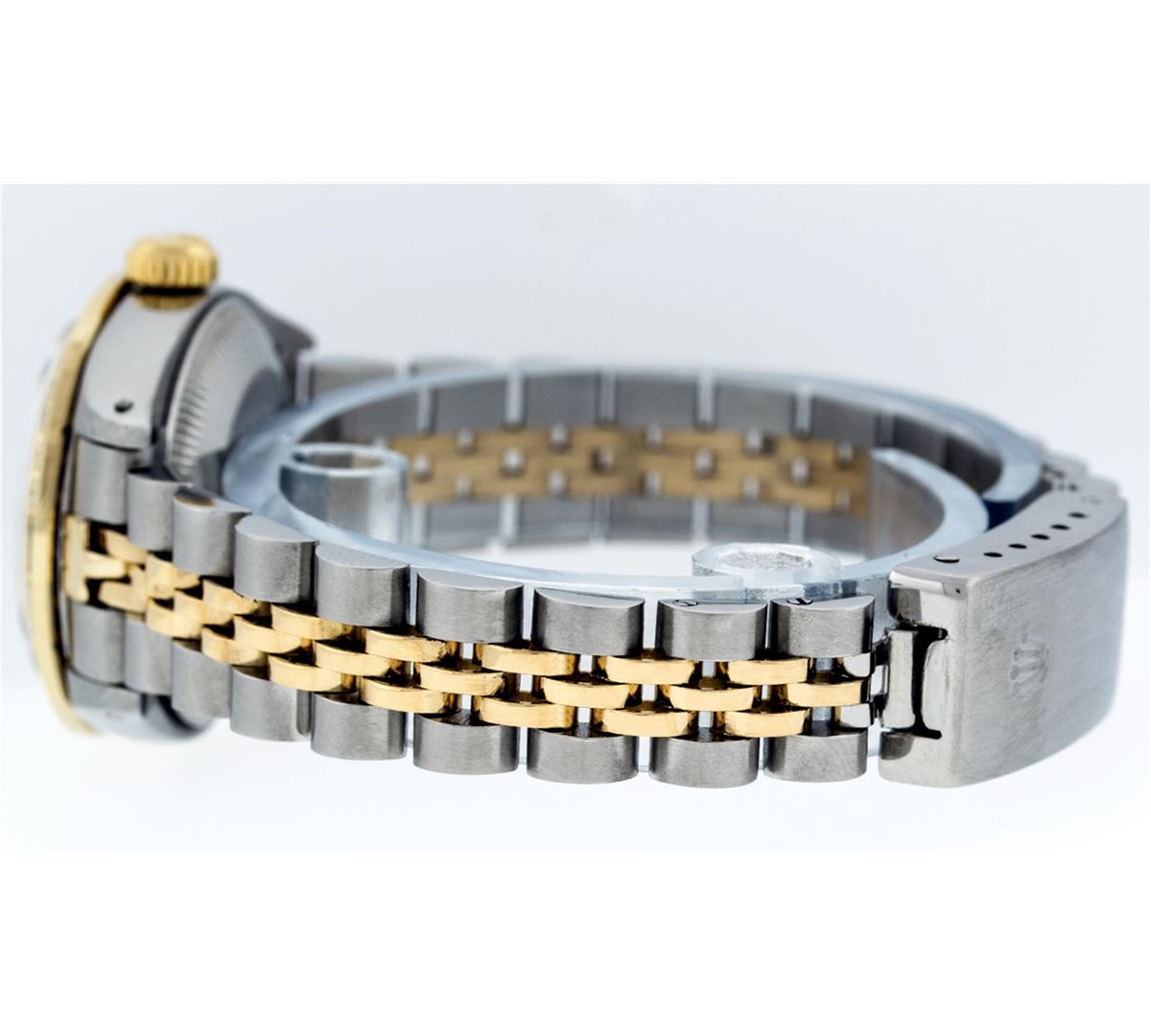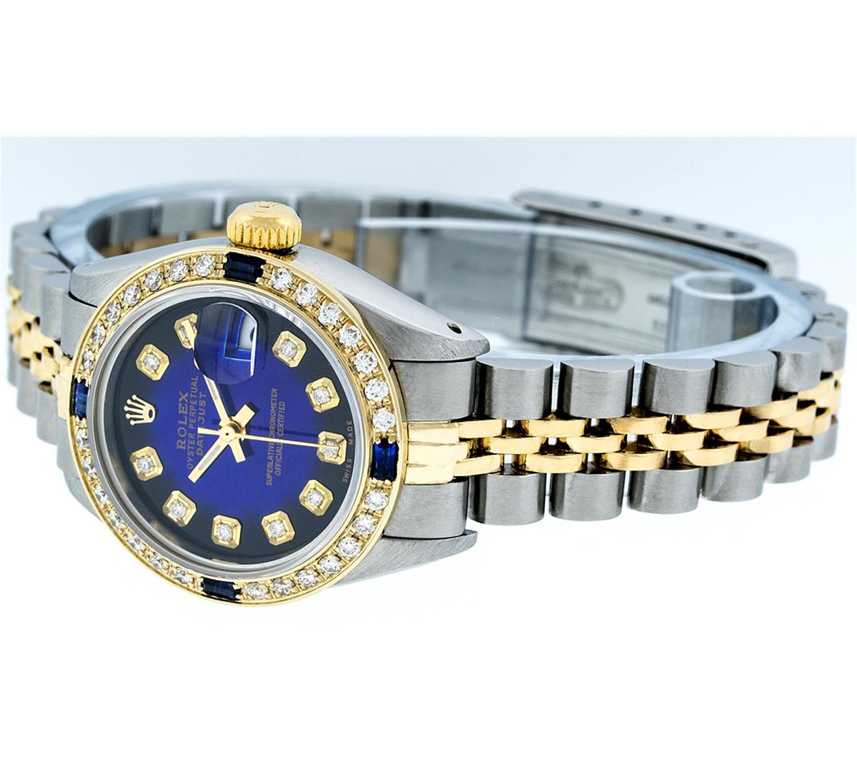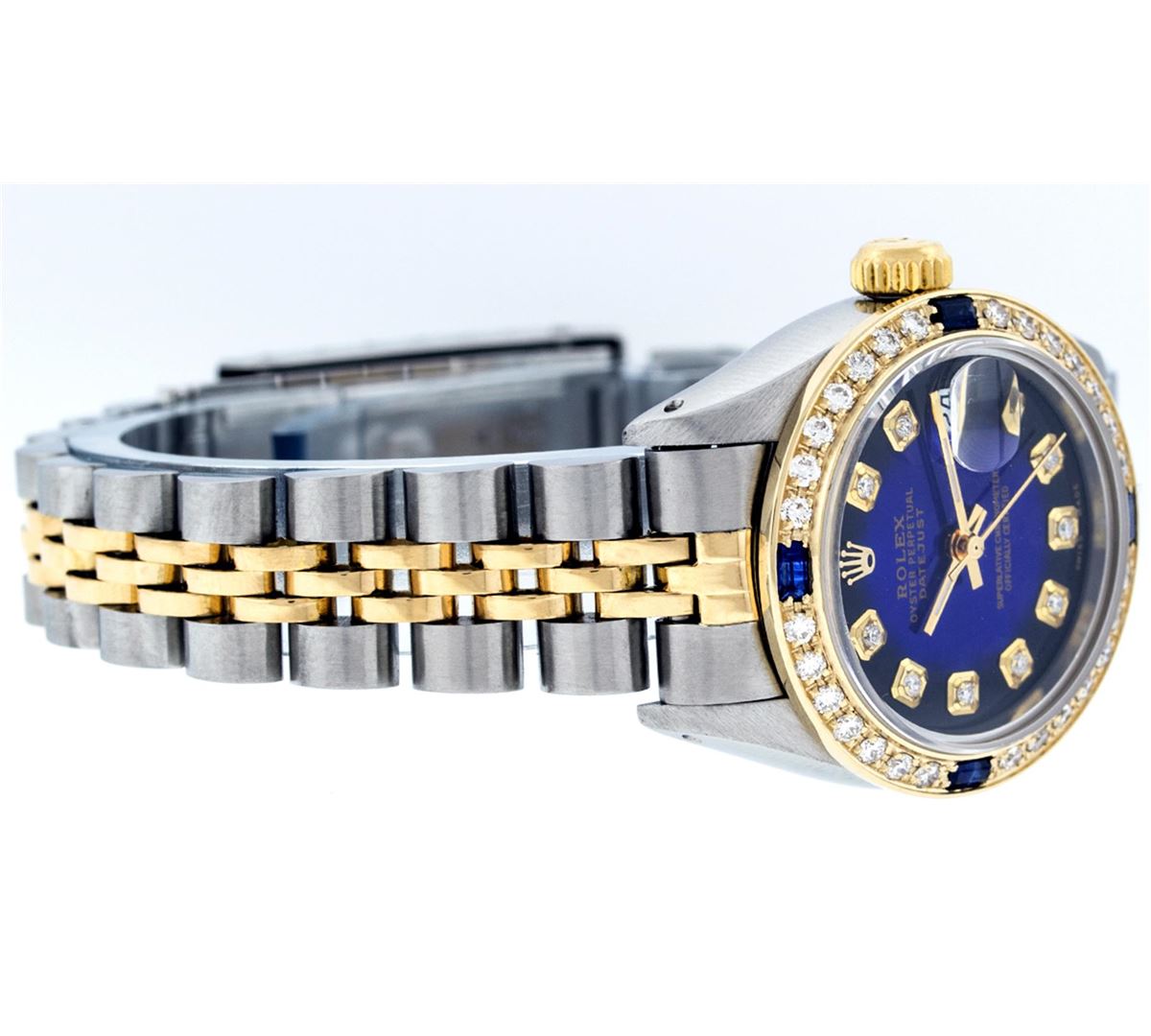 One Ladies Two Tone Rolex Datejust Polished, Serviced & Electronically Tested, 14K Yellow Gold & Stainless Steel Case:26mm, 14K Yellow Gold Crown, Custom Bezel: 18K Yellow Gold Sapphire Beadset Diamond Bezel, Diamond + Gem Count: 28 Diamonds + 4 Sapphires Total Weight .70 Carat, Clarity: Si-VS, Color: G to H. Custom Crystal: Synthetic Sapphire Cyclops Lens. Movement: Automatic Winding Movement Caliber 2030. Custom Dial: Blue Vignette Dial Set With Diamond Hour Markers, 10 Diamond in Dial G To H In Color, Si-VS Clarity. Date Window: 3 O'Clock Position Date Display, Model: Datejust, Condition: G-6 Extra Fine. Bracelet: Two Tone 14K Yellow Gold & Stainless Steel Jubilee. Bright Polish. 5.5 Inch Length, Adjustable. Standard Clasp, With Rolex Logo. Comes with a 6 month warranty card.