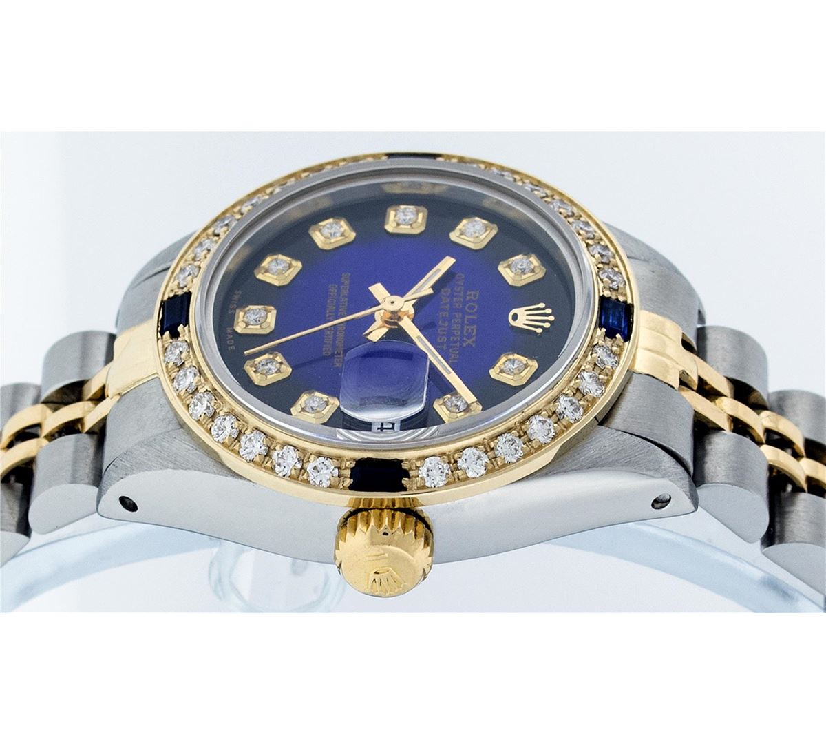 One Ladies Two Tone Rolex Datejust Polished, Serviced & Electronically Tested, 14K Yellow Gold & Stainless Steel Case:26mm, 14K Yellow Gold Crown, Custom Bezel: 18K Yellow Gold Sapphire Beadset Diamond Bezel, Diamond + Gem Count: 28 Diamonds + 4 Sapphires Total Weight .70 Carat, Clarity: Si-VS, Color: G to H. Custom Crystal: Synthetic Sapphire Cyclops Lens. Movement: Automatic Winding Movement Caliber 2030. Custom Dial: Blue Vignette Dial Set With Diamond Hour Markers, 10 Diamond in Dial G To H In Color, Si-VS Clarity. Date Window: 3 O'Clock Position Date Display, Model: Datejust, Condition: G-6 Extra Fine. Bracelet: Two Tone 14K Yellow Gold & Stainless Steel Jubilee. Bright Polish. 5.5 Inch Length, Adjustable. Standard Clasp, With Rolex Logo. Comes with a 6 month warranty card.