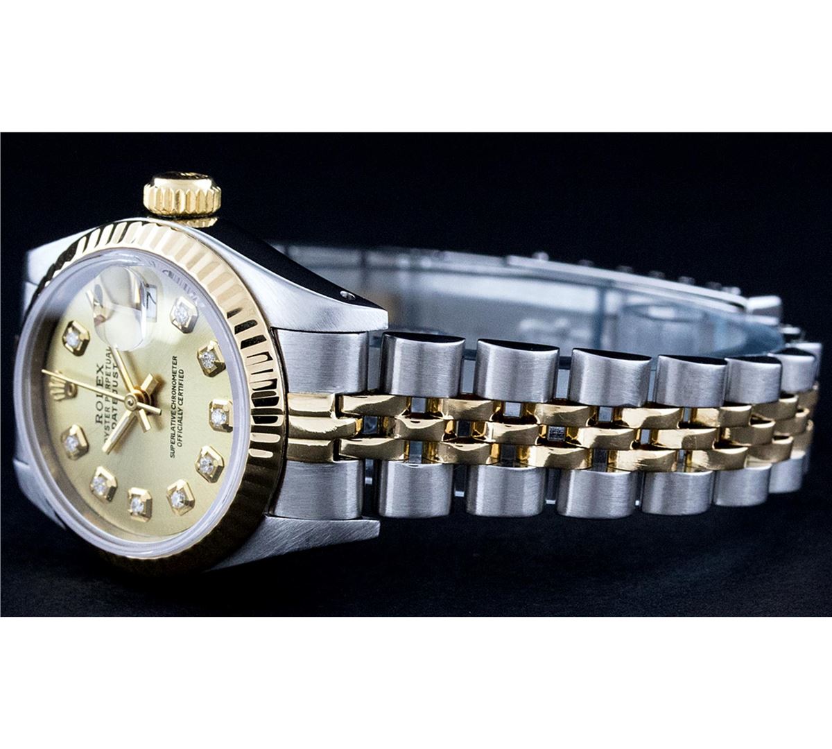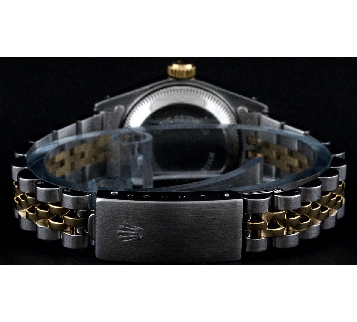 One Ladies Two Tone Rolex Datejust Polished, Serviced & Electronically Tested, 14K Yellow Gold & Stainless Steel Case:26mm, 14K Yellow Gold Crown, Bezel: 14K Yellow Gold Fluted Bezel. Custom Crystal: Acrylic Cyclops Lens. Movement: Automatic Winding Movement Caliber 2030. Custom Champagne With Diamond Hour Markers, Diamond Count: 10 Diamonds, Color: G to H, Clarity: VS2-SI1. Date Window: 3 O'Clock Position Date Display, Non Quickset, Model: 6917 Condition: G-6 Extra Fine. Bracelet: Two Tone 14K Yellow Gold & Stainless Steel Jubilee. Bright Polish. 5.5 Inch Length, Adjustable. Standard Clasp, With Rolex Logo.