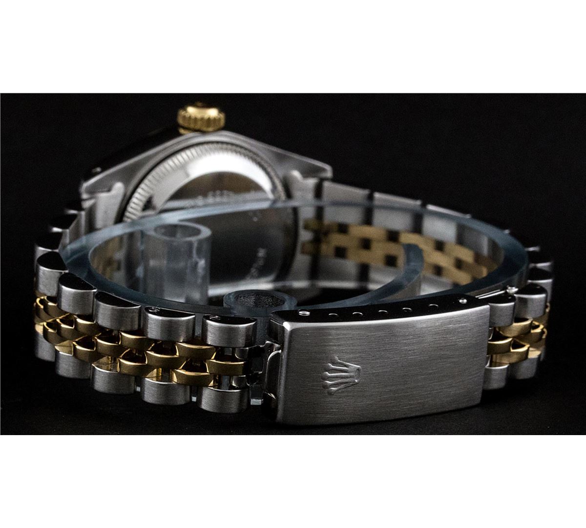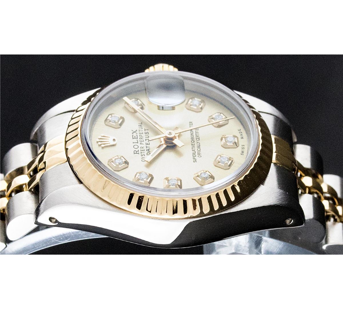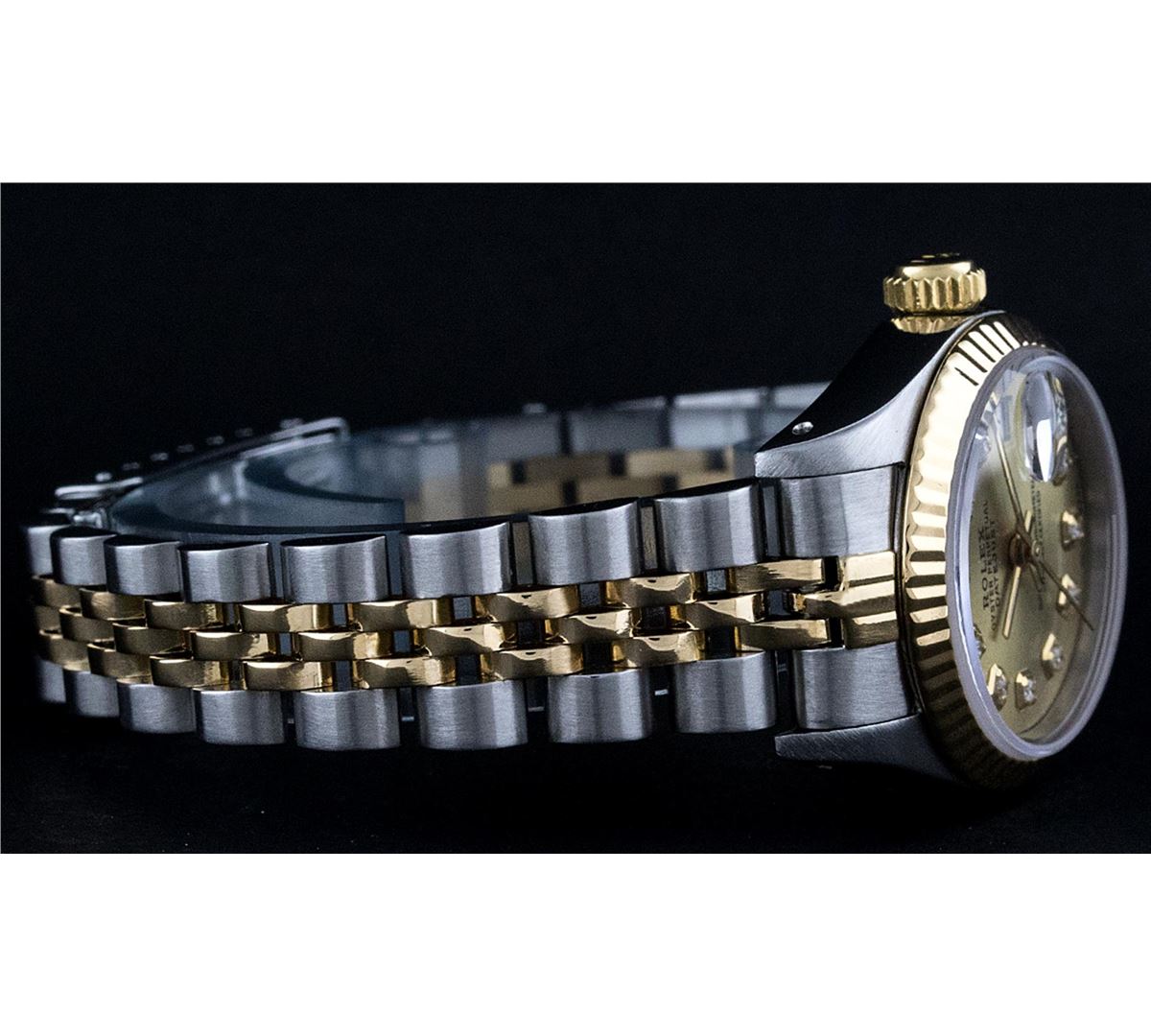 One Ladies Two Tone Rolex Datejust Polished, Serviced & Electronically Tested, 14K Yellow Gold & Stainless Steel Case:26mm, 14K Yellow Gold Crown, Bezel: 14K Yellow Gold Fluted Bezel. Custom Crystal: Acrylic Cyclops Lens. Movement: Automatic Winding Movement Caliber 2030. Custom Champagne With Diamond Hour Markers, Diamond Count: 10 Diamonds, Color: G to H, Clarity: VS2-SI1. Date Window: 3 O'Clock Position Date Display, Non Quickset, Model: 6917 Condition: G-6 Extra Fine. Bracelet: Two Tone 14K Yellow Gold & Stainless Steel Jubilee. Bright Polish. 5.5 Inch Length, Adjustable. Standard Clasp, With Rolex Logo.