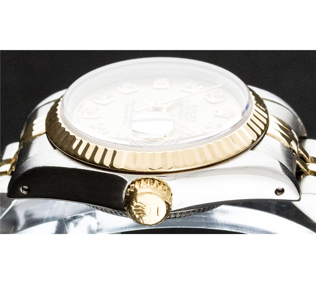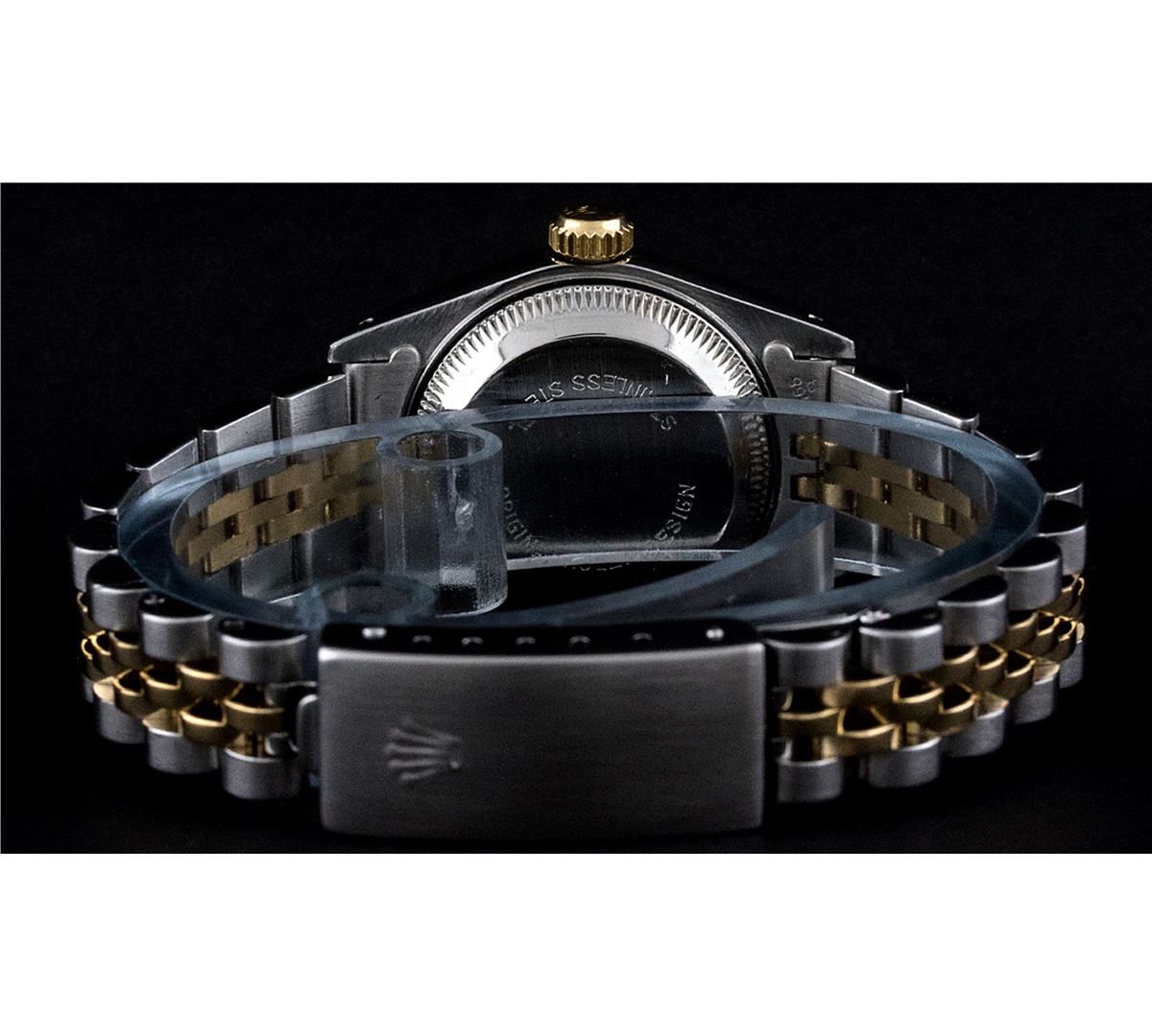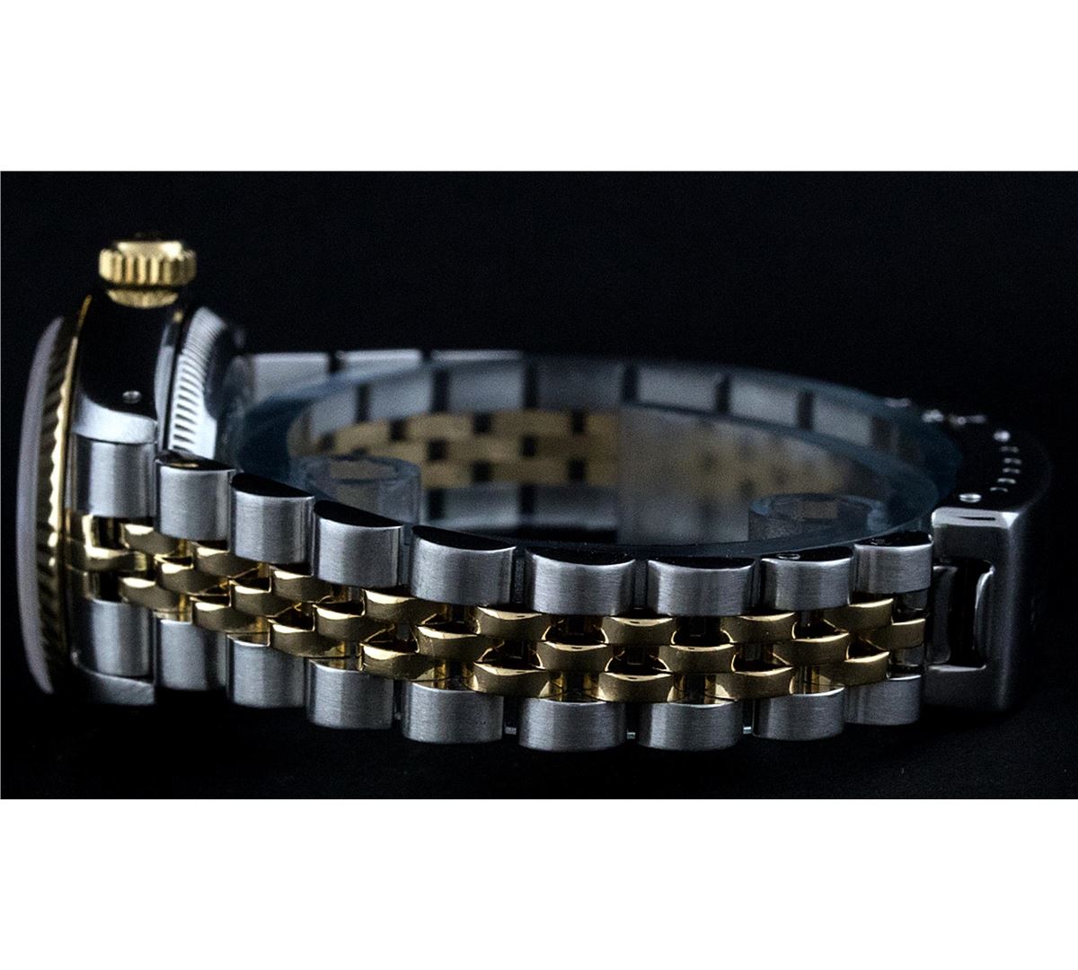 One Ladies Two Tone Rolex Datejust Polished, Serviced & Electronically Tested, 14K Yellow Gold & Stainless Steel Case:26mm, 14K Yellow Gold Crown, Bezel: 14K Yellow Gold Fluted Bezel. Custom Crystal: Acrylic Cyclops Lens. Movement: Automatic Winding Movement Caliber 2030. Custom Champagne With Diamond Hour Markers, Diamond Count: 10 Diamonds, Color: G to H, Clarity: VS2-SI1. Date Window: 3 O'Clock Position Date Display, Non Quickset, Model: 6917 Condition: G-6 Extra Fine. Bracelet: Two Tone 14K Yellow Gold & Stainless Steel Jubilee. Bright Polish. 5.5 Inch Length, Adjustable. Standard Clasp, With Rolex Logo.