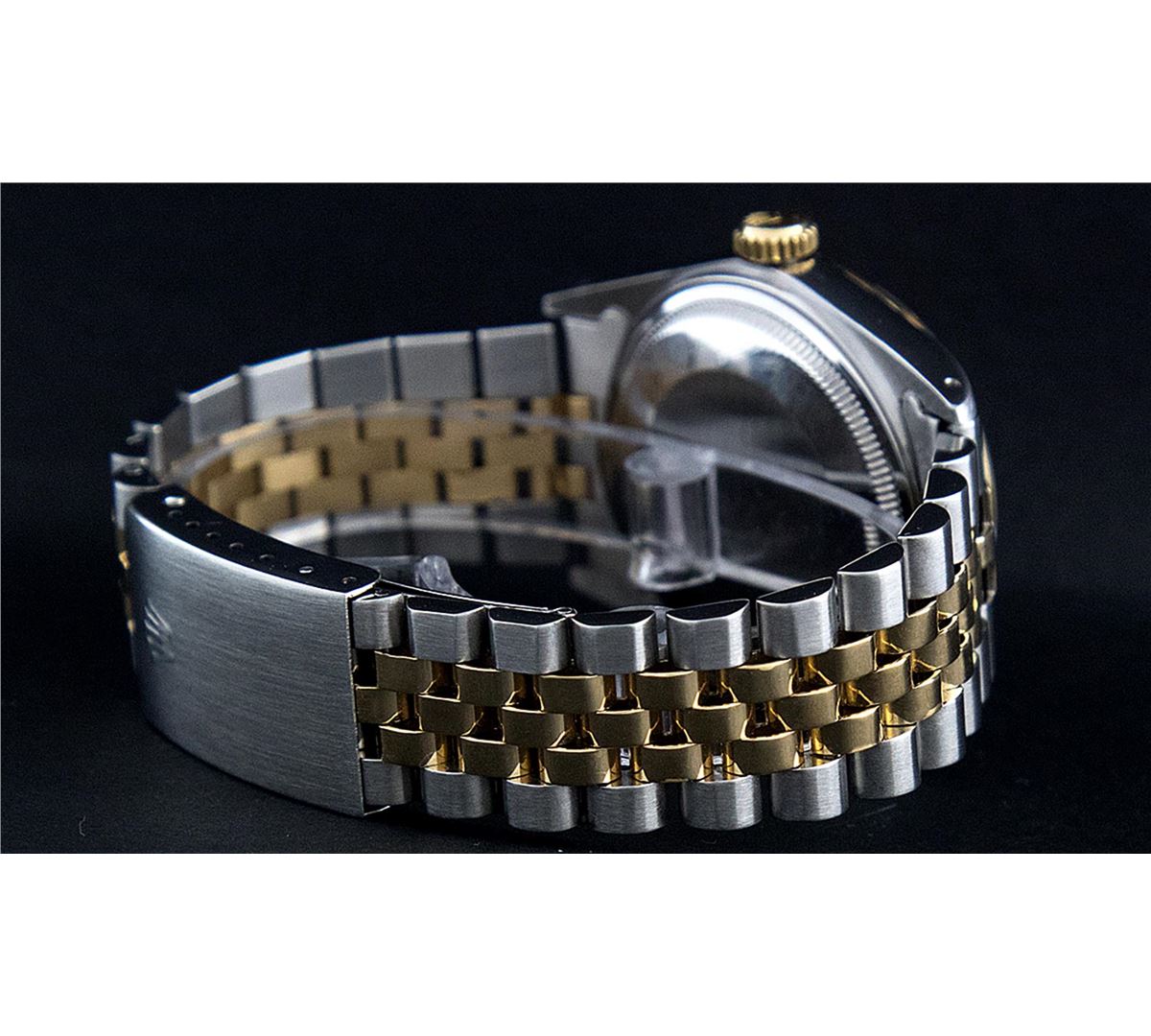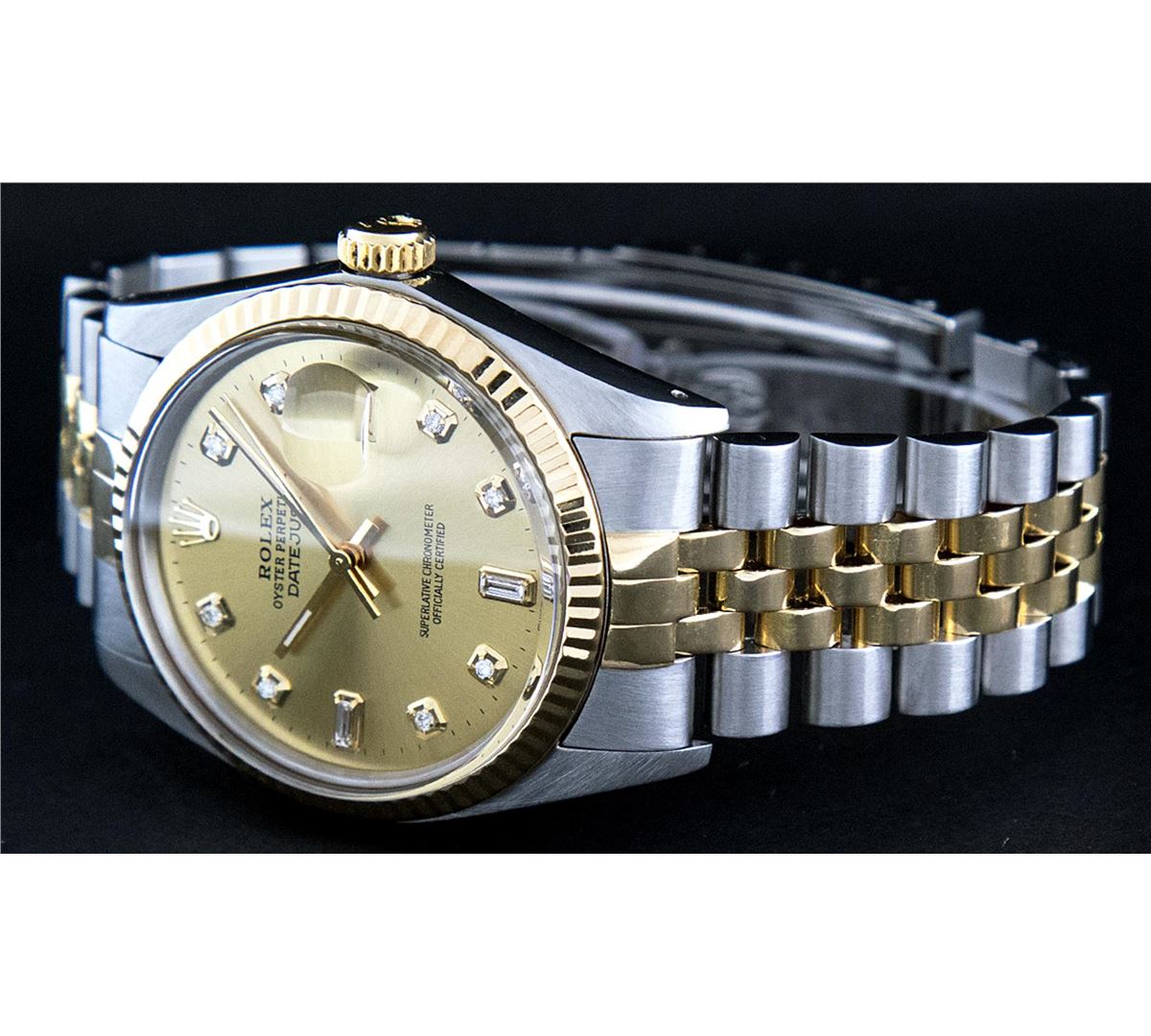 One Mens Two Tone Rolex Datejust Polished, Serviced & Electronically Tested, 14K Yellow Gold & Stainless Steel Case:36mm, 14K Yellow Gold Crown, Bezel: 18K Yellow Gold Fluted Bezel. Custom Crystal: Acrylic Cyclops Lens. Movement: Automatic Winding Movement Caliber 3035. Custom Dial: Champagne Dial Set With Diamond Hour Markers and Baguette Diamonds On The Six And Nine Hour Markers, 8 Diamonds + 2 Baguettes in Dial G To H In Color, Si-VS Clarity. Date Window: 3 O'Clock Position Date Display, Quickset, Model: 16013 Condition: G-6 Extra Fine. Bracelet: Two Tone 14K Yellow Gold & Stainless Steel Jubilee. Bright Polish. 7.0 Inch Length, Adjustable. Standard Clasp, With Rolex Logo.