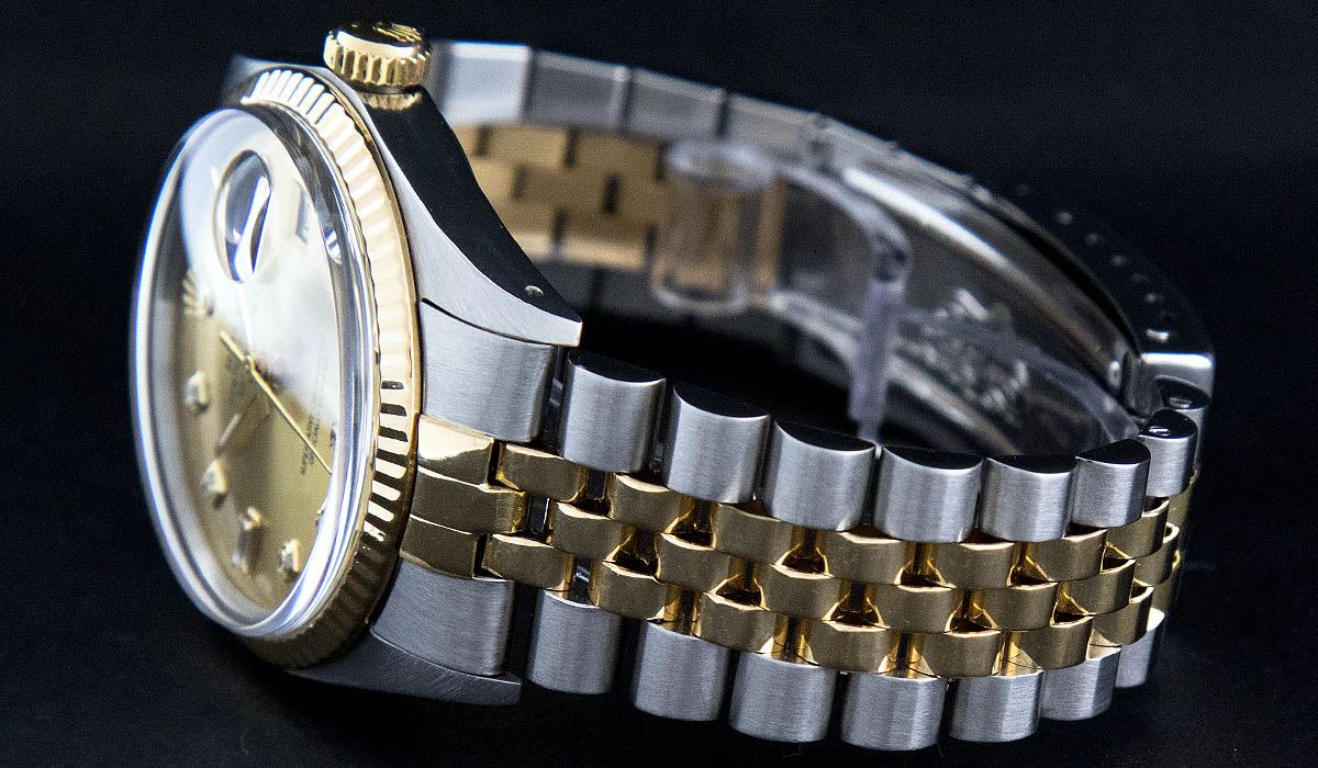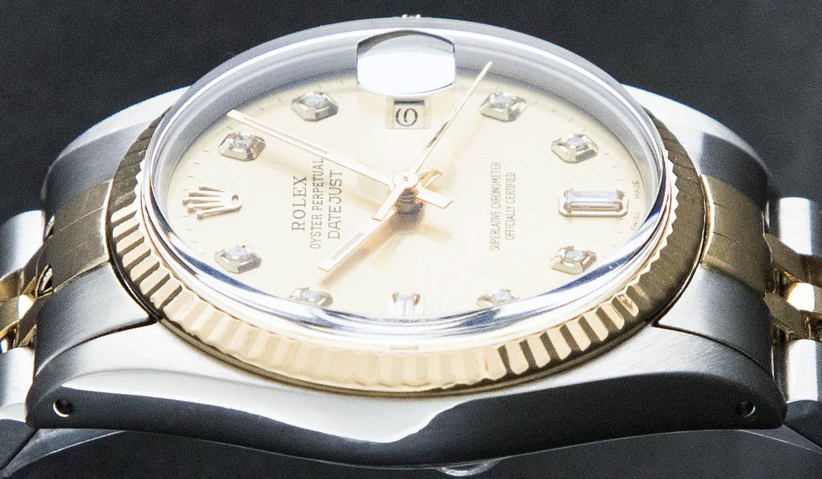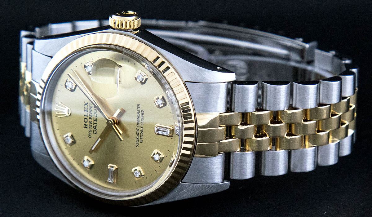 One Mens Two Tone Rolex Datejust Polished, Serviced & Electronically Tested, 14K Yellow Gold & Stainless Steel Case:36mm, 14K Yellow Gold Crown, Bezel: 18K Yellow Gold Fluted Bezel. Custom Crystal: Acrylic Cyclops Lens. Movement: Automatic Winding Movement Caliber 3035. Custom Dial: Champagne Dial Set With Diamond Hour Markers and Baguette Diamonds On The Six And Nine Hour Markers, 8 Diamonds + 2 Baguettes in Dial G To H In Color, Si-VS Clarity. Date Window: 3 O'Clock Position Date Display, Quickset, Model: 16013 Condition: G-6 Extra Fine. Bracelet: Two Tone 14K Yellow Gold & Stainless Steel Jubilee. Bright Polish. 7.0 Inch Length, Adjustable. Standard Clasp, With Rolex Logo.