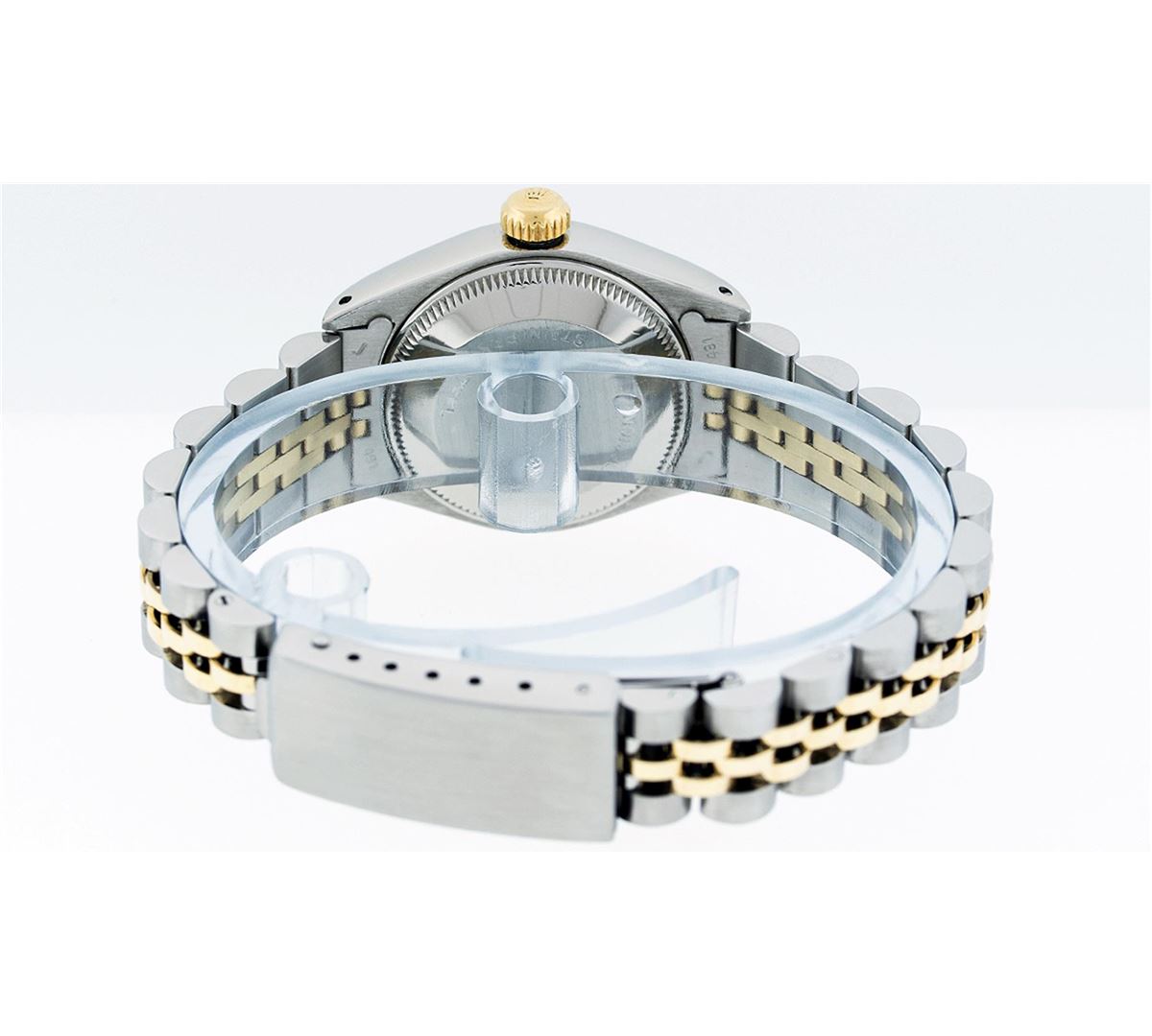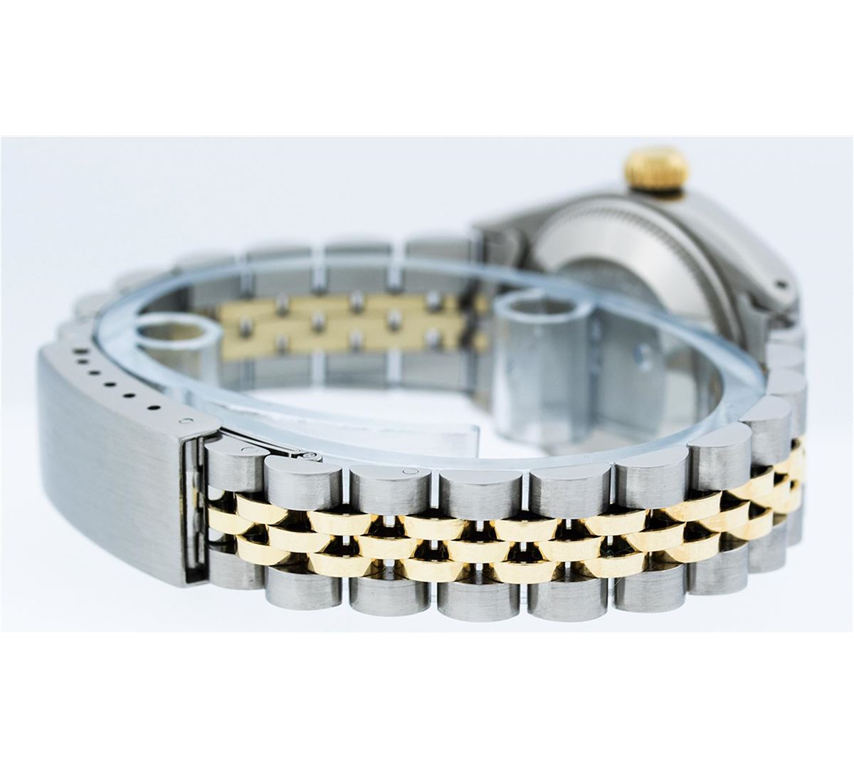 One Ladies Two Tone Rolex Datejust Polished, Serviced & Electronically Tested, 14K Yellow Gold & Stainless Steel Case:26mm, 14K Yellow Gold Crown, Bezel: 14K Yellow Gold Fluted Bezel. Custom Crystal: Acrylic Cyclops Lens. Movement: Automatic Winding Movement Caliber 2030. Dial: Champagne Index With Luminescent Dots. Date Window: 3 O'Clock Position Date Display, Model: Datejust. Condition: G-6 Extra Fine. Bracelet: Two Tone 14K Yellow Gold & Stainless Steel Jubilee. Bright Polish. 5.5 Inch Length, Adjustable. Standard Clasp, With Rolex Logo. Comes with a 6 month warranty card.