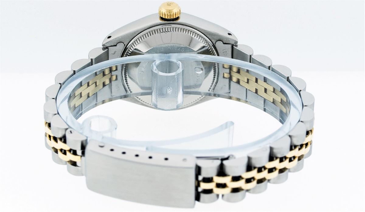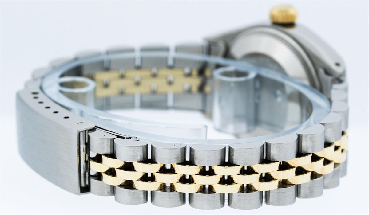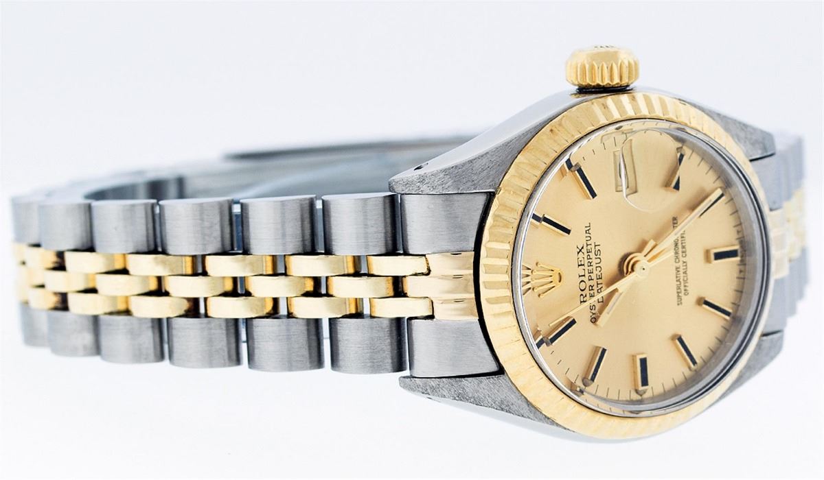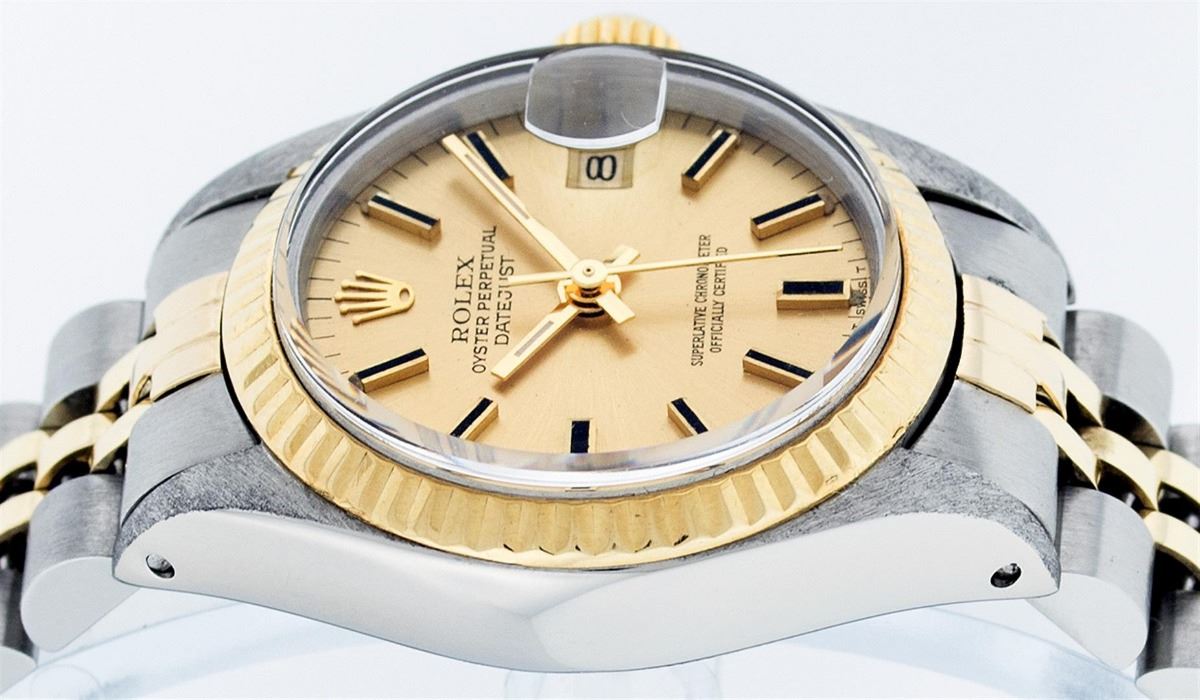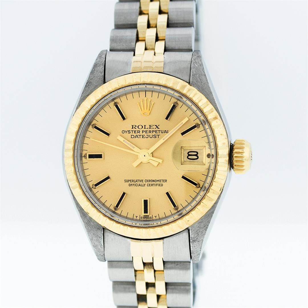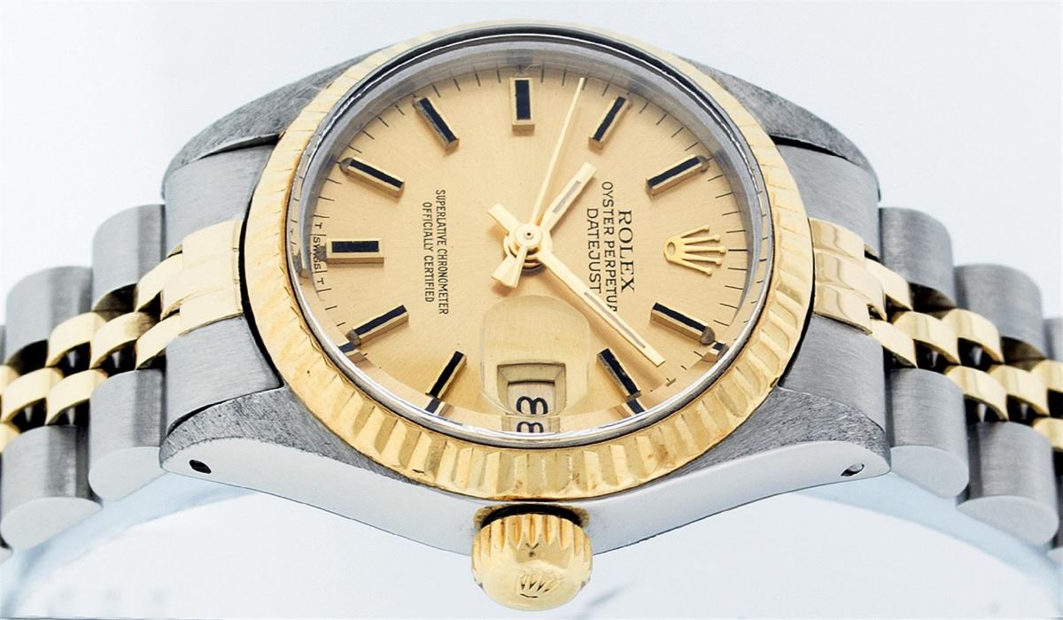 One Ladies Two Tone Rolex Datejust Polished, Serviced & Electronically Tested, 14K Yellow Gold & Stainless Steel Case:26mm, 14K Yellow Gold Crown, Bezel: 14K Yellow Gold Fluted Bezel. Custom Crystal: Acrylic Cyclops Lens. Movement: Automatic Winding Movement Caliber 2030. Dial: Champagne Index With Luminescent Dots. Date Window: 3 O'Clock Position Date Display, Model: Datejust. Condition: G-6 Extra Fine. Bracelet: Two Tone 14K Yellow Gold & Stainless Steel Jubilee. Bright Polish. 5.5 Inch Length, Adjustable. Standard Clasp, With Rolex Logo. Comes with a 6 month warranty card.