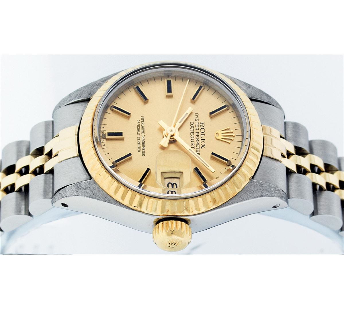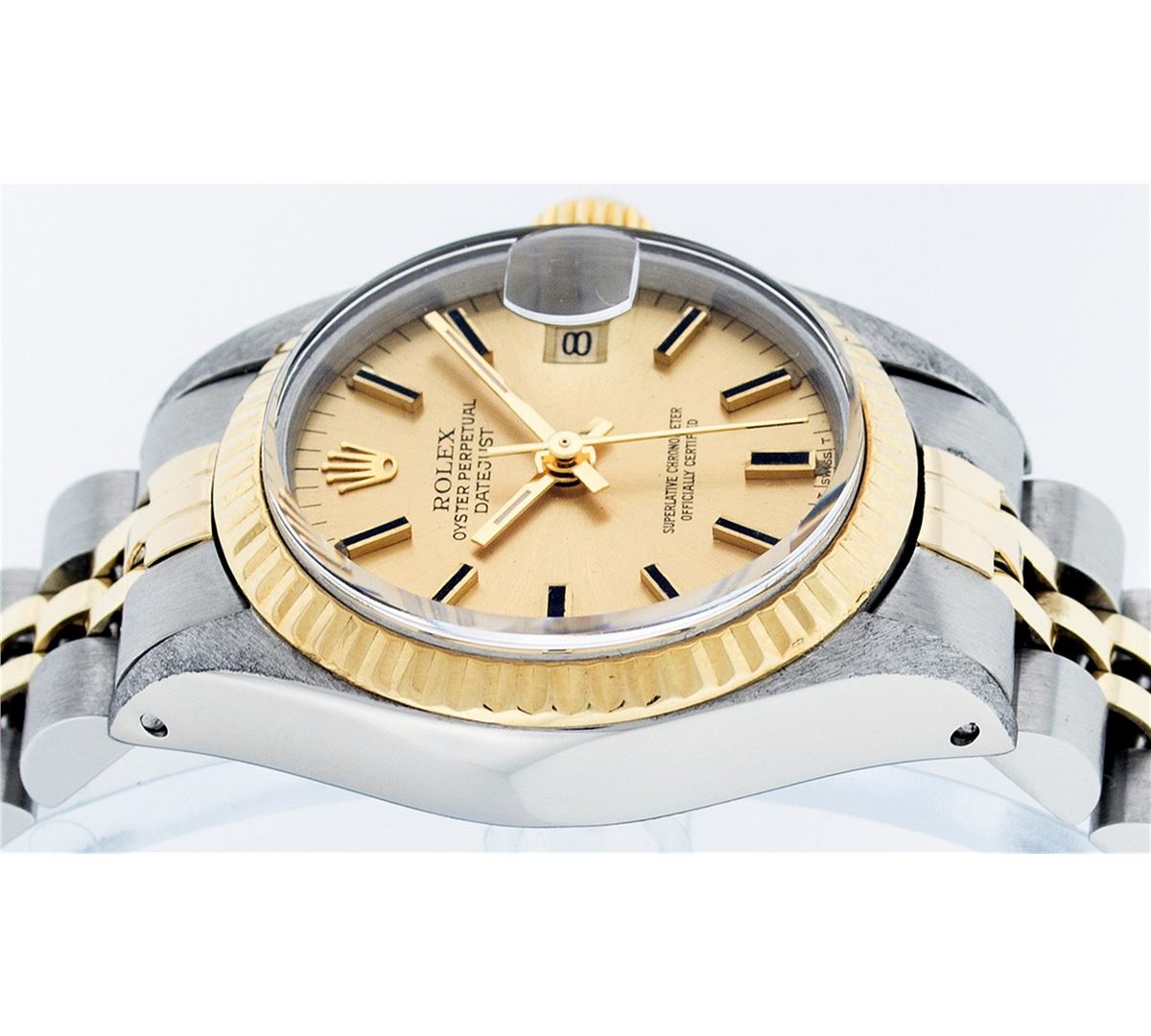 One Ladies Two Tone Rolex Datejust Polished, Serviced & Electronically Tested, 14K Yellow Gold & Stainless Steel Case:26mm, 14K Yellow Gold Crown, Bezel: 14K Yellow Gold Fluted Bezel. Custom Crystal: Acrylic Cyclops Lens. Movement: Automatic Winding Movement Caliber 2030. Dial: Champagne Index With Luminescent Dots. Date Window: 3 O'Clock Position Date Display, Model: Datejust. Condition: G-6 Extra Fine. Bracelet: Two Tone 14K Yellow Gold & Stainless Steel Jubilee. Bright Polish. 5.5 Inch Length, Adjustable. Standard Clasp, With Rolex Logo. Comes with a 6 month warranty card.