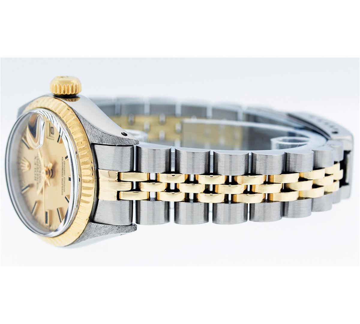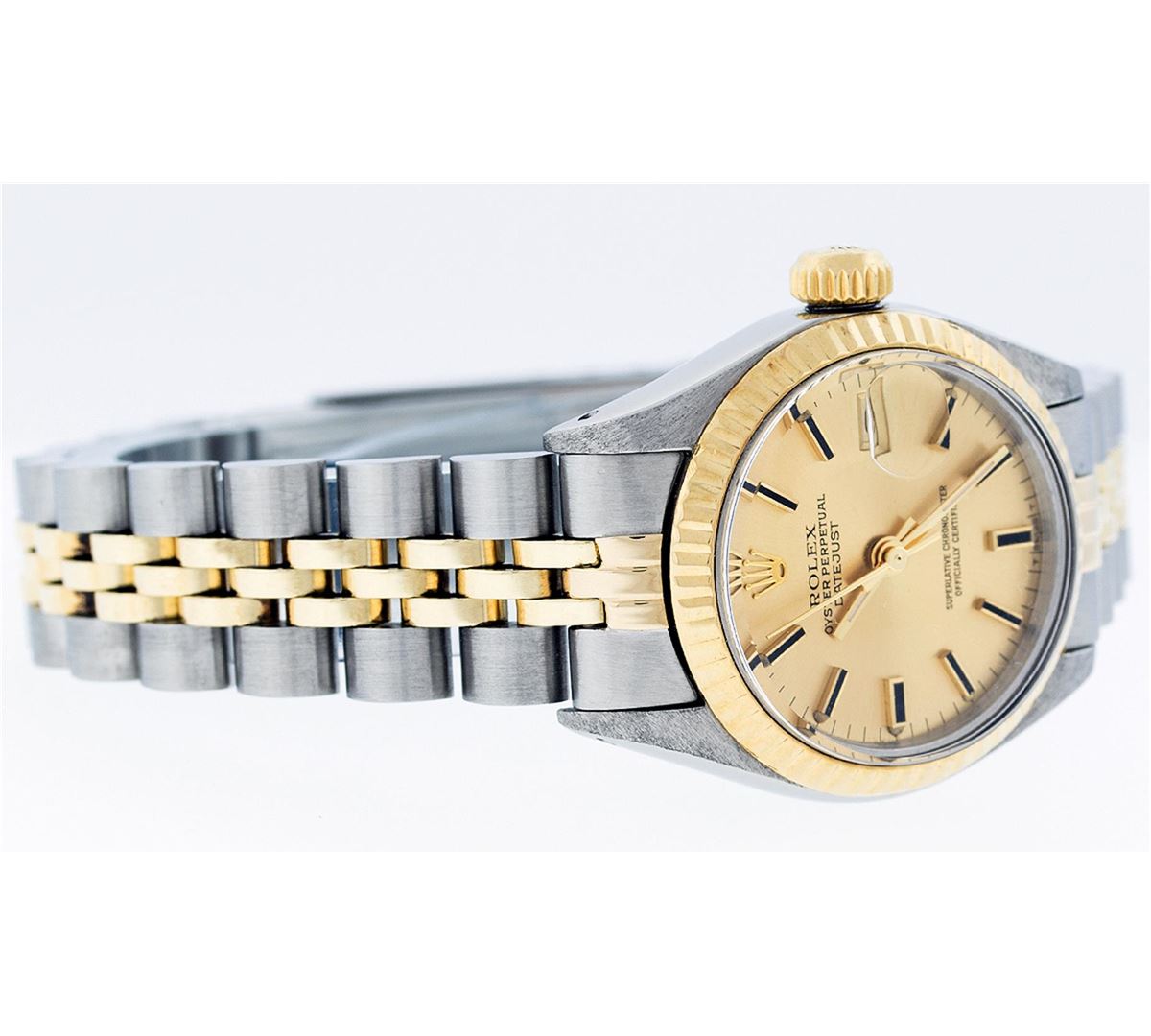 One Ladies Two Tone Rolex Datejust Polished, Serviced & Electronically Tested, 14K Yellow Gold & Stainless Steel Case:26mm, 14K Yellow Gold Crown, Bezel: 14K Yellow Gold Fluted Bezel. Custom Crystal: Acrylic Cyclops Lens. Movement: Automatic Winding Movement Caliber 2030. Dial: Champagne Index With Luminescent Dots. Date Window: 3 O'Clock Position Date Display, Model: Datejust. Condition: G-6 Extra Fine. Bracelet: Two Tone 14K Yellow Gold & Stainless Steel Jubilee. Bright Polish. 5.5 Inch Length, Adjustable. Standard Clasp, With Rolex Logo. Comes with a 6 month warranty card.