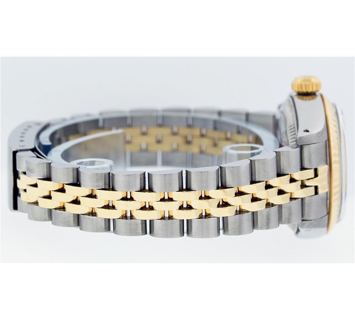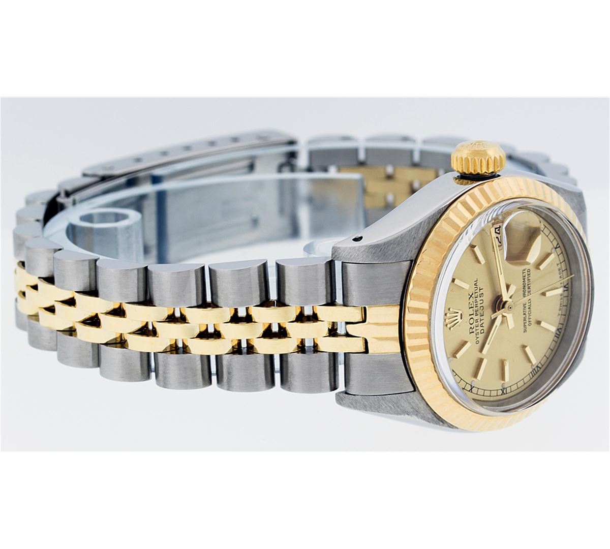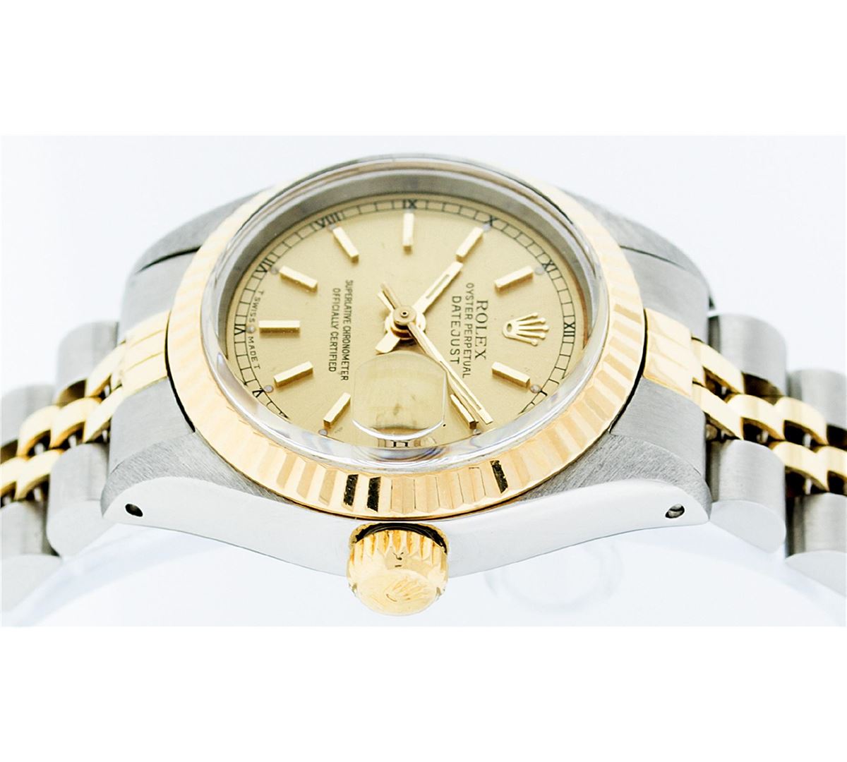 One Ladies Two Tone Rolex Datejust Polished, Serviced & Electronically Tested, 14K Yellow Gold & Stainless Steel Case:26mm, 14K Yellow Gold Crown, Bezel: 14K Yellow Gold Fluted Bezel. Custom Crystal: Acrylic Cyclops Lens. Movement: Automatic Winding Movement Caliber 2030. Custom Dial: Champagne Index With Square Roman Track. Date Window: 3 O'Clock Position Date Display, Model: Datejust. Condition: G-6 Extra Fine. Bracelet: Two Tone 14K Yellow Gold & Stainless Steel Jubilee Band. Bright Polish. 6.0 Inch Length, Adjustable. Standard Clasp, With Rolex Logo. Comes with 6 month warranty.