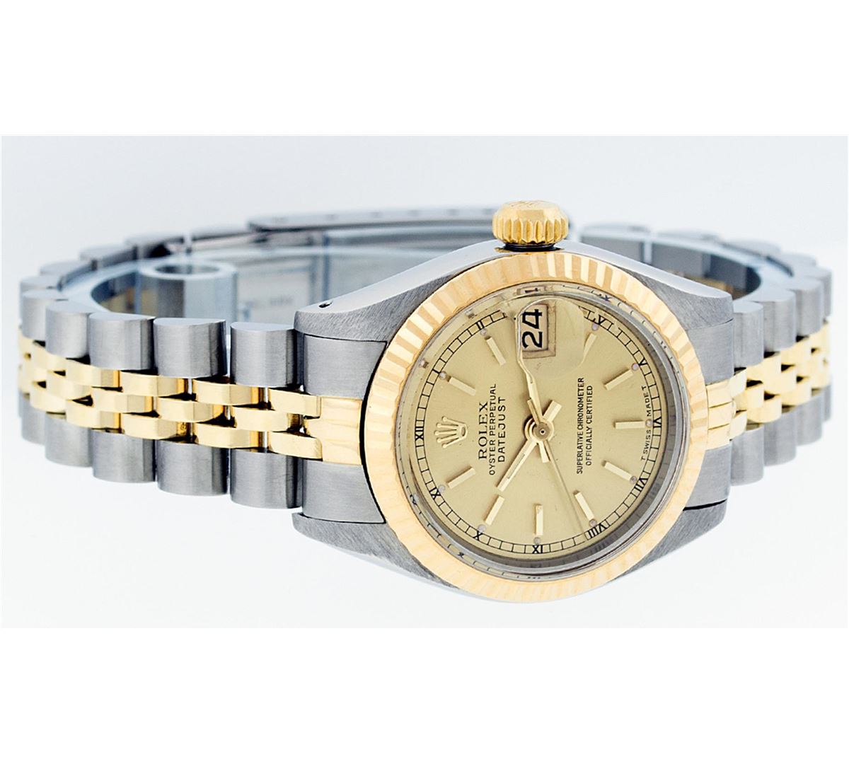 One Ladies Two Tone Rolex Datejust Polished, Serviced & Electronically Tested, 14K Yellow Gold & Stainless Steel Case:26mm, 14K Yellow Gold Crown, Bezel: 14K Yellow Gold Fluted Bezel. Custom Crystal: Acrylic Cyclops Lens. Movement: Automatic Winding Movement Caliber 2030. Custom Dial: Champagne Index With Square Roman Track. Date Window: 3 O'Clock Position Date Display, Model: Datejust. Condition: G-6 Extra Fine. Bracelet: Two Tone 14K Yellow Gold & Stainless Steel Jubilee Band. Bright Polish. 6.0 Inch Length, Adjustable. Standard Clasp, With Rolex Logo. Comes with 6 month warranty.