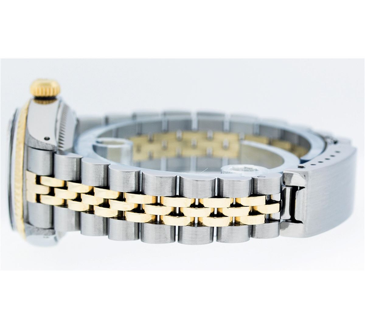 One Ladies Two Tone Rolex Datejust Polished, Serviced & Electronically Tested, 14K Yellow Gold & Stainless Steel Case:26mm, 14K Yellow Gold Crown, Bezel: 14K Yellow Gold Fluted Bezel. Custom Crystal: Acrylic Cyclops Lens. Movement: Automatic Winding Movement Caliber 2030. Dial: Champagne Index With Luminescent Dots. Date Window: 3 O'Clock Position Date Display, Model: Datejust. Condition: G-6 Extra Fine. Bracelet: Two Tone 14K Yellow Gold & Stainless Steel Jubilee. Bright Polish. 5.5 Inch Length, Adjustable. Standard Clasp, With Rolex Logo. Comes with a 6 month warranty card.